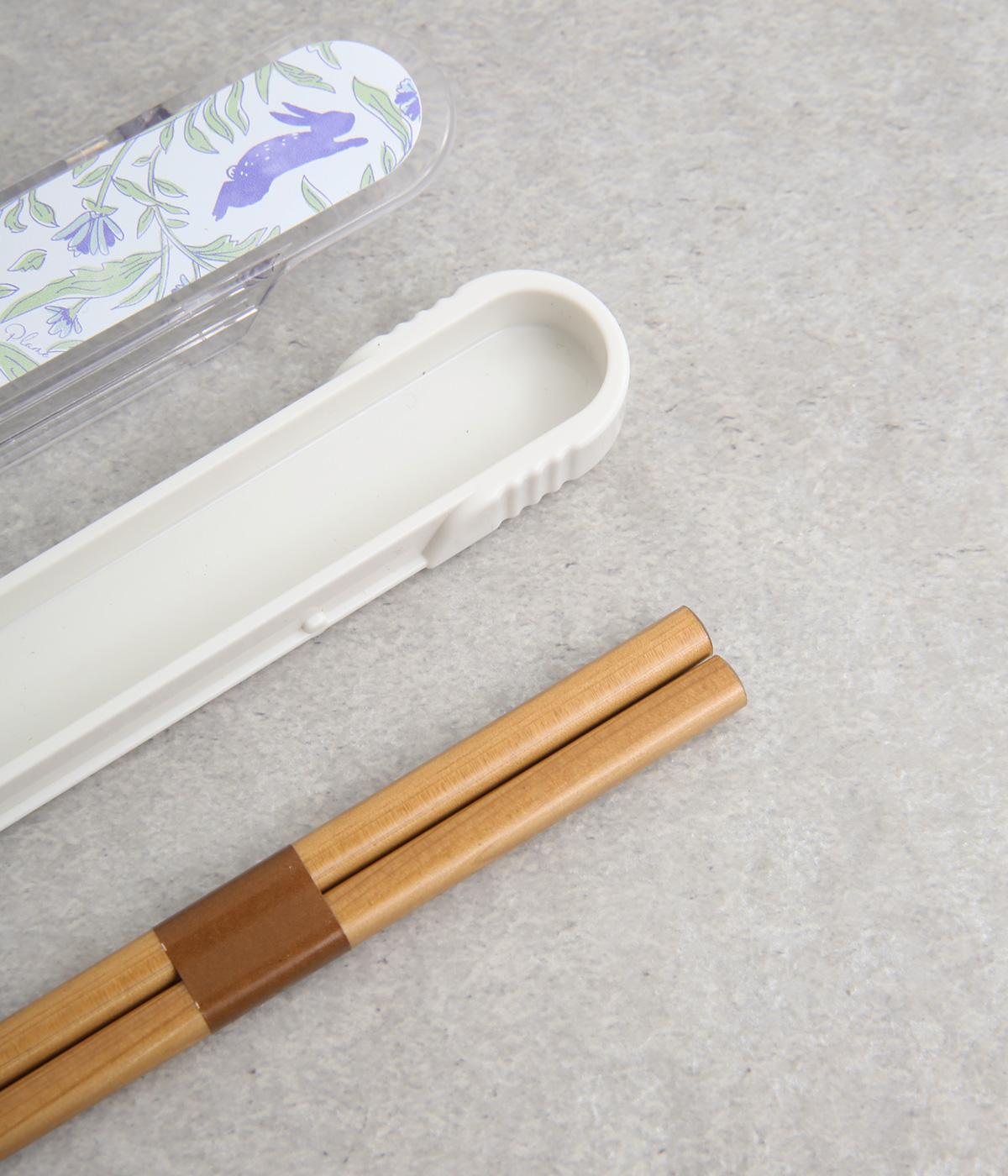 耐熱や耐冷機能をもった樹脂製のケース付きお箸。お箸は木調のぬくもりを感じ、食洗機にも対応可能な素材を使用しています。