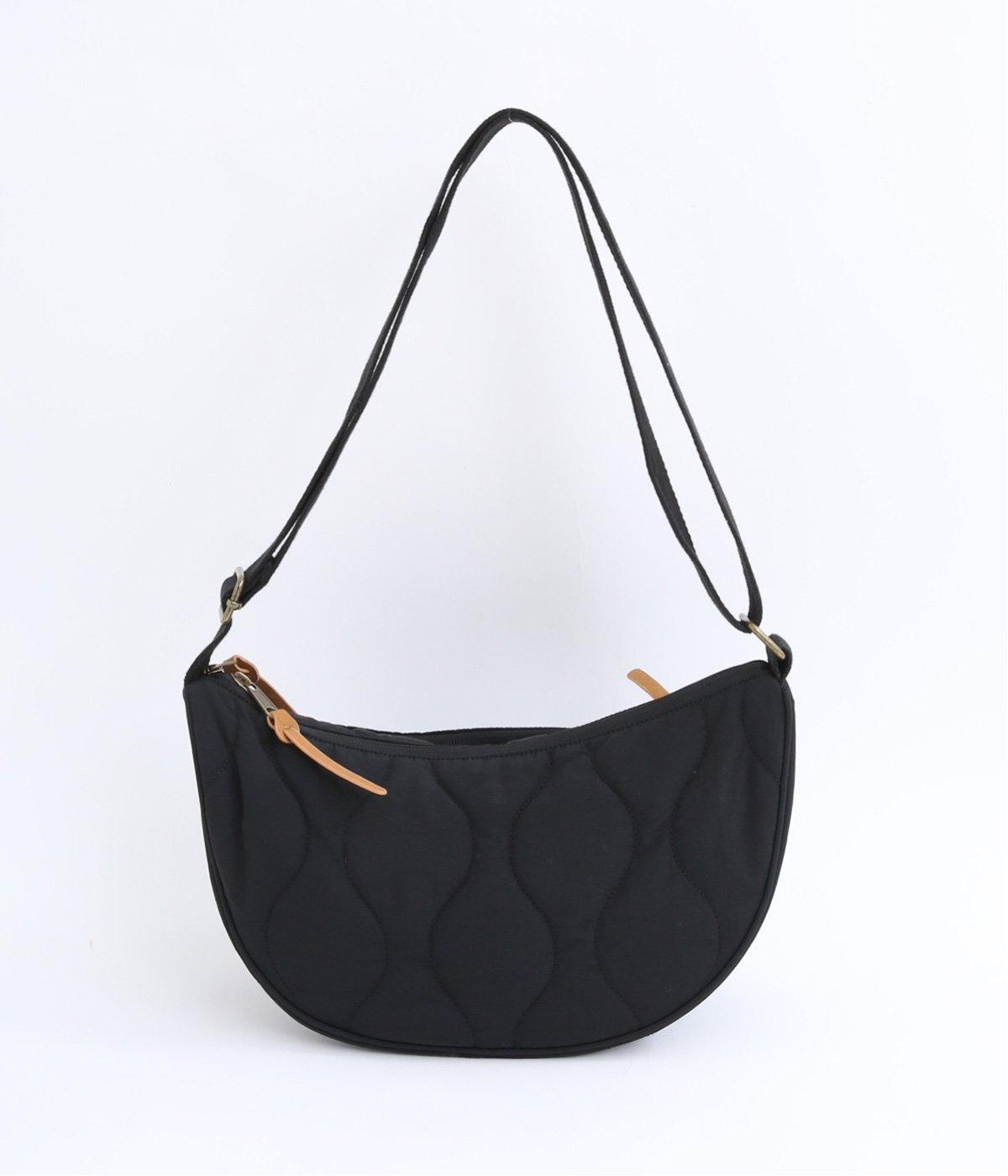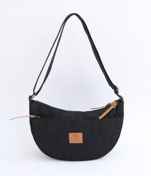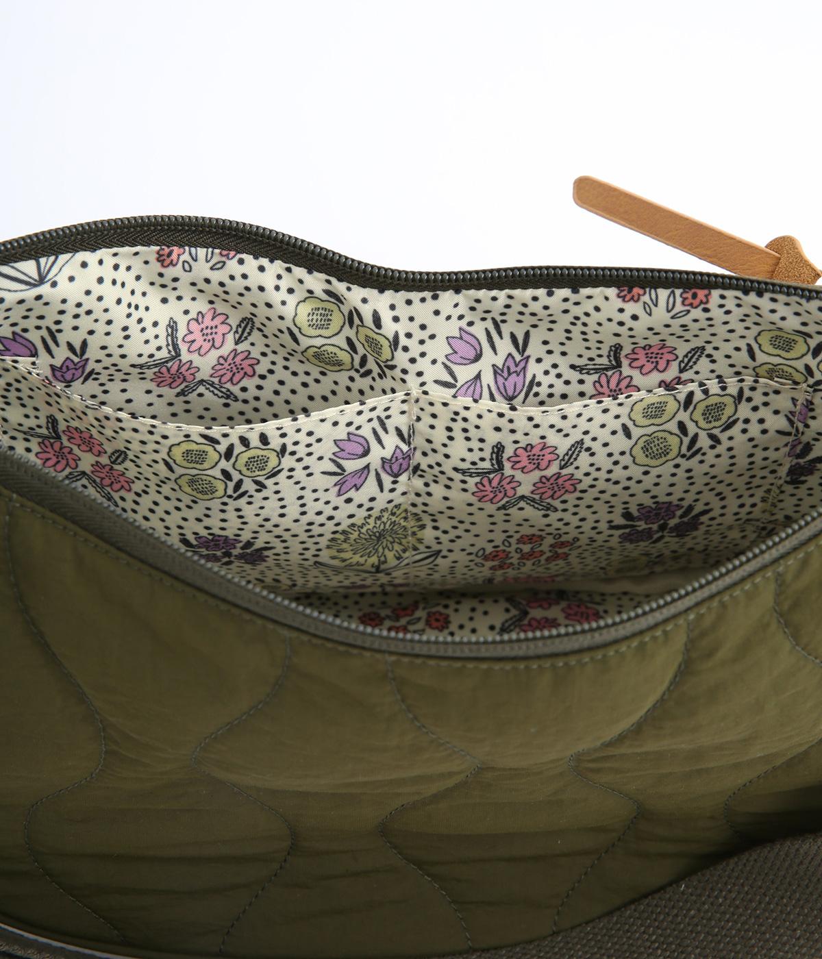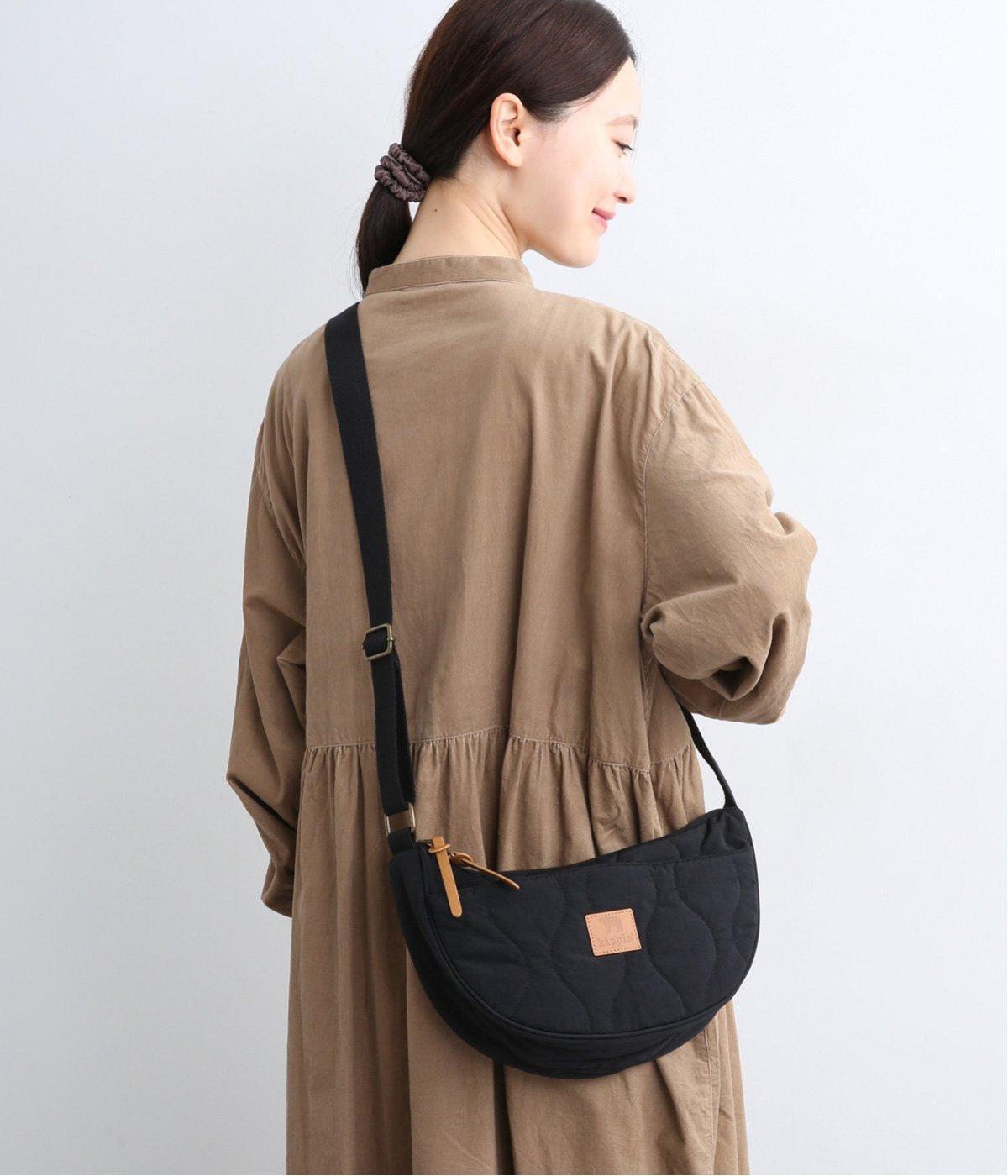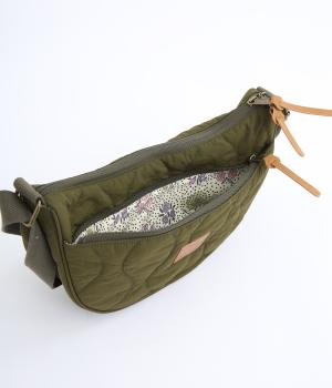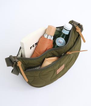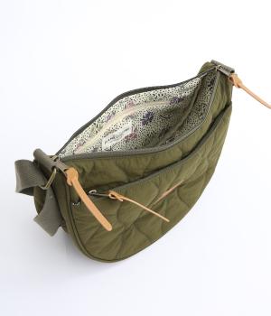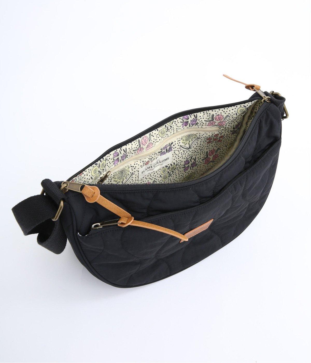体になじみやすい半月型のショルダーバッグ。ななめ掛けも肩掛けもしやすく、ちょっとしたお出掛けに使いやすいサイズ感。可愛らしい花柄のライナーがポイントで、ファスナーをあけるたびに気分の高まるデザインです。