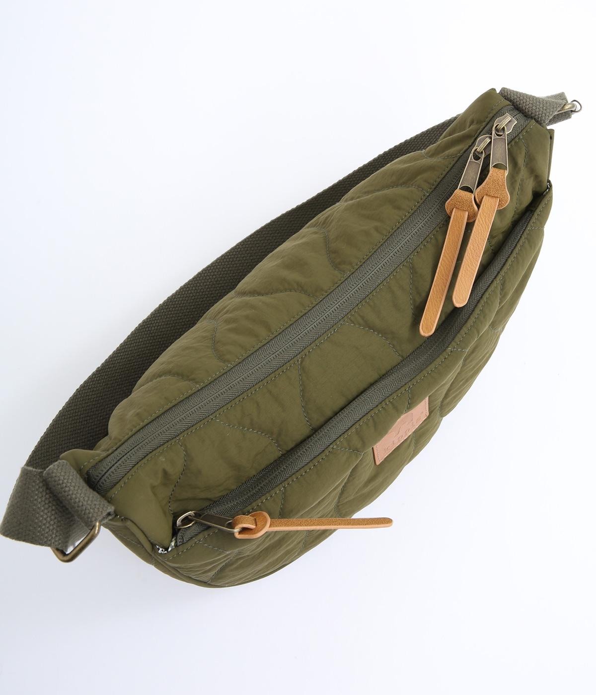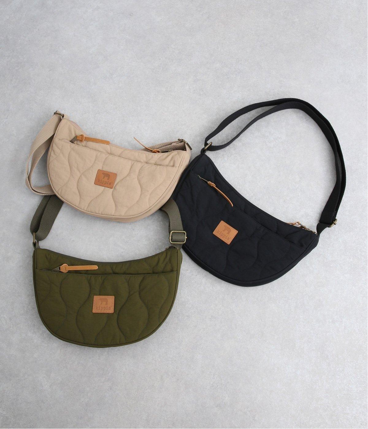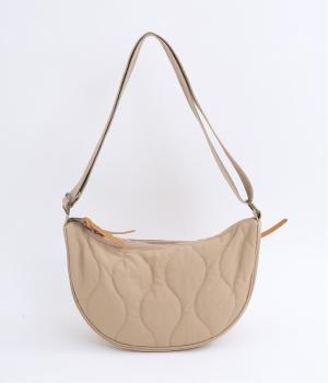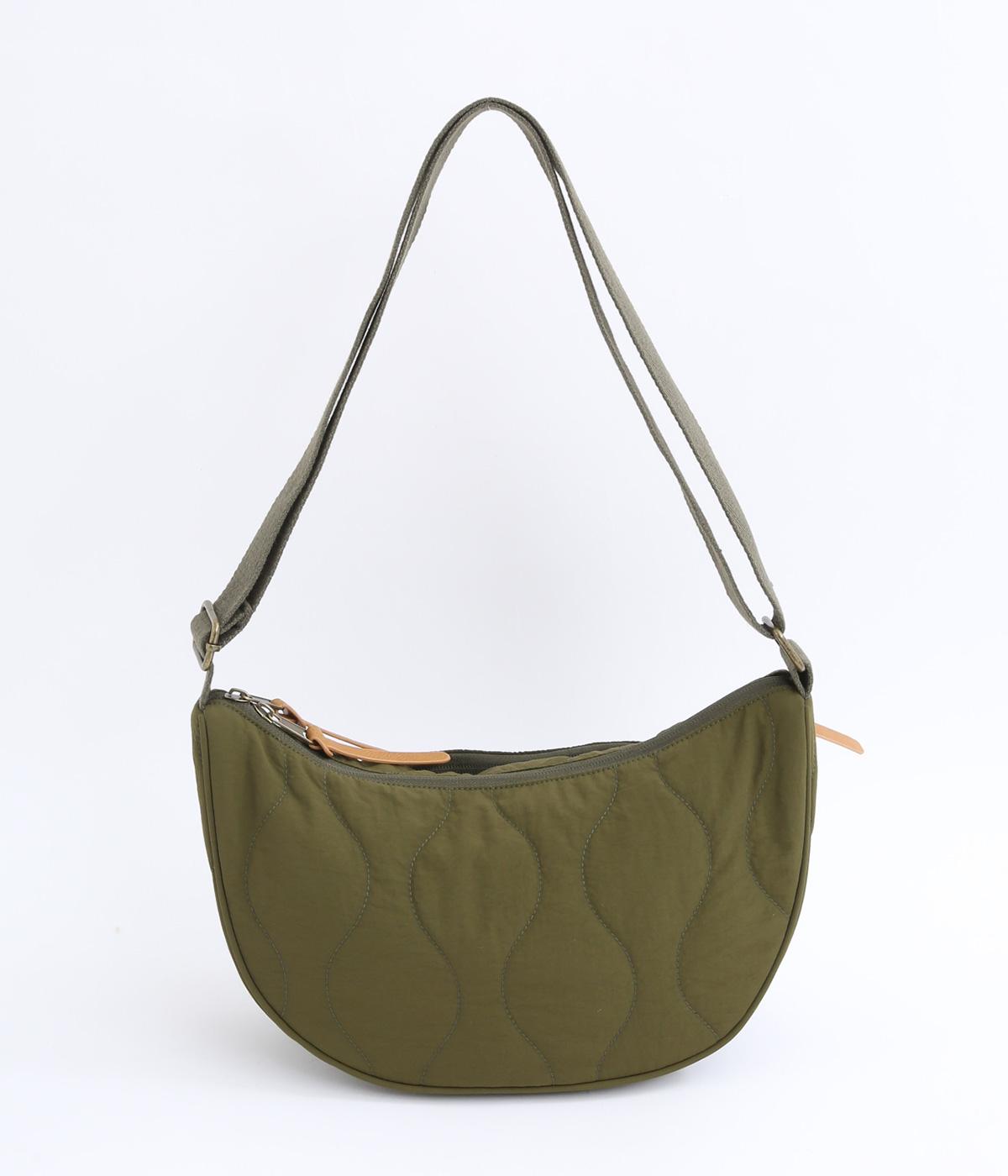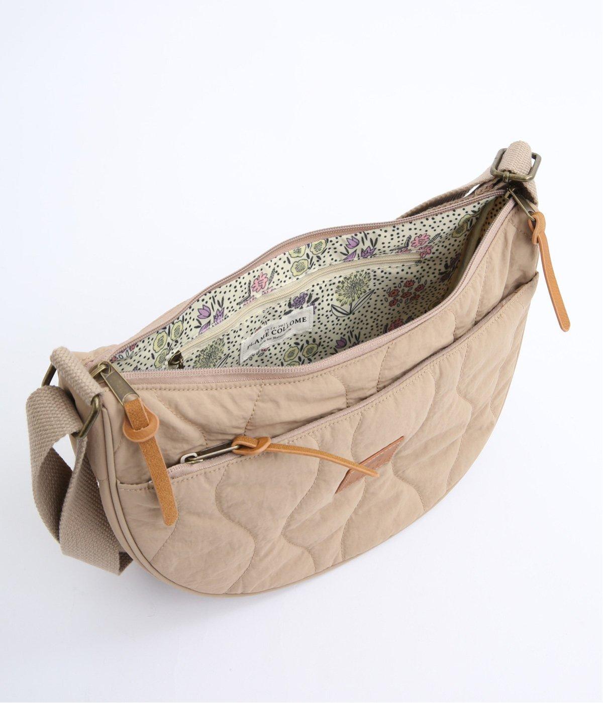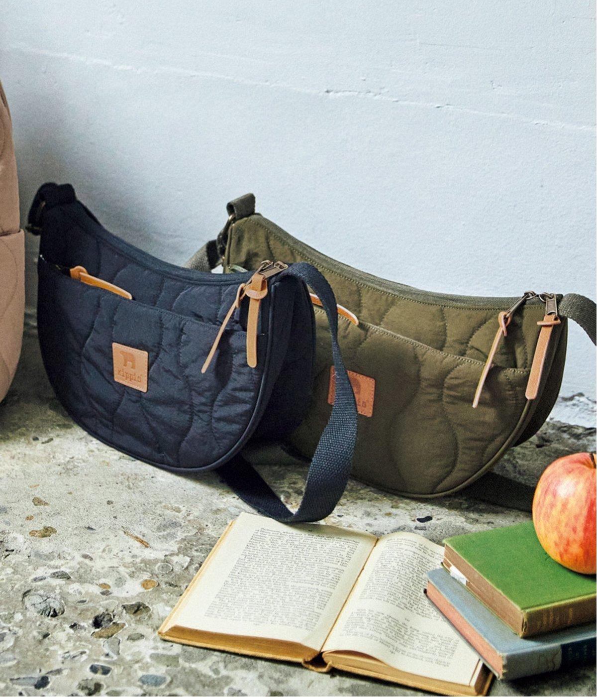体になじみやすい半月型のショルダーバッグ。ななめ掛けも肩掛けもしやすく、ちょっとしたお出掛けに使いやすいサイズ感。可愛らしい花柄のライナーがポイントで、ファスナーをあけるたびに気分の高まるデザインです。