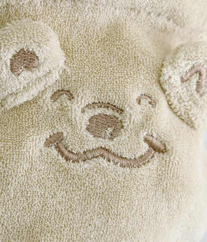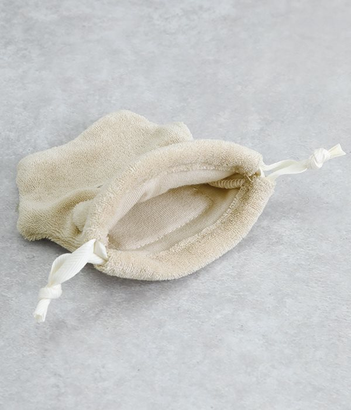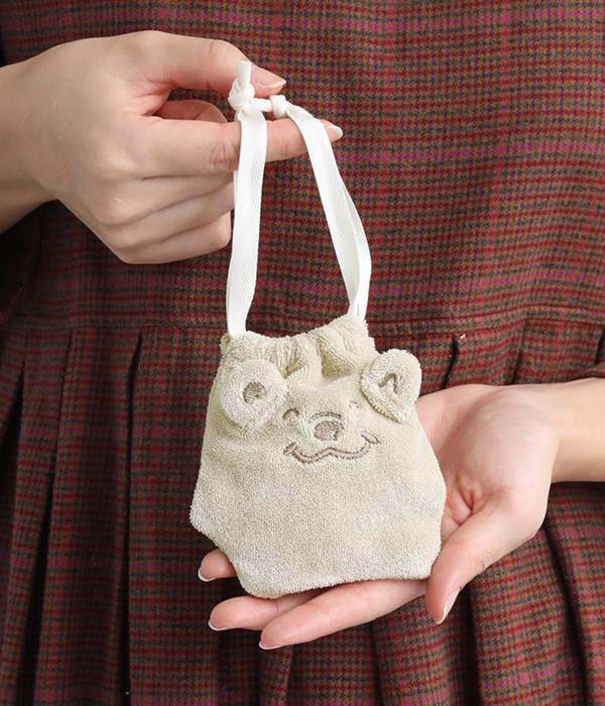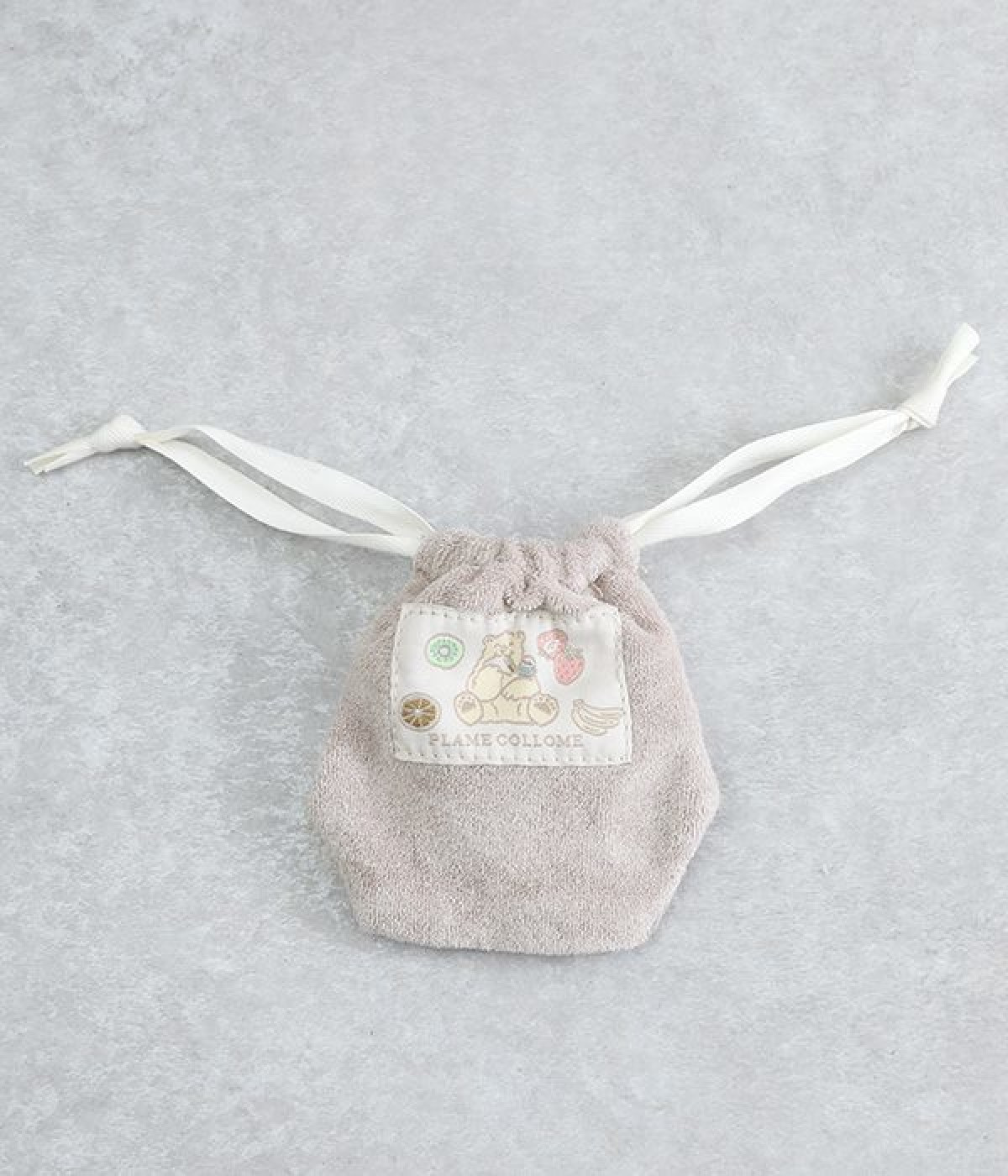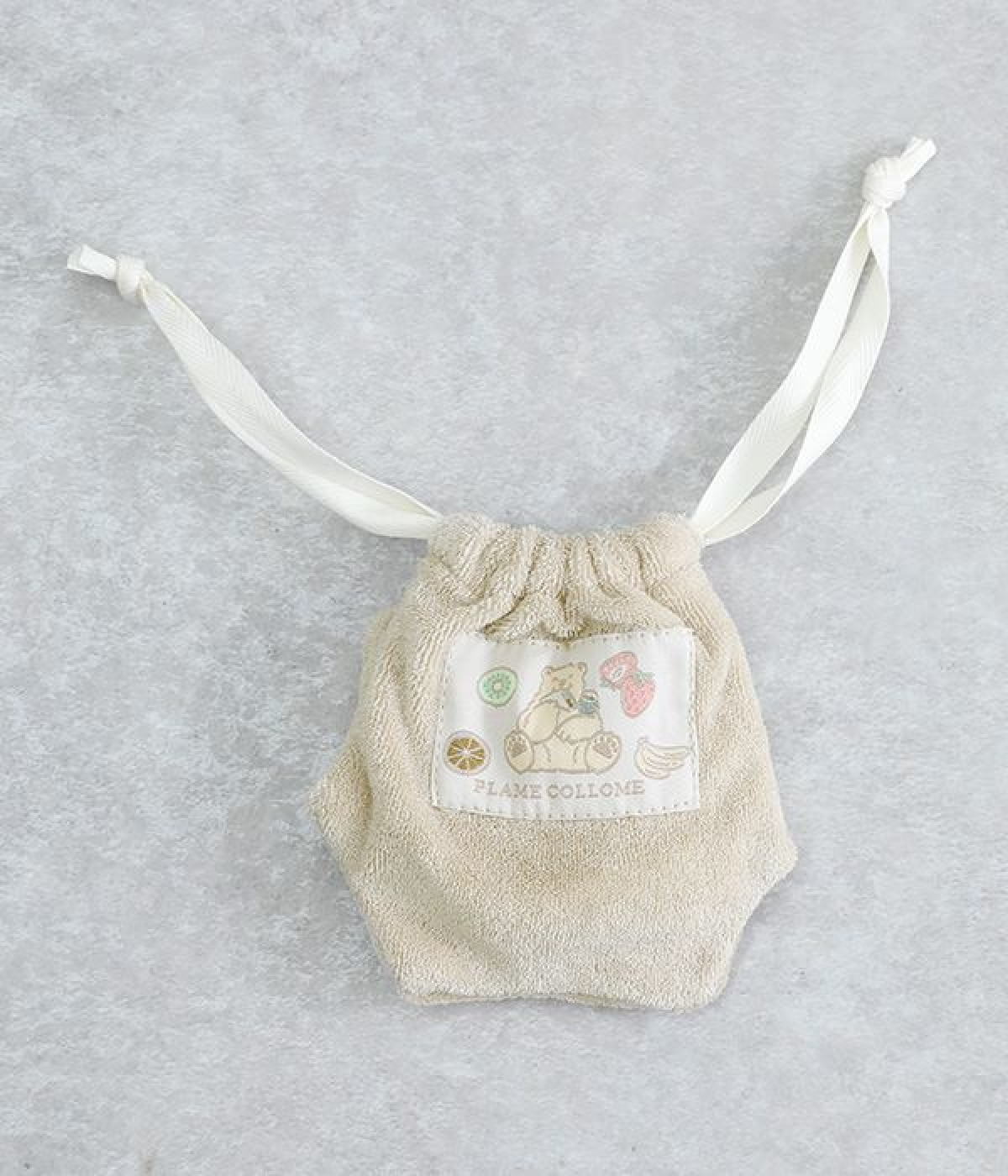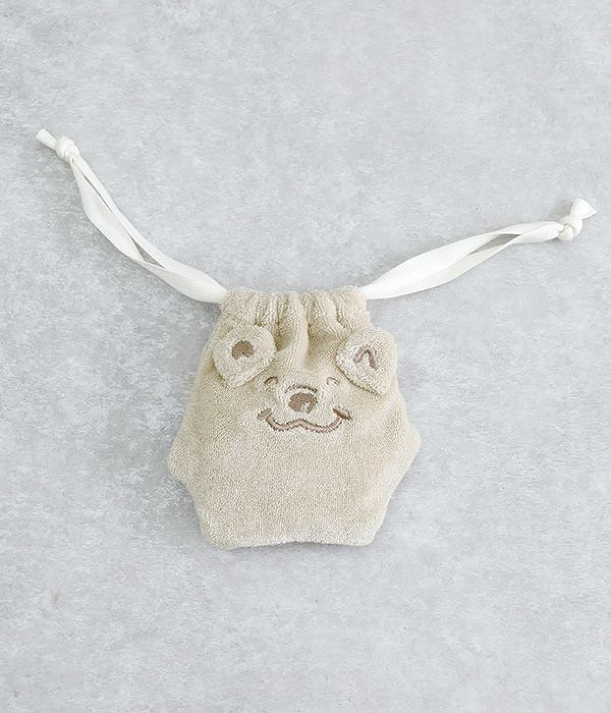 立体のお耳が可愛らしいくまのキャラクター「メルるん♪」モチーフの巾着です。体をかたどったような凹凸ある形もこだわりのひとつ。鍵を入れたりアクセサリーを入れたりと、バッグの中で迷子になりやすい細かなグッズの収納にぴったり。バッグの中にあると気分の上がる巾着で、ちょっとしたギフトにも最適です。