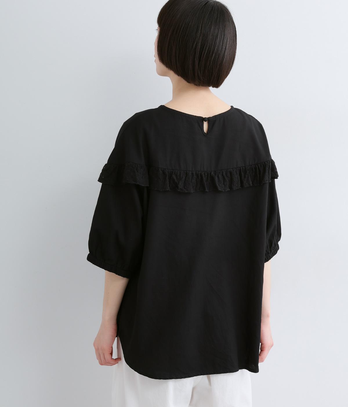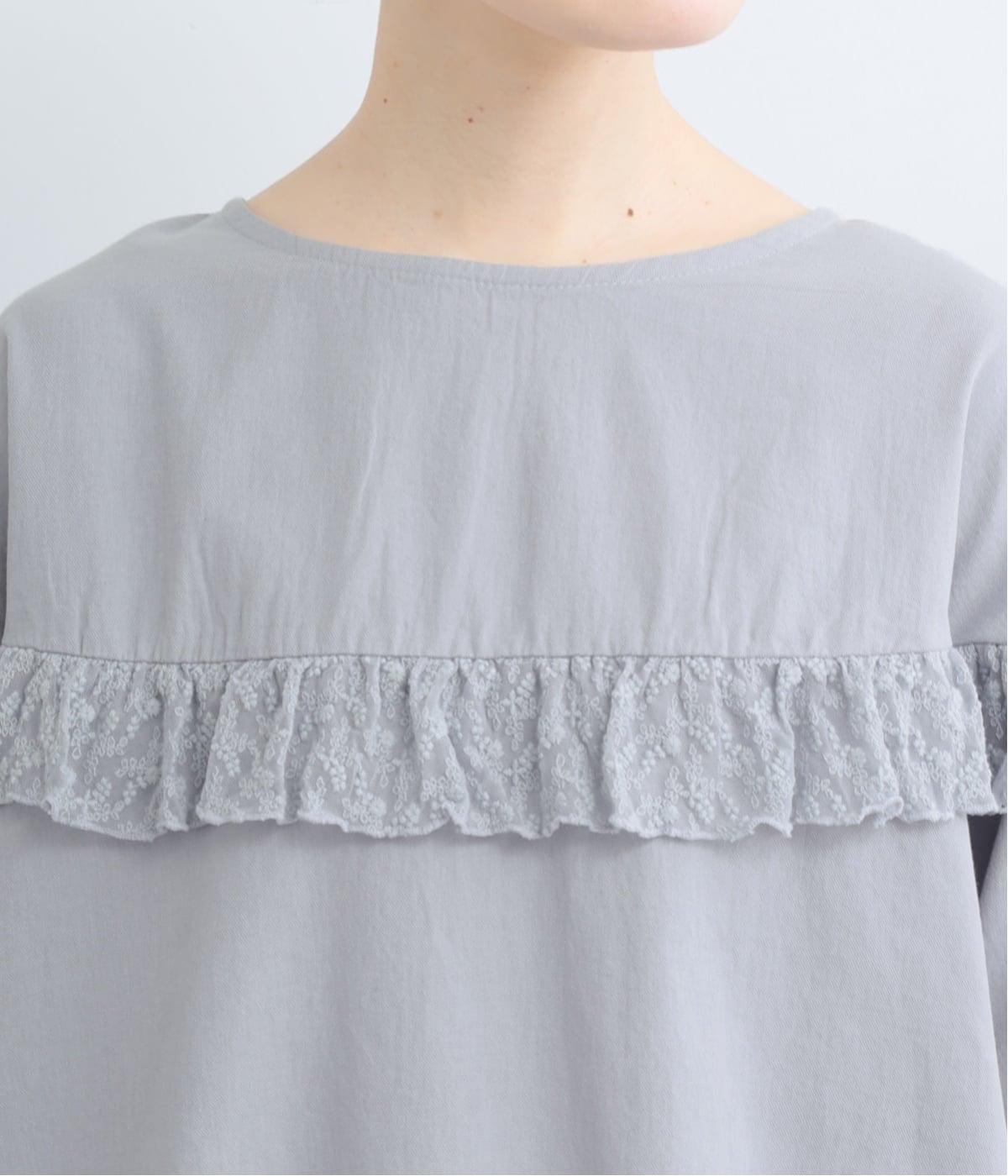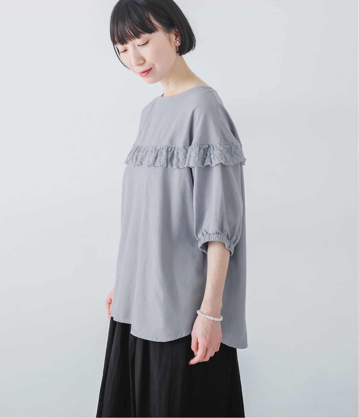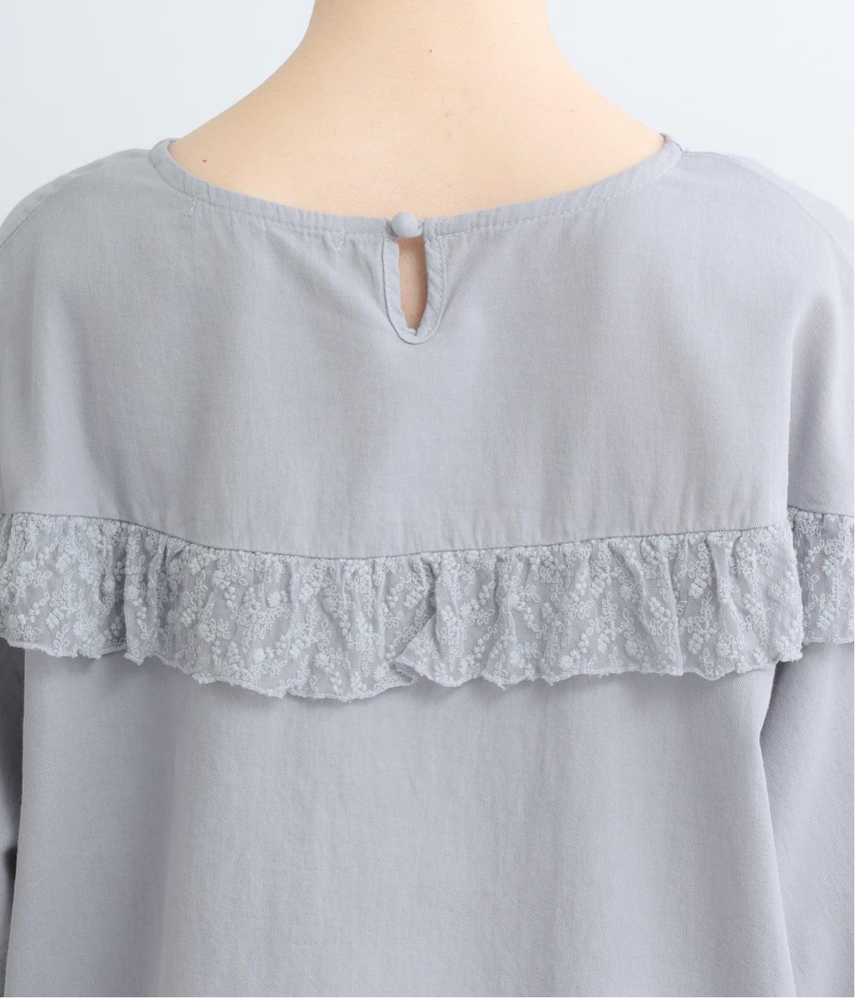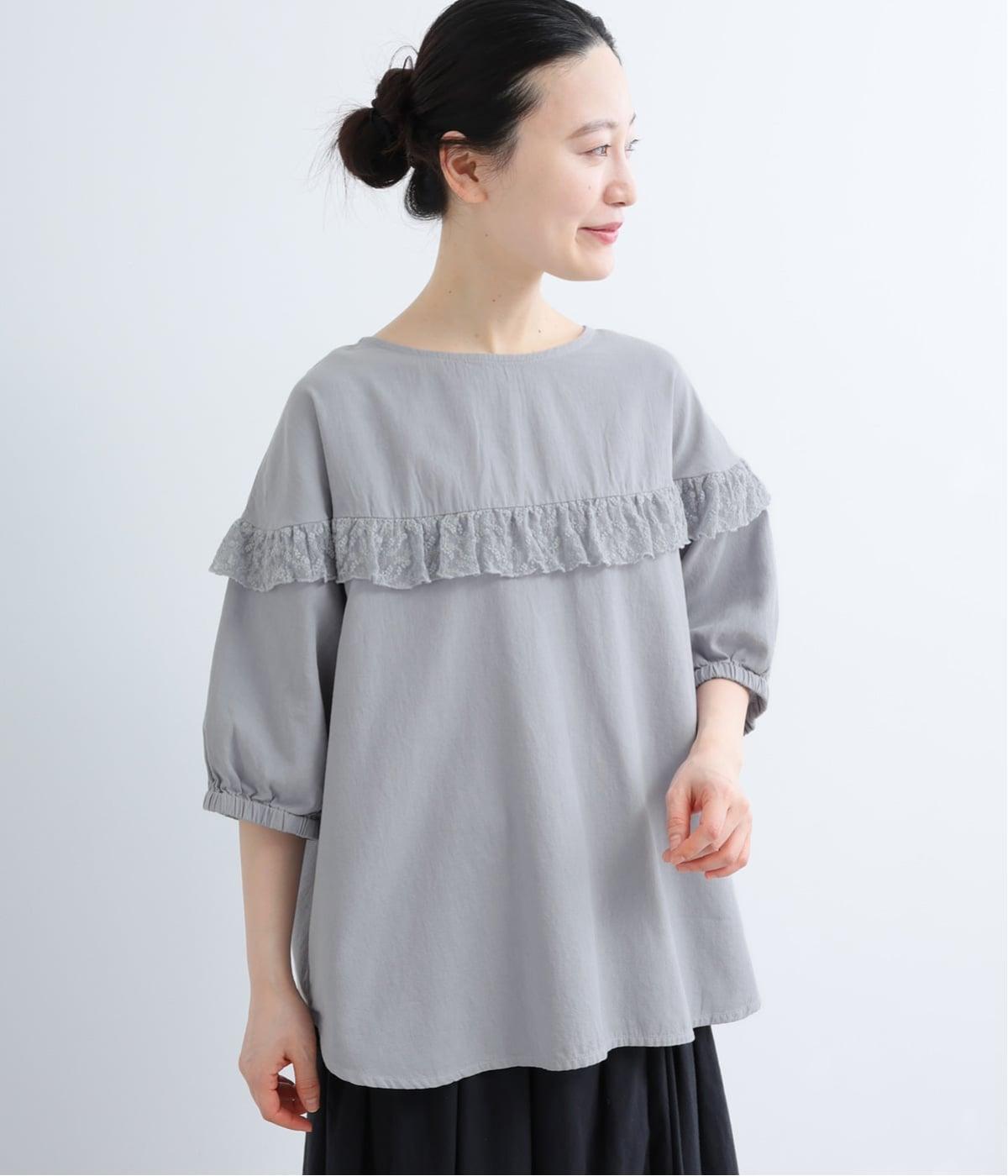 袖口のギャザーと背面の涙あきが、女性らしさを引き立てるデザイン。繊細な花柄の刺繍レースで、上品なアクセントをプラスしています。