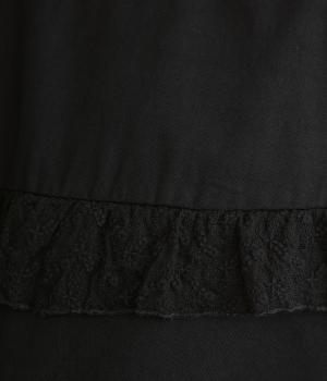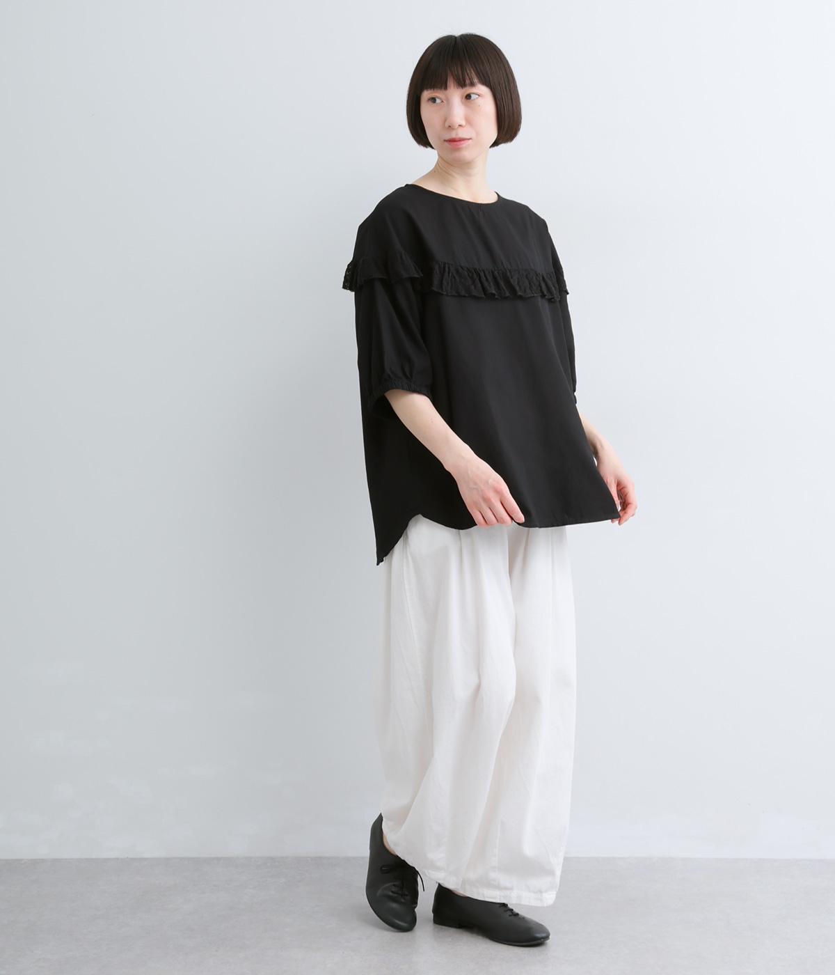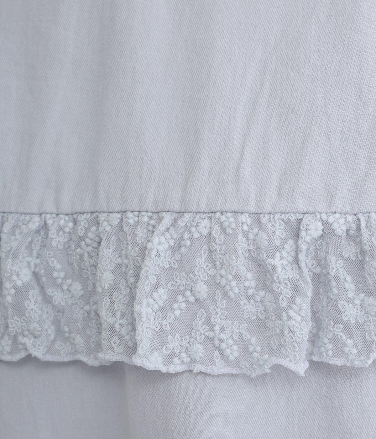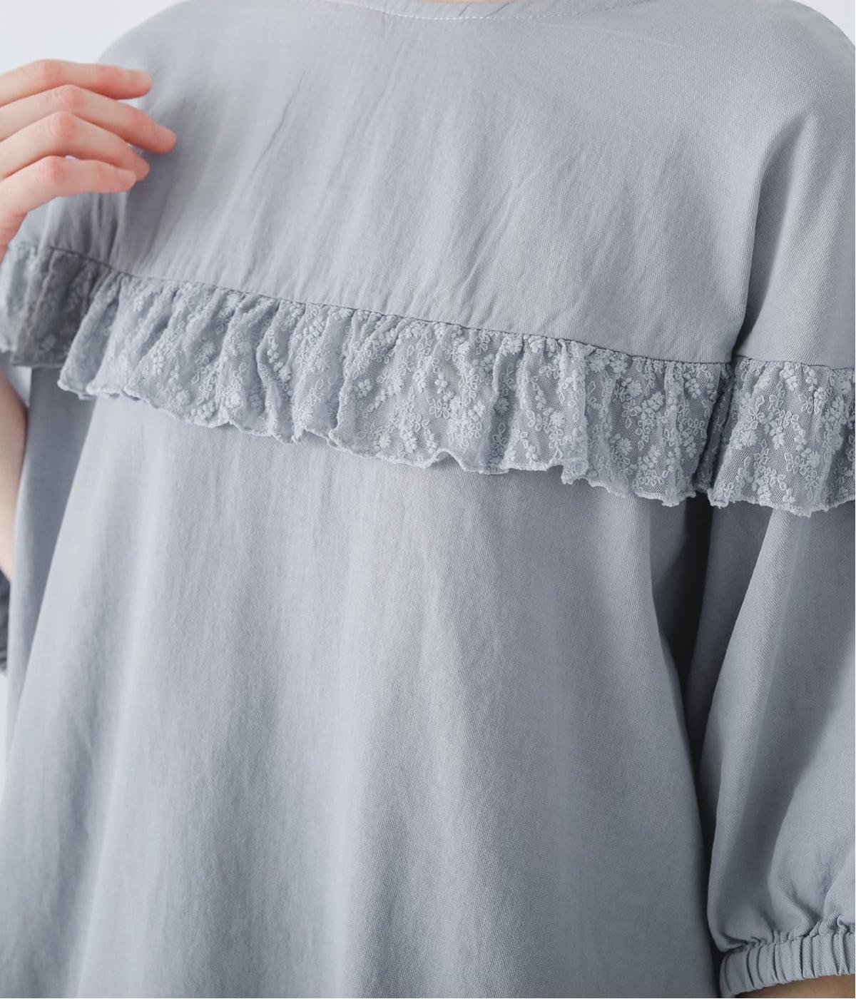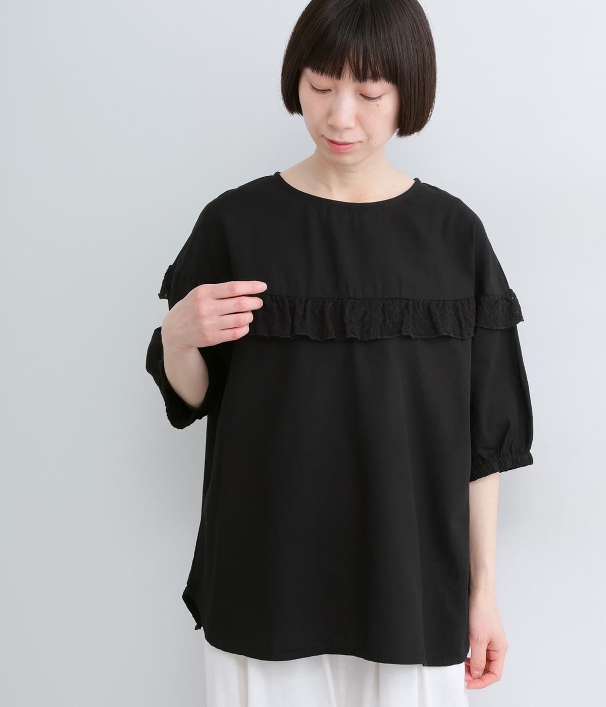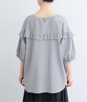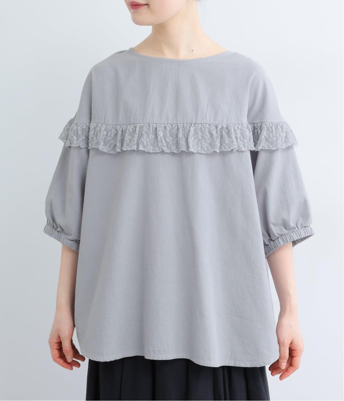袖口のギャザーと背面の涙あきが、女性らしさを引き立てるデザイン。繊細な花柄の刺繍レースで、上品なアクセントをプラスしています。