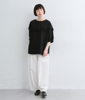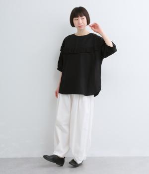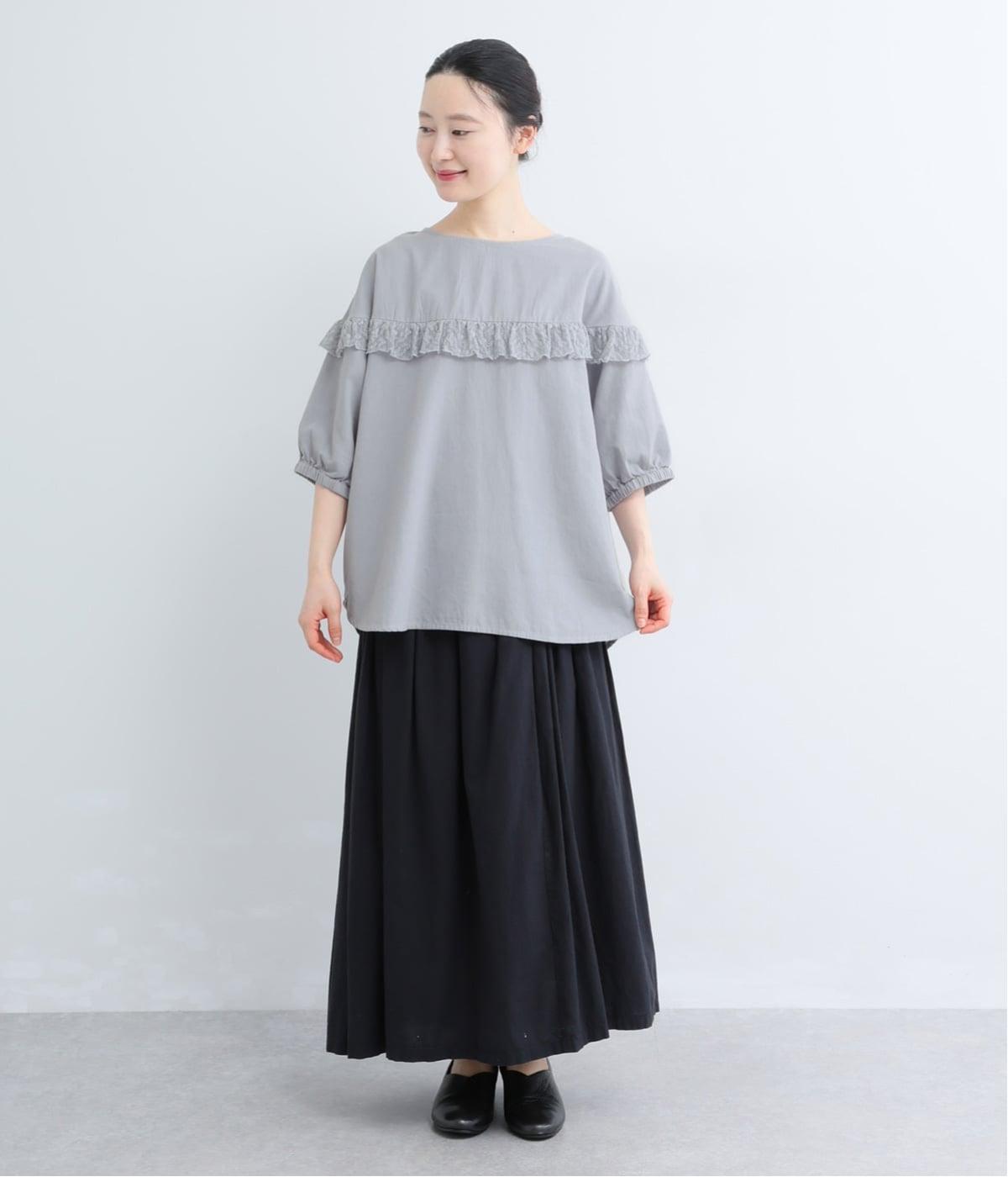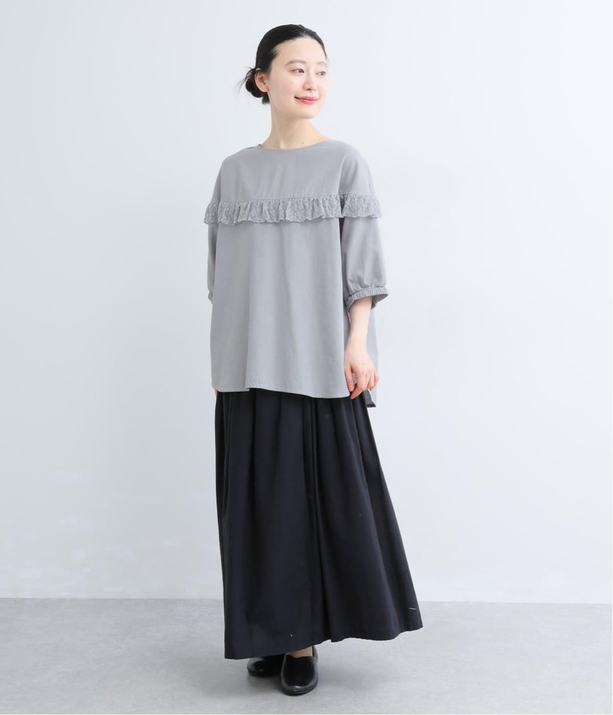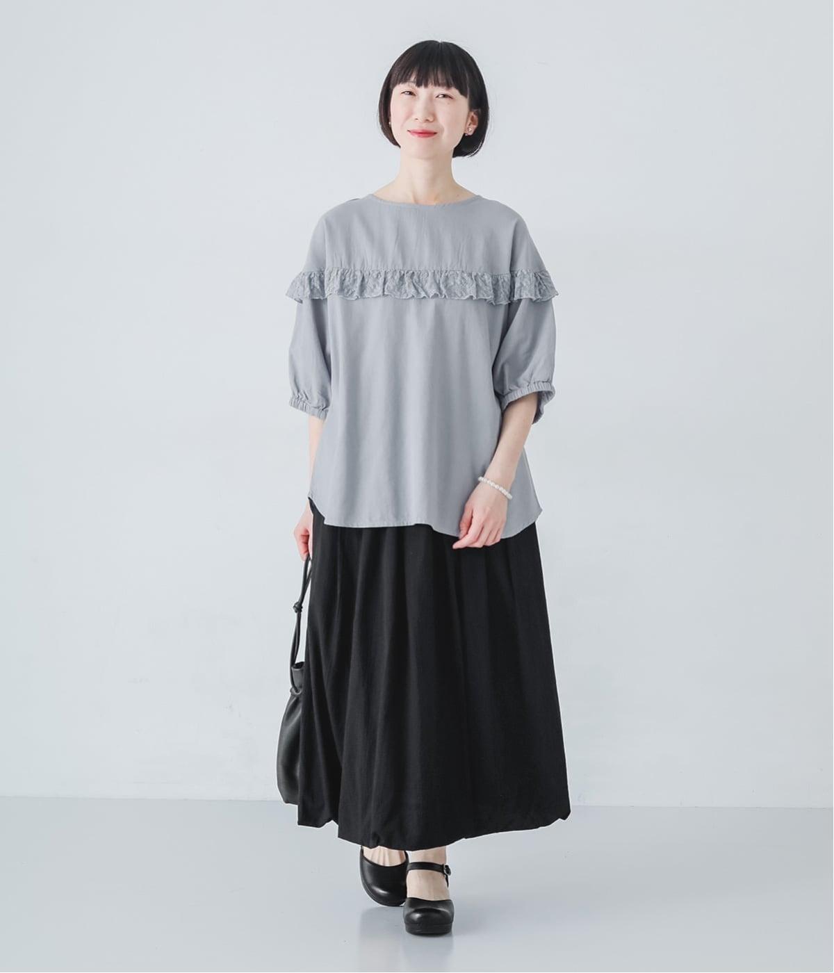 シンプルなブラックのスカートを合わせた、フェミニンなコーディネート。リラックス感のある着心地ながら、きれいめな装いにもマッチします。