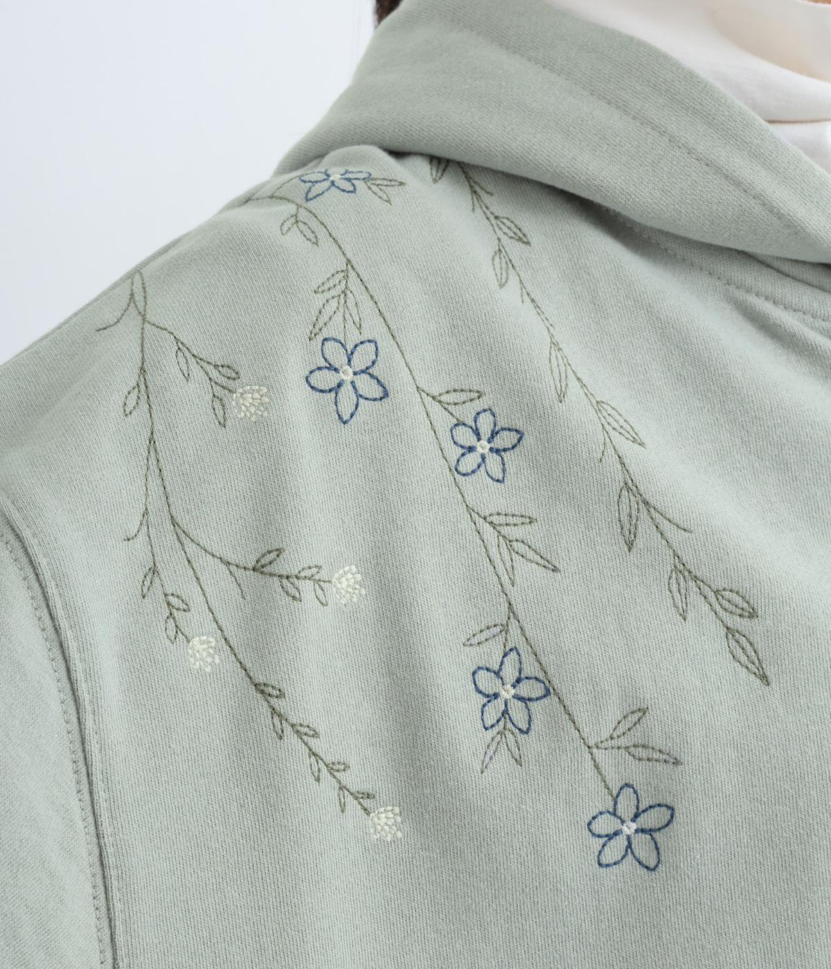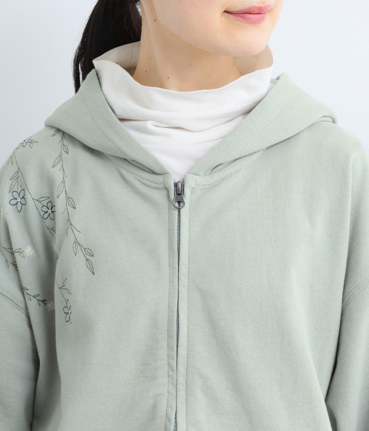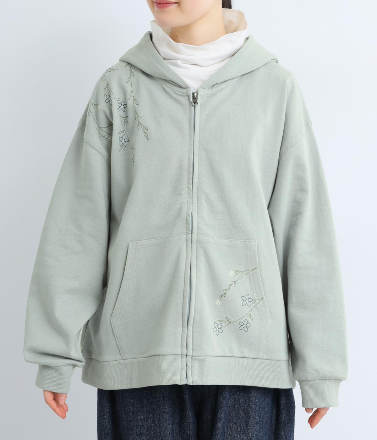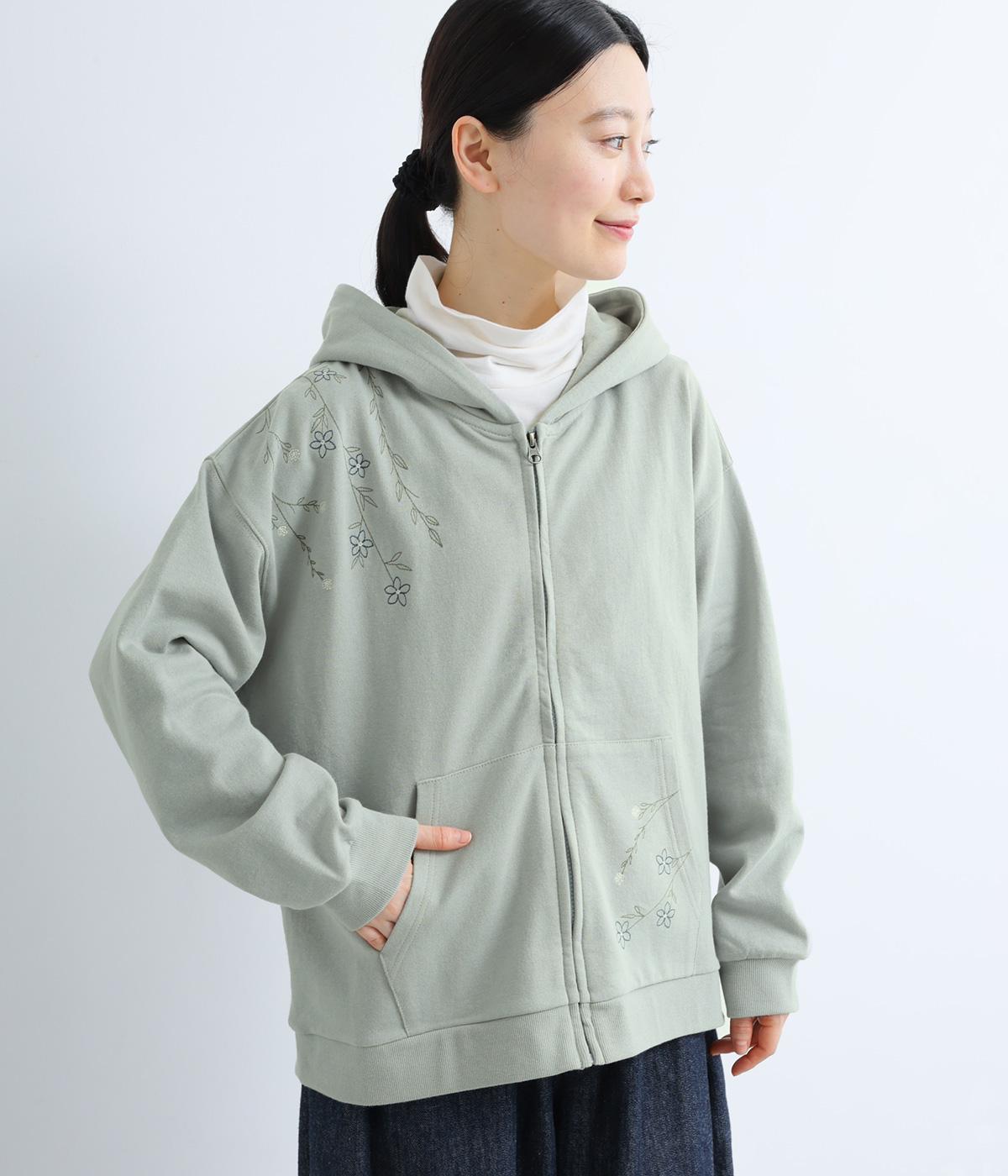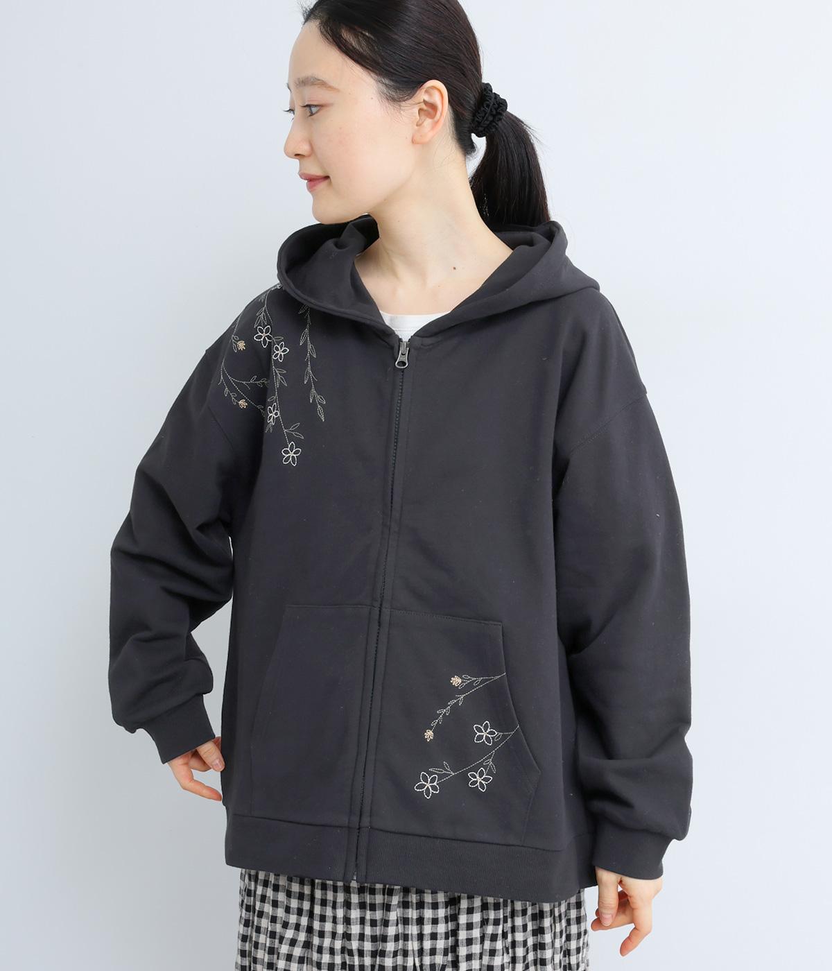 右肩と左裾に、下に流れるような草花刺しゅうをあしらった裏毛パーカー。カジュアルな中にほんのりと女性らしさを添えてくれます。全体にゆとりのあるシルエットがこなれ感を演出。フロントはファスナー仕様でさっと着脱しやすいのもポイントです。