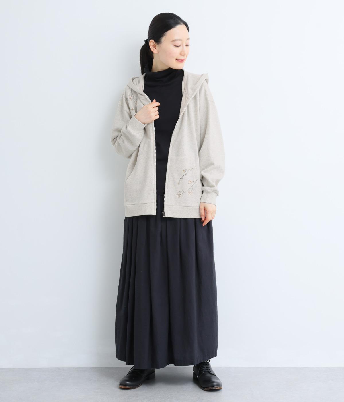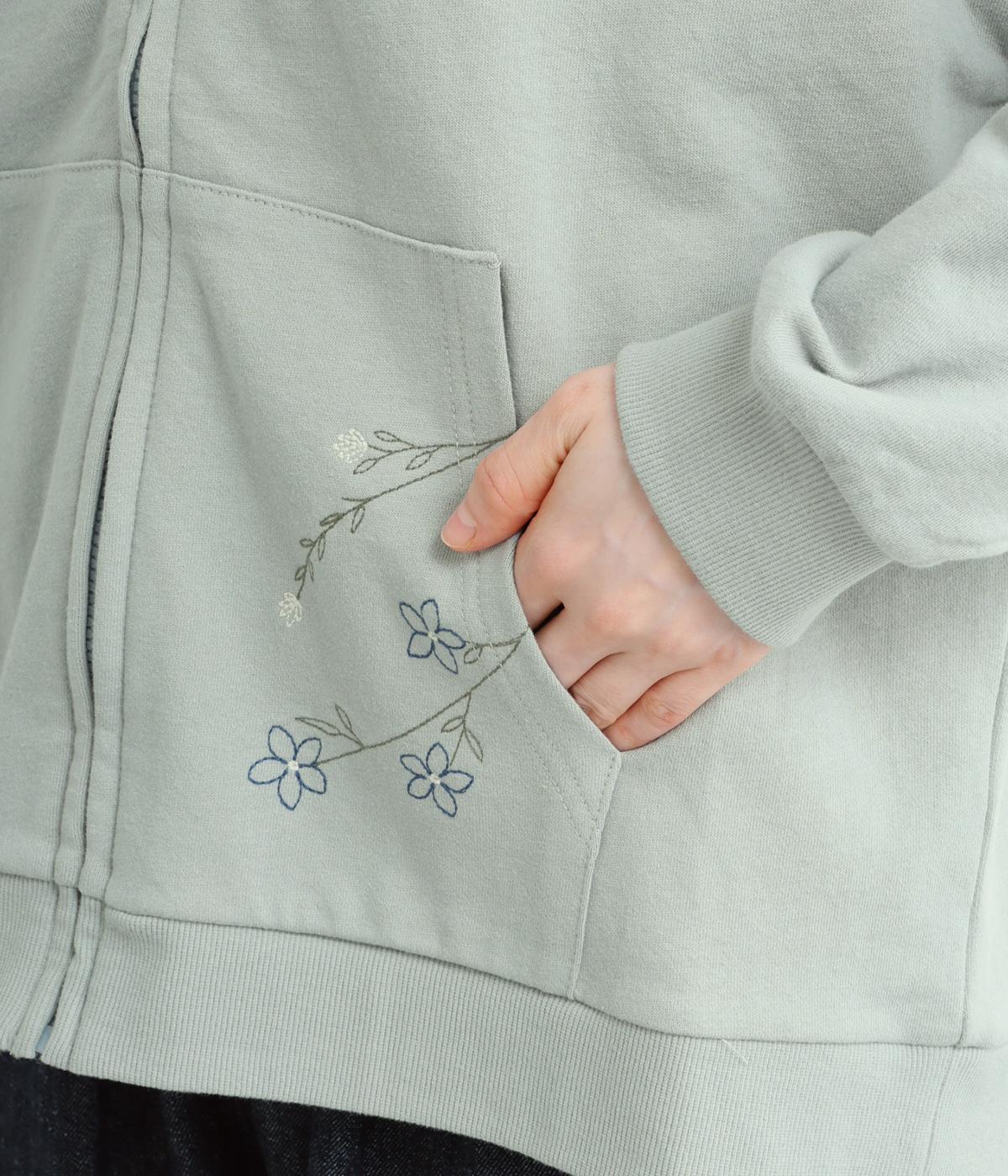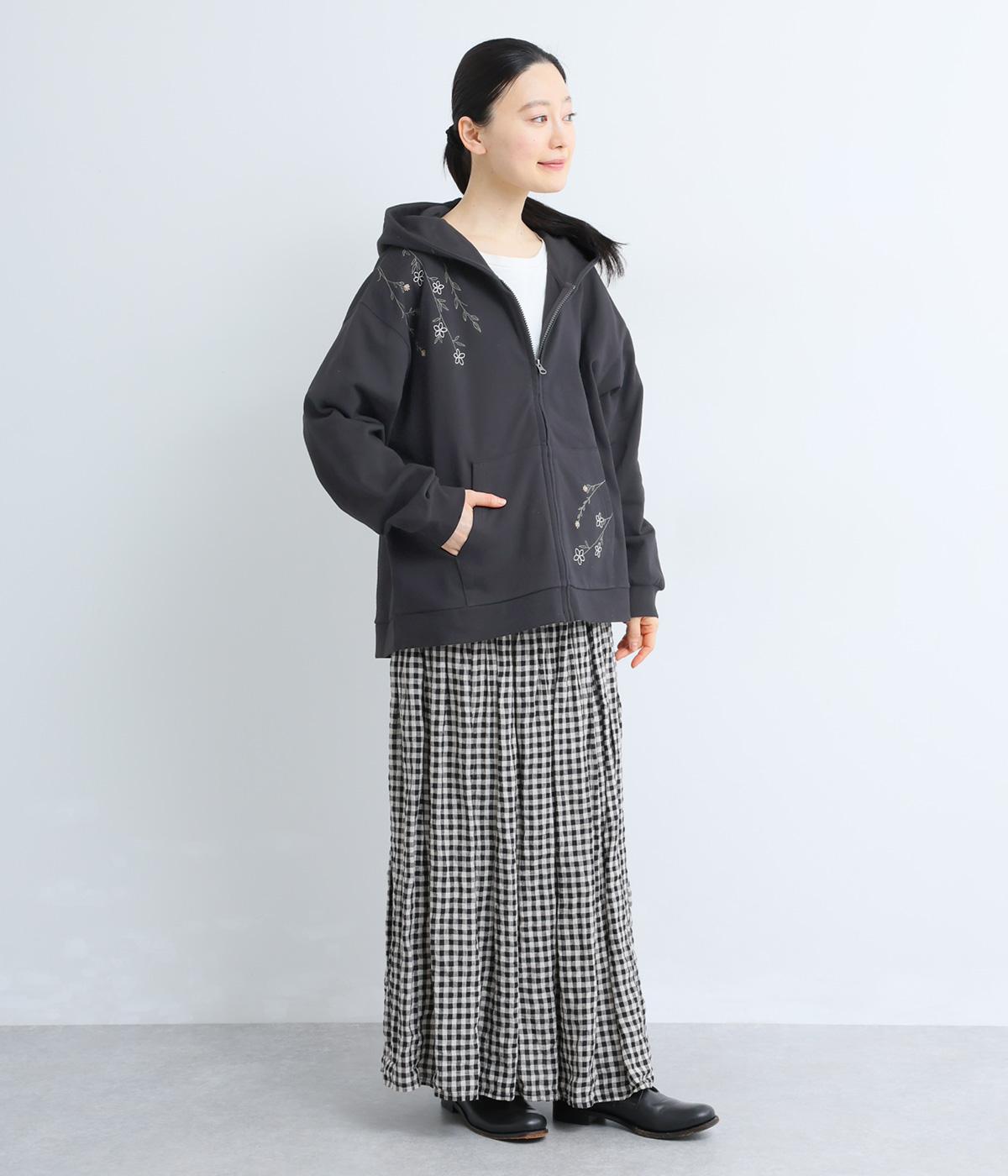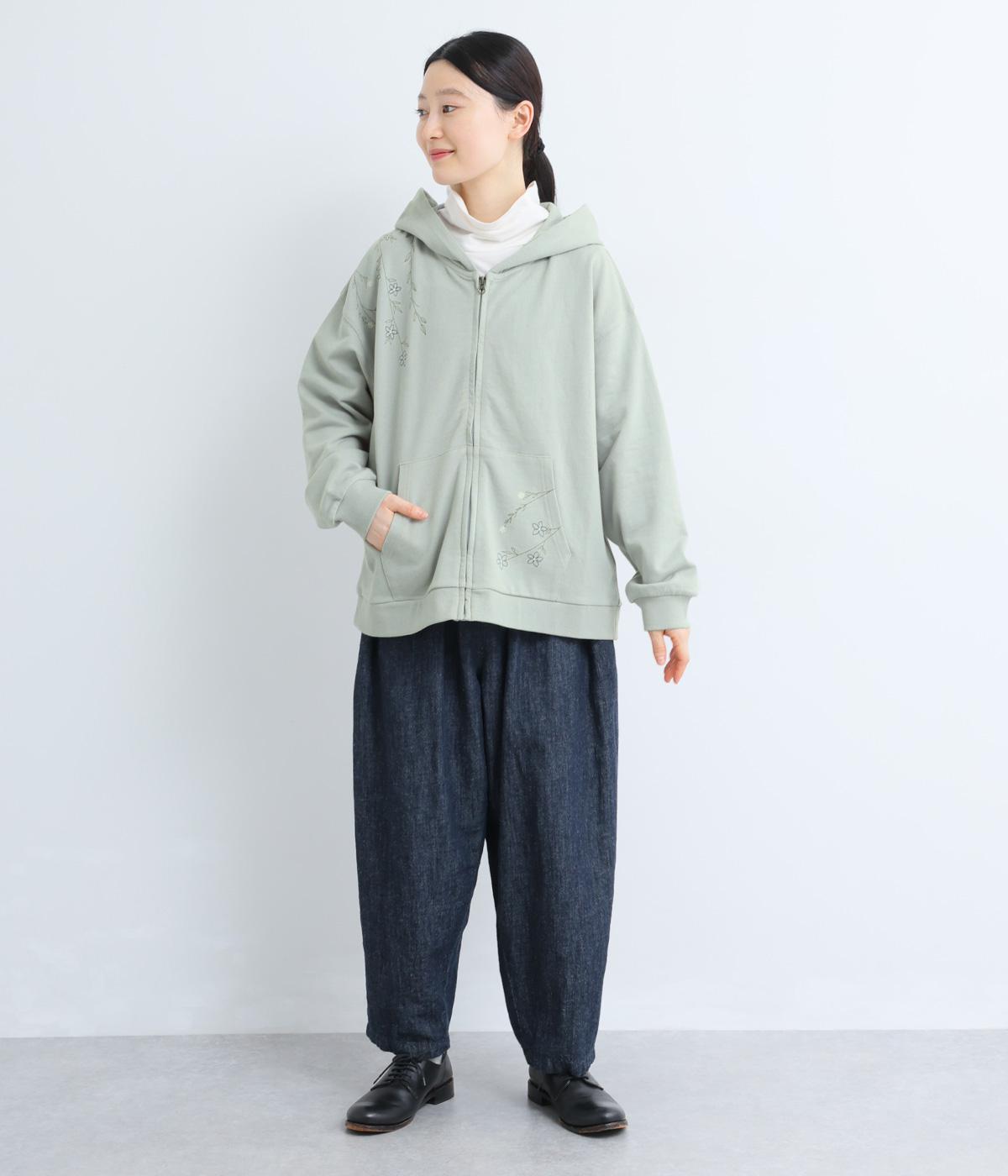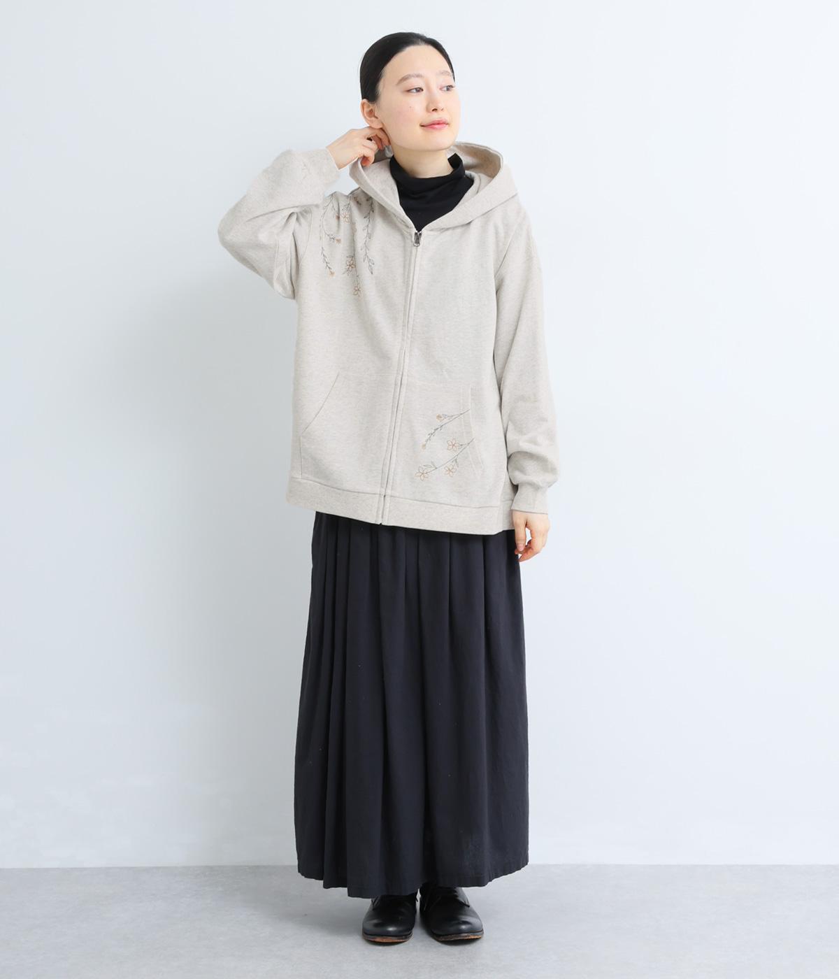 右肩と左裾に、下に流れるような草花刺しゅうをあしらった裏毛パーカー。カジュアルな中にほんのりと女性らしさを添えてくれます。全体にゆとりのあるシルエットがこなれ感を演出。フロントはファスナー仕様でさっと着脱しやすいのもポイントです。