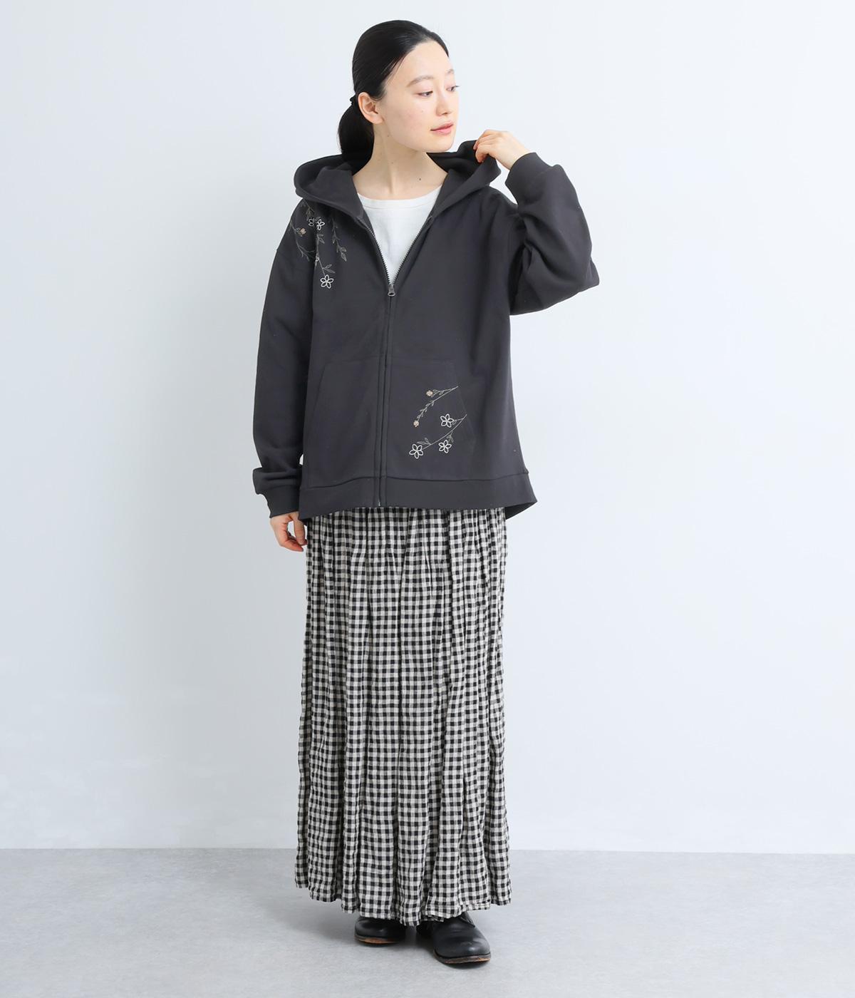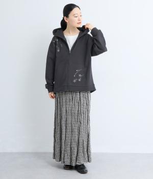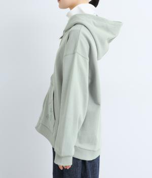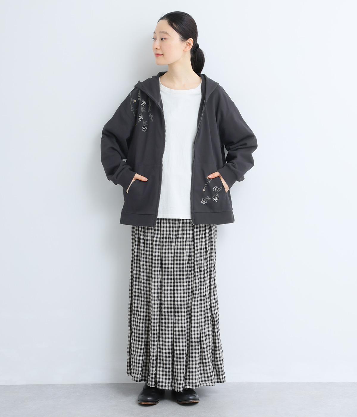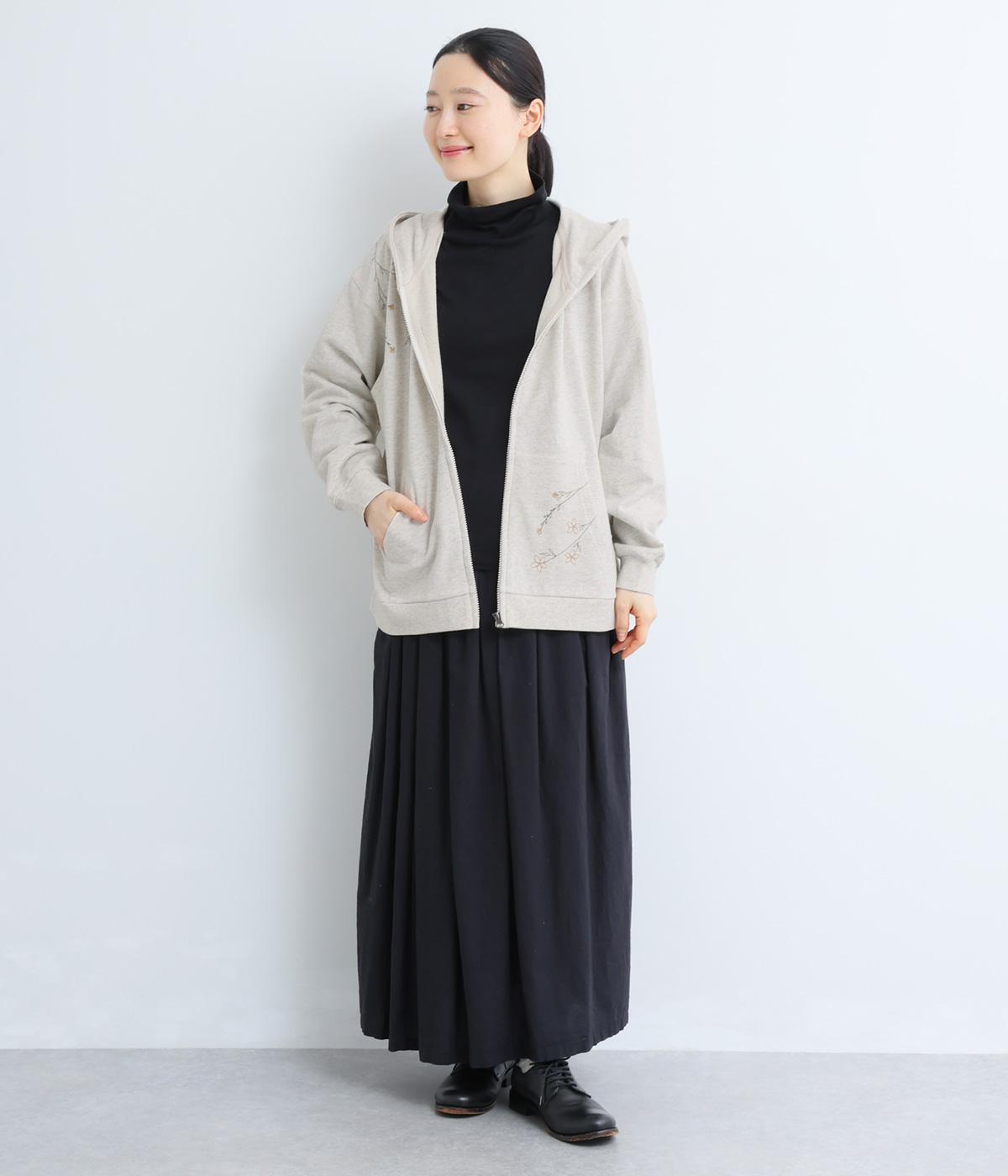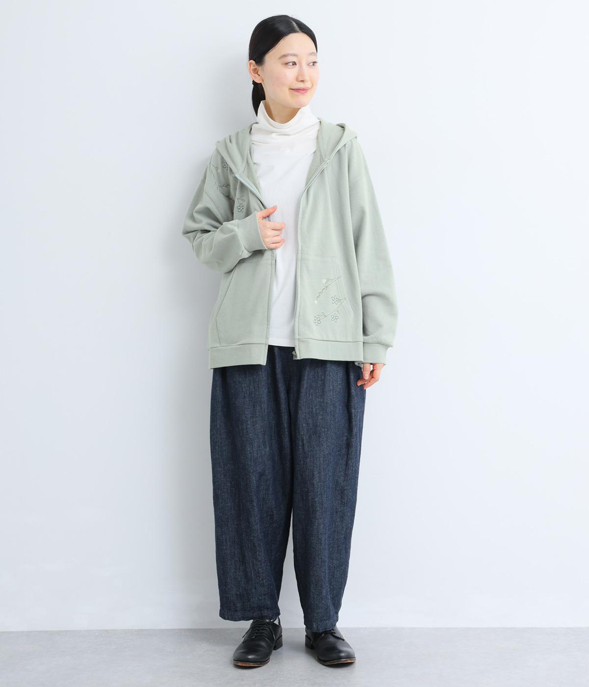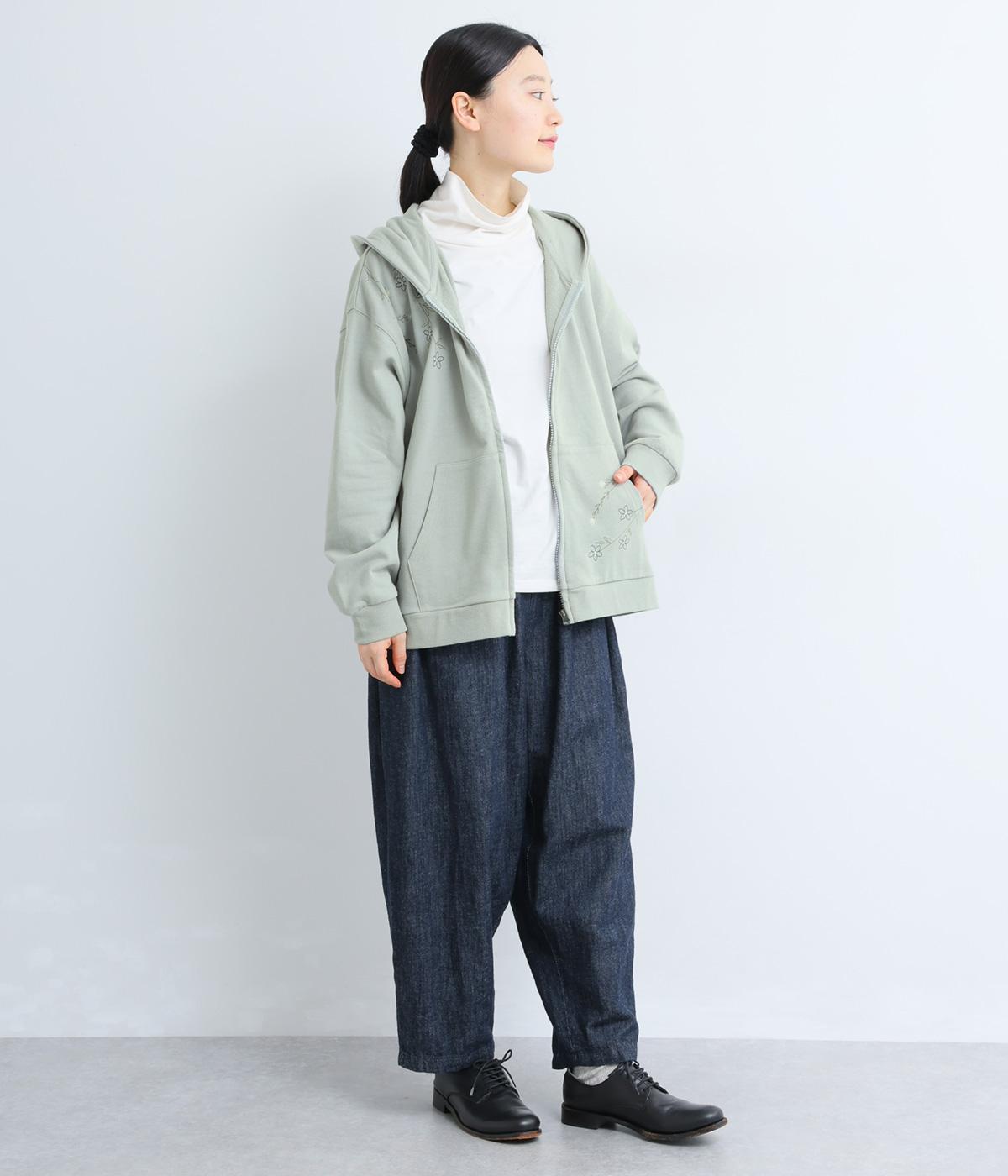 右肩と左裾に、下に流れるような草花刺しゅうをあしらった裏毛パーカー。カジュアルな中にほんのりと女性らしさを添えてくれます。全体にゆとりのあるシルエットがこなれ感を演出。フロントはファスナー仕様でさっと着脱しやすいのもポイントです。