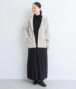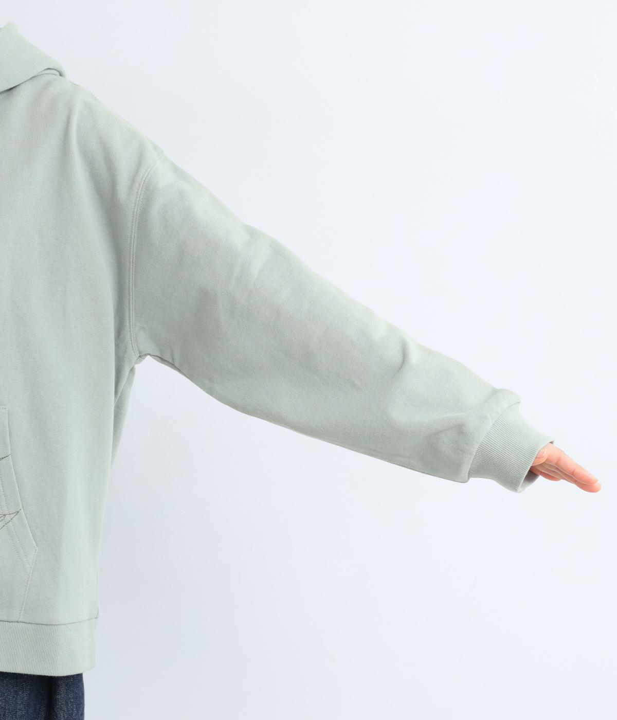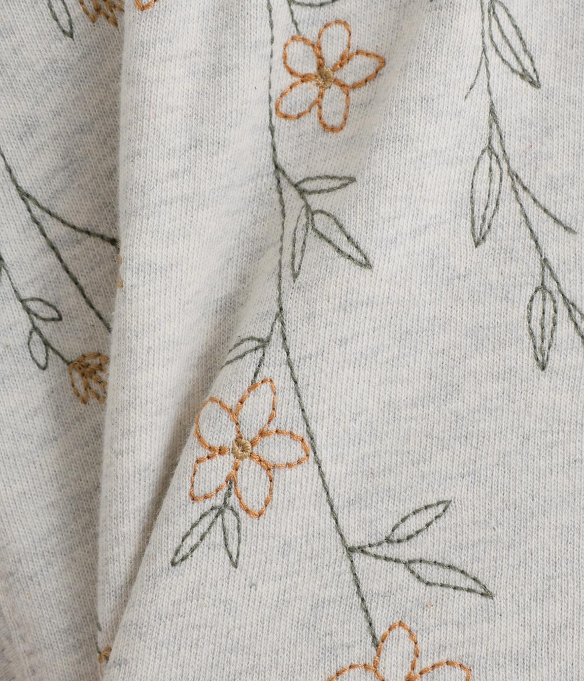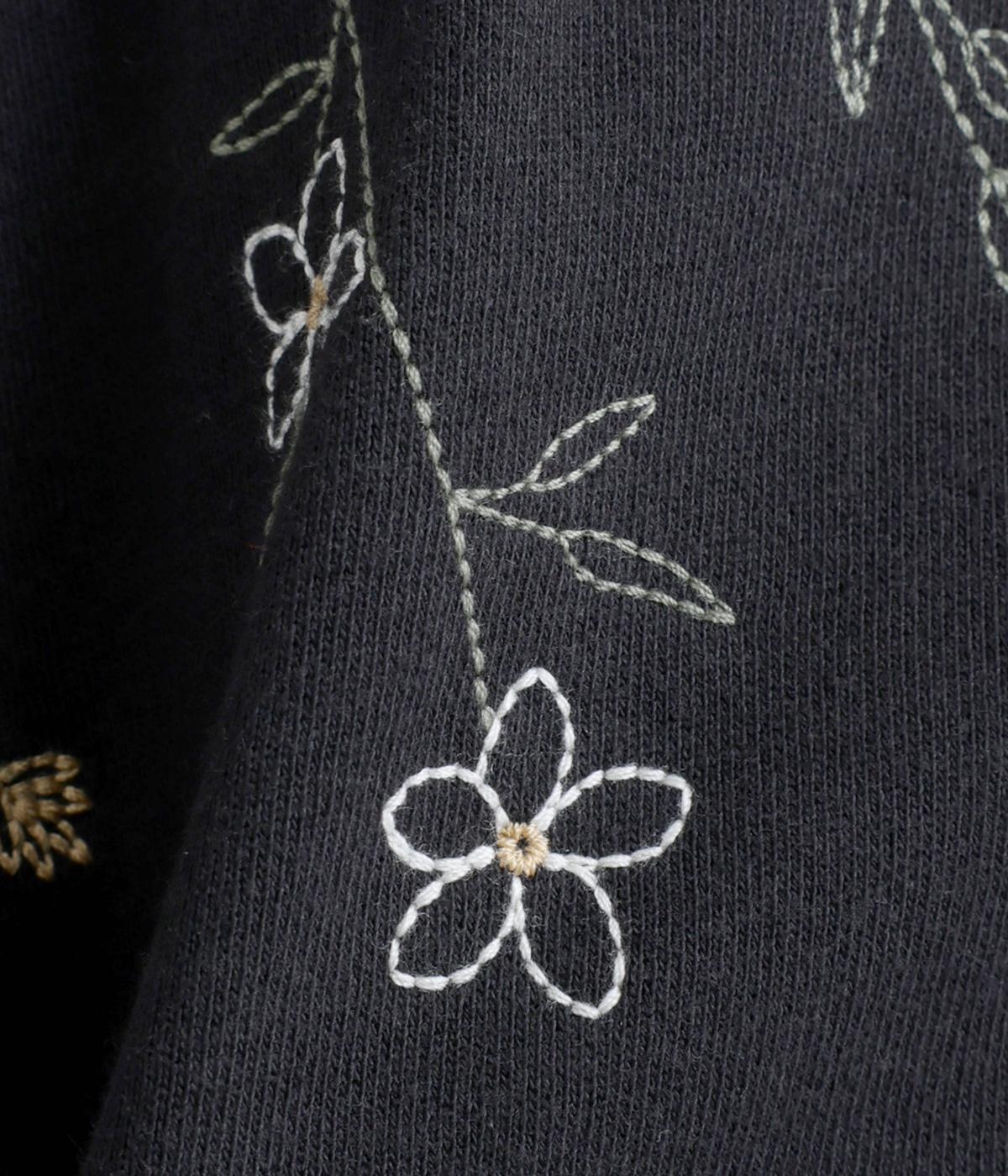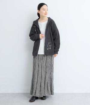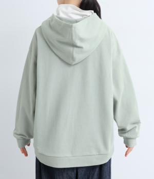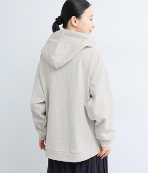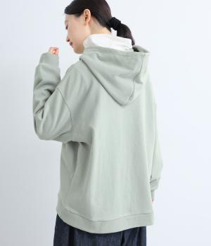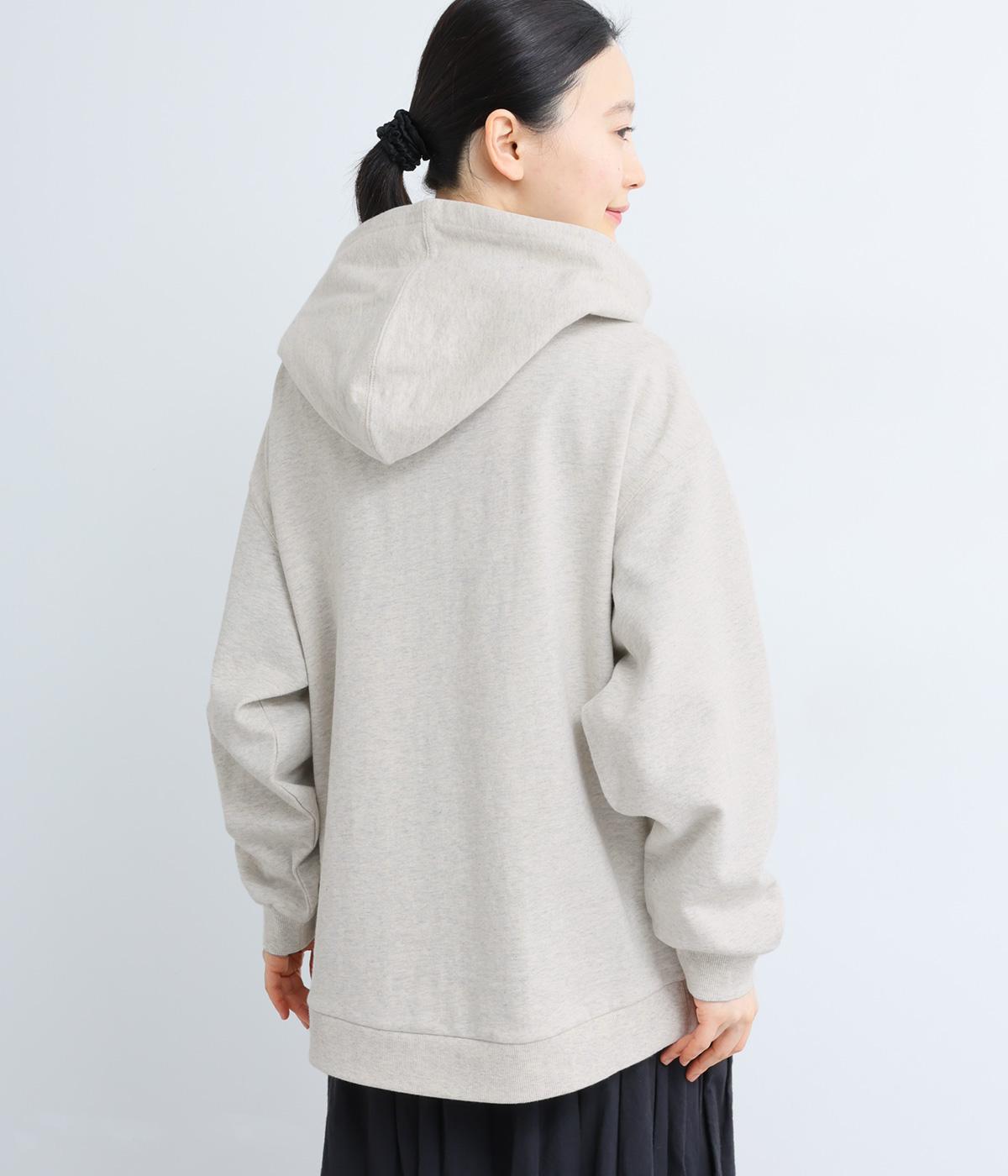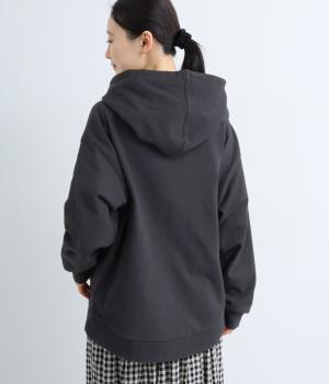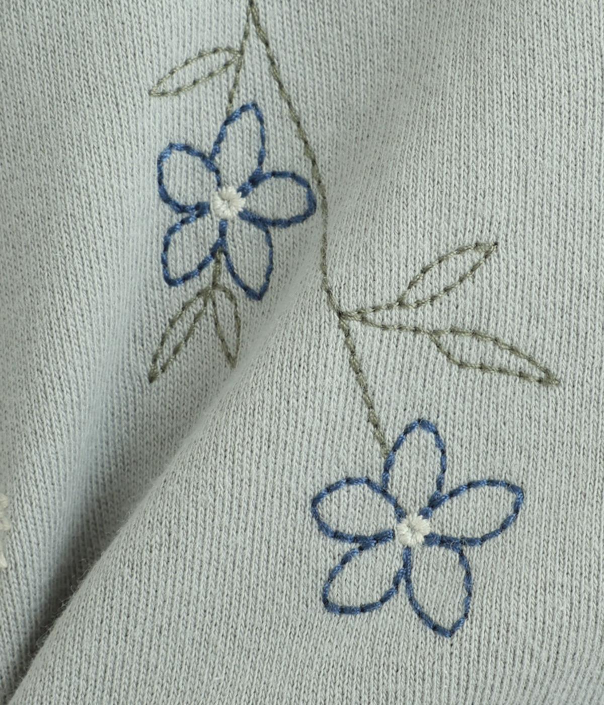 右肩と左裾に、下に流れるような草花刺しゅうをあしらった裏毛パーカー。カジュアルな中にほんのりと女性らしさを添えてくれます。全体にゆとりのあるシルエットがこなれ感を演出。フロントはファスナー仕様でさっと着脱しやすいのもポイントです。