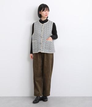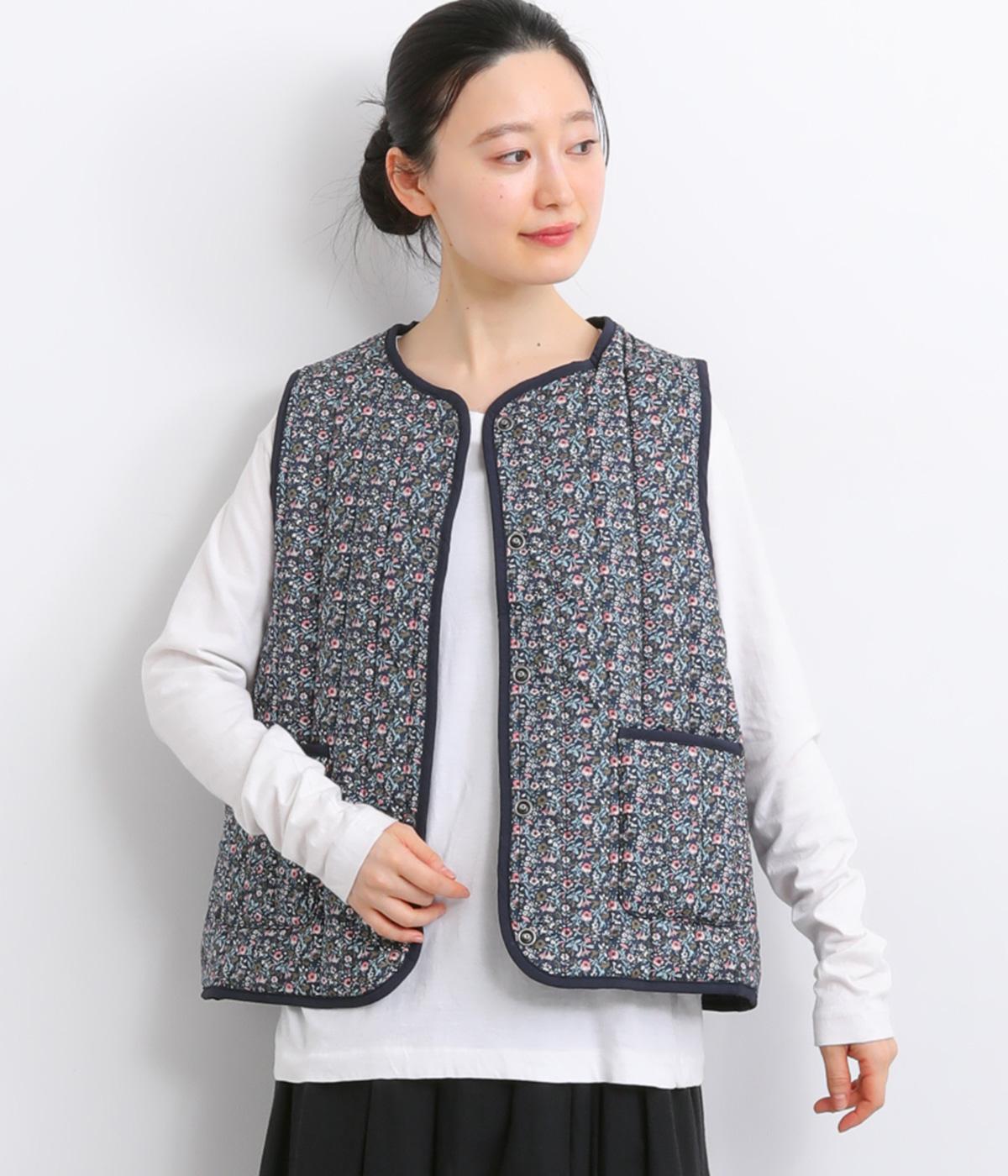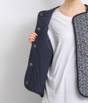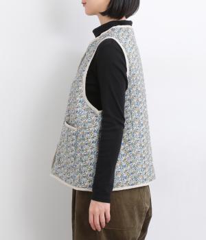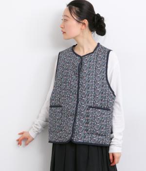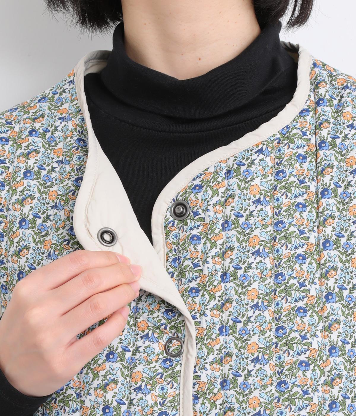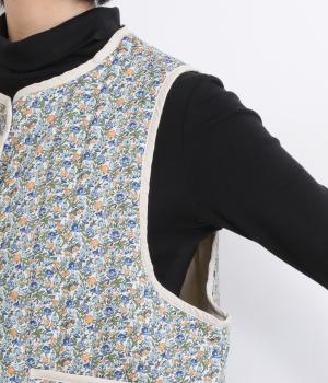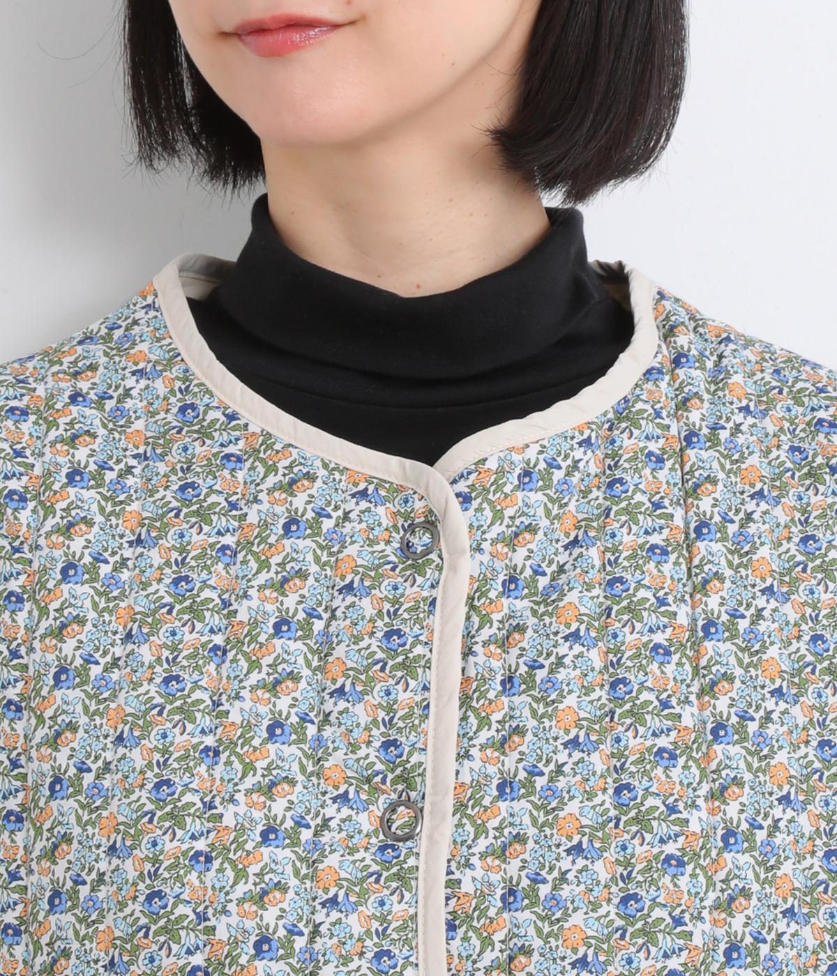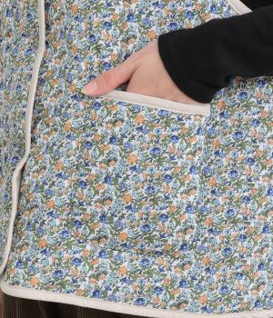 華やぎのある小花柄プリントを全面に施し、キルティングでほどよい立体感をつけたデザインです。ひかえめなボリュームなので、コートのインナーとしても重宝します。パイピングの縁取りが全体をやさしくまとめ、シンプルなトップスに合わせるだけで、コーディネートがぱっと明るい印象に変わります。