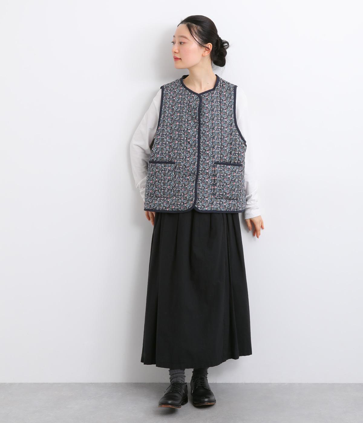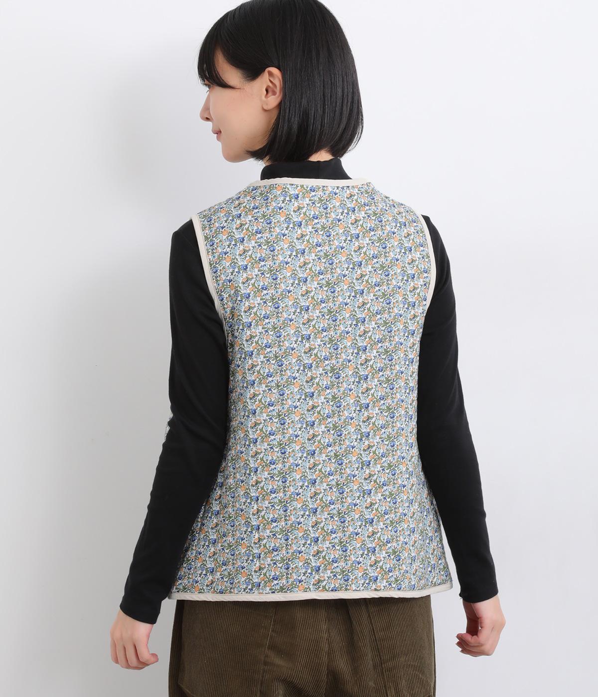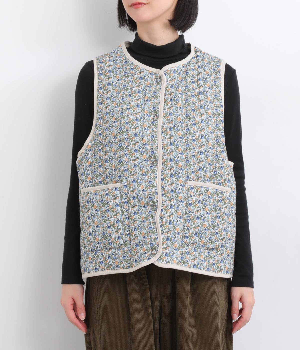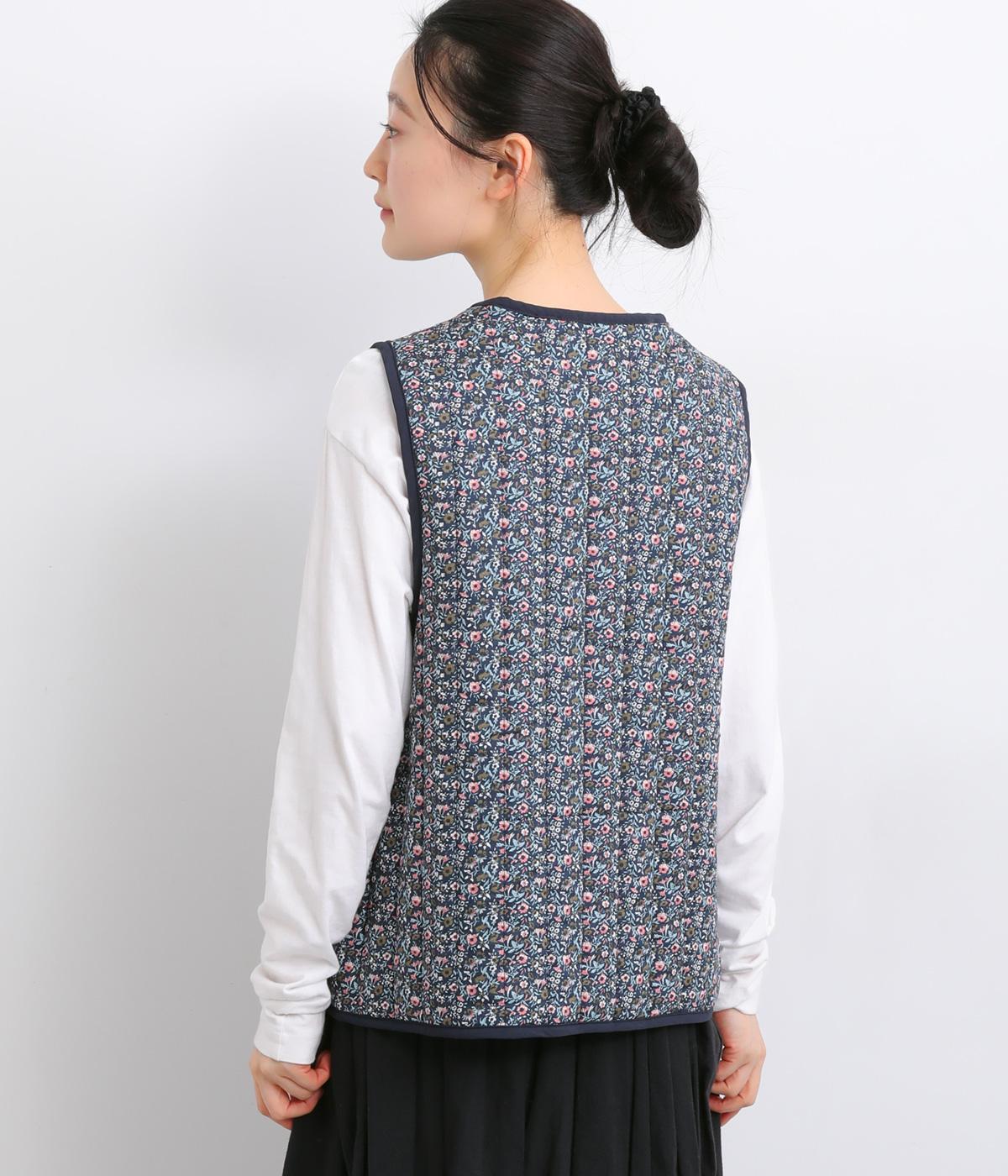 華やぎのある小花柄プリントを全面に施し、キルティングでほどよい立体感をつけたデザインです。ひかえめなボリュームなので、コートのインナーとしても重宝します。パイピングの縁取りが全体をやさしくまとめ、シンプルなトップスに合わせるだけで、コーディネートがぱっと明るい印象に変わります。