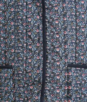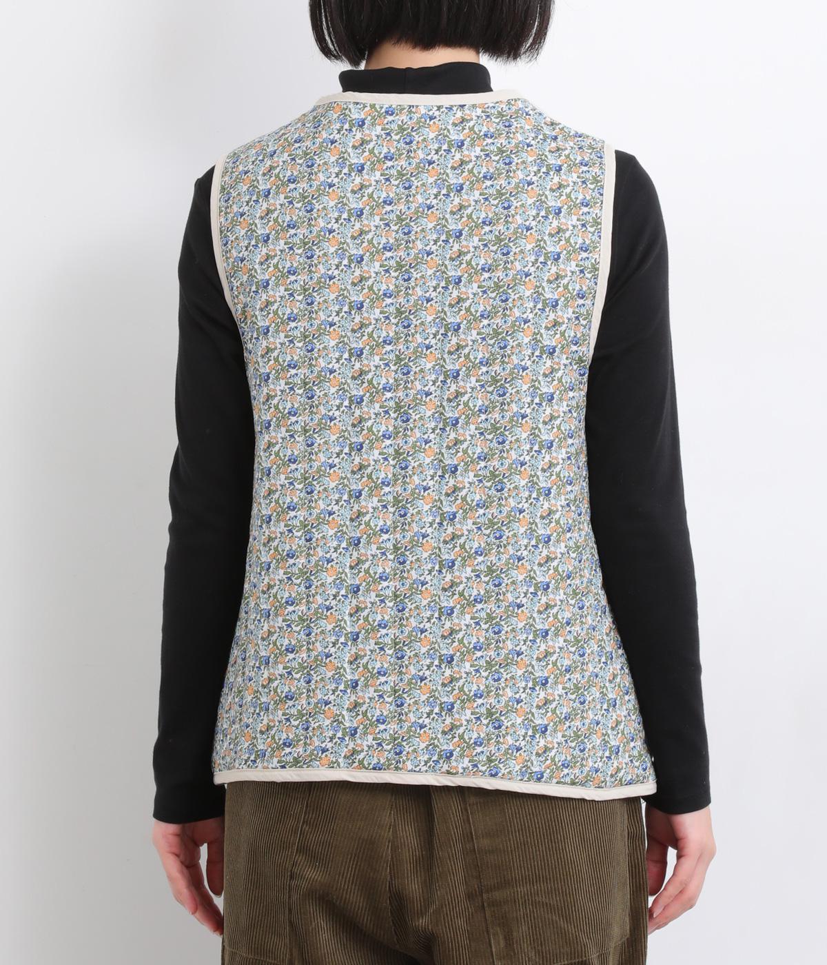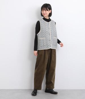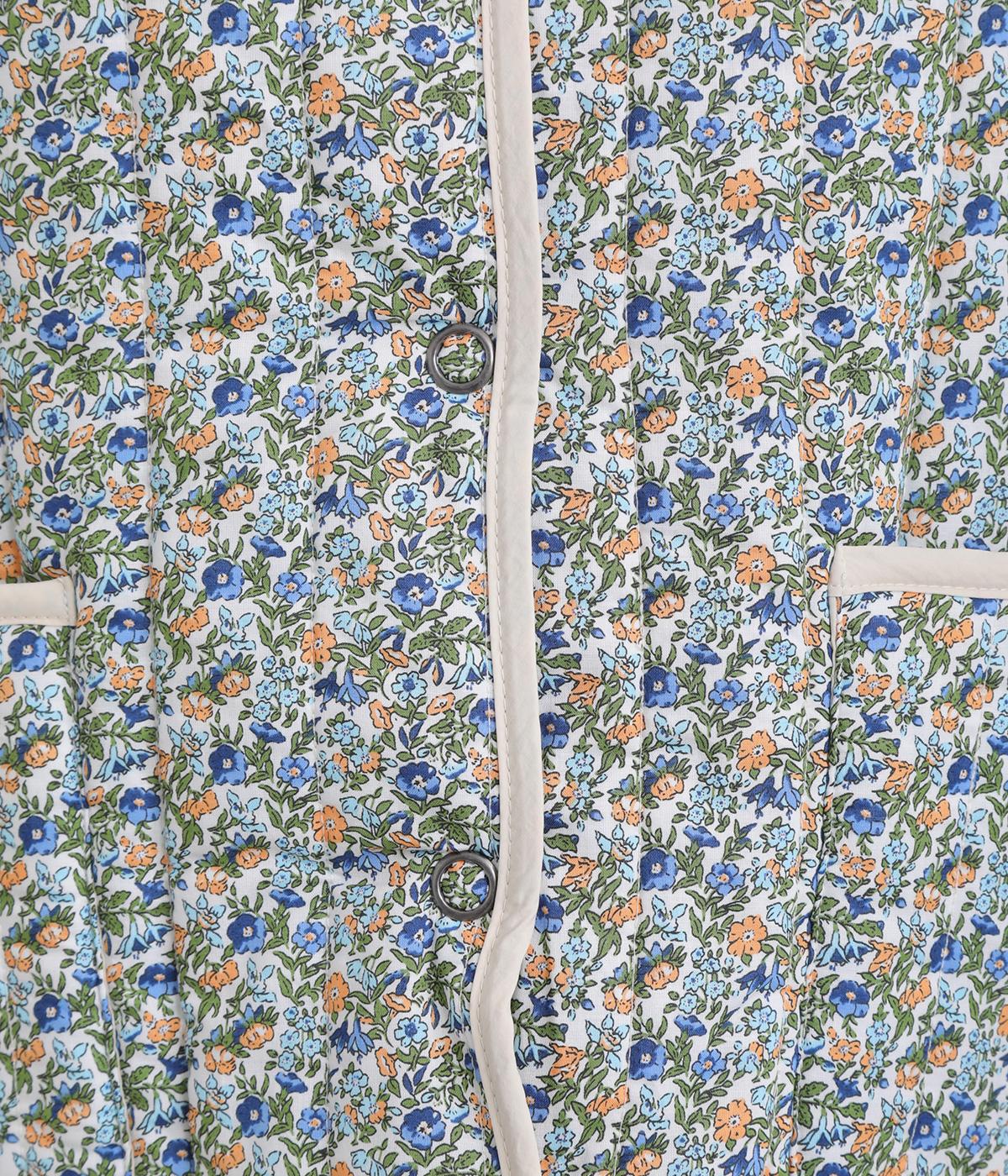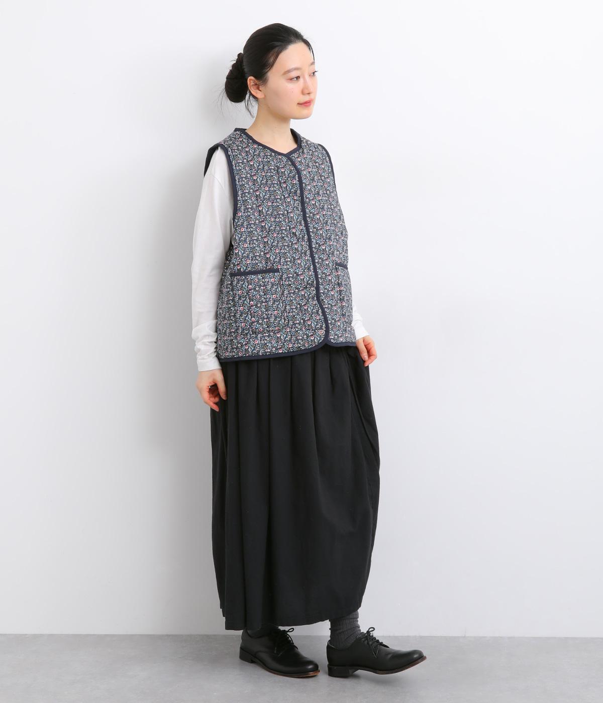 華やぎのある小花柄プリントを全面に施し、キルティングでほどよい立体感をつけたデザインです。ひかえめなボリュームなので、コートのインナーとしても重宝します。パイピングの縁取りが全体をやさしくまとめ、シンプルなトップスに合わせるだけで、コーディネートがぱっと明るい印象に変わります。
