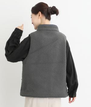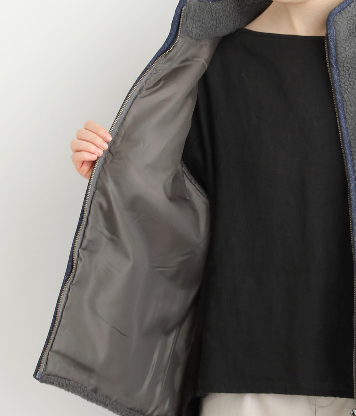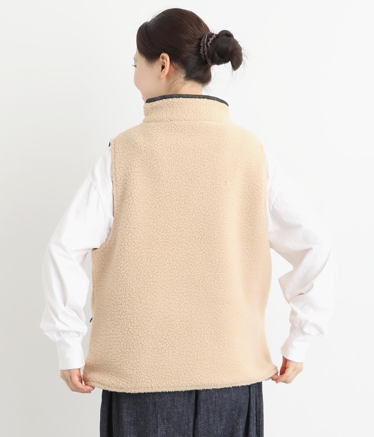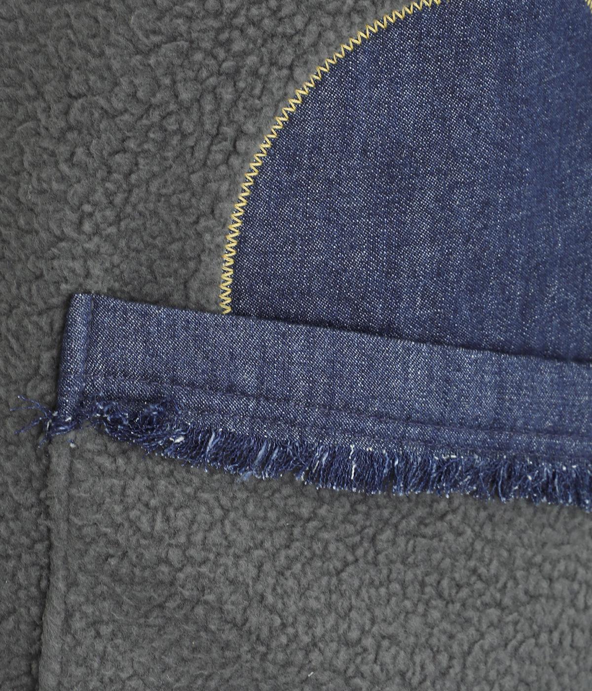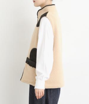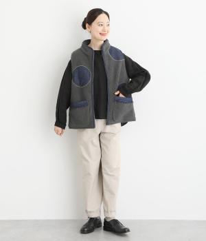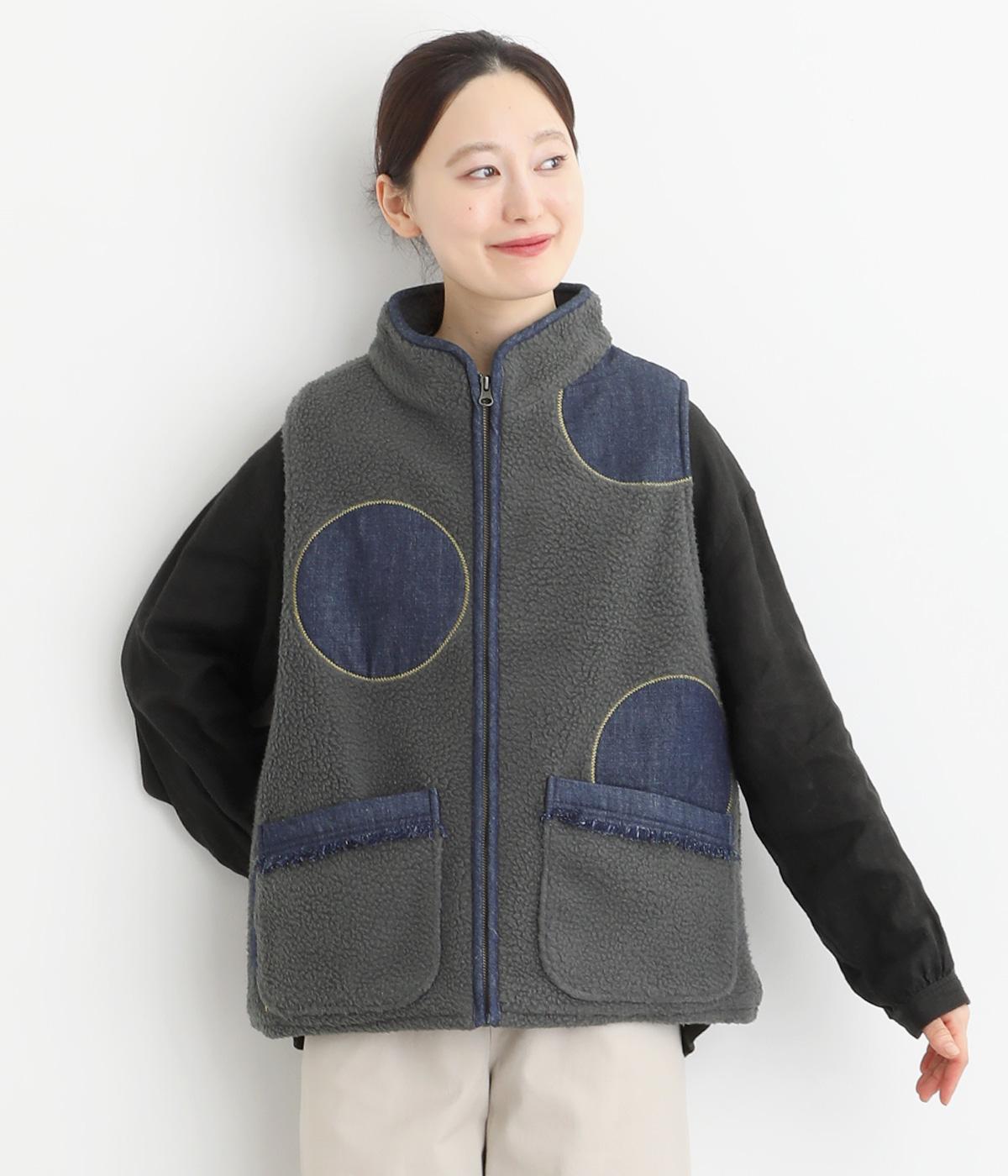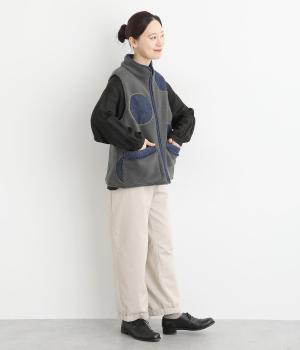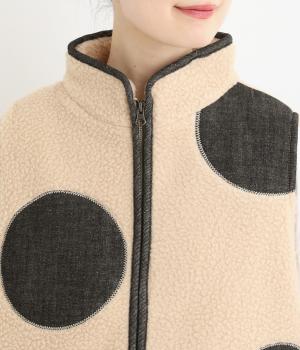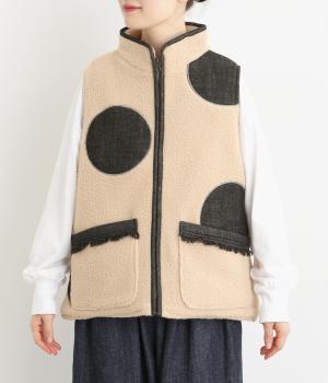 あたたかみのあるボアベストにデニム生地で大きなドット刺しゅうをほどこしました。軽やかでやわらかな手ざわりに保温性も兼ね備えた、機能性もばっちりな素材です。