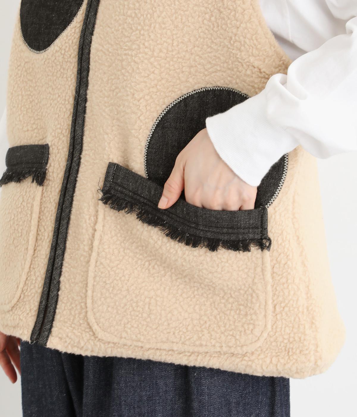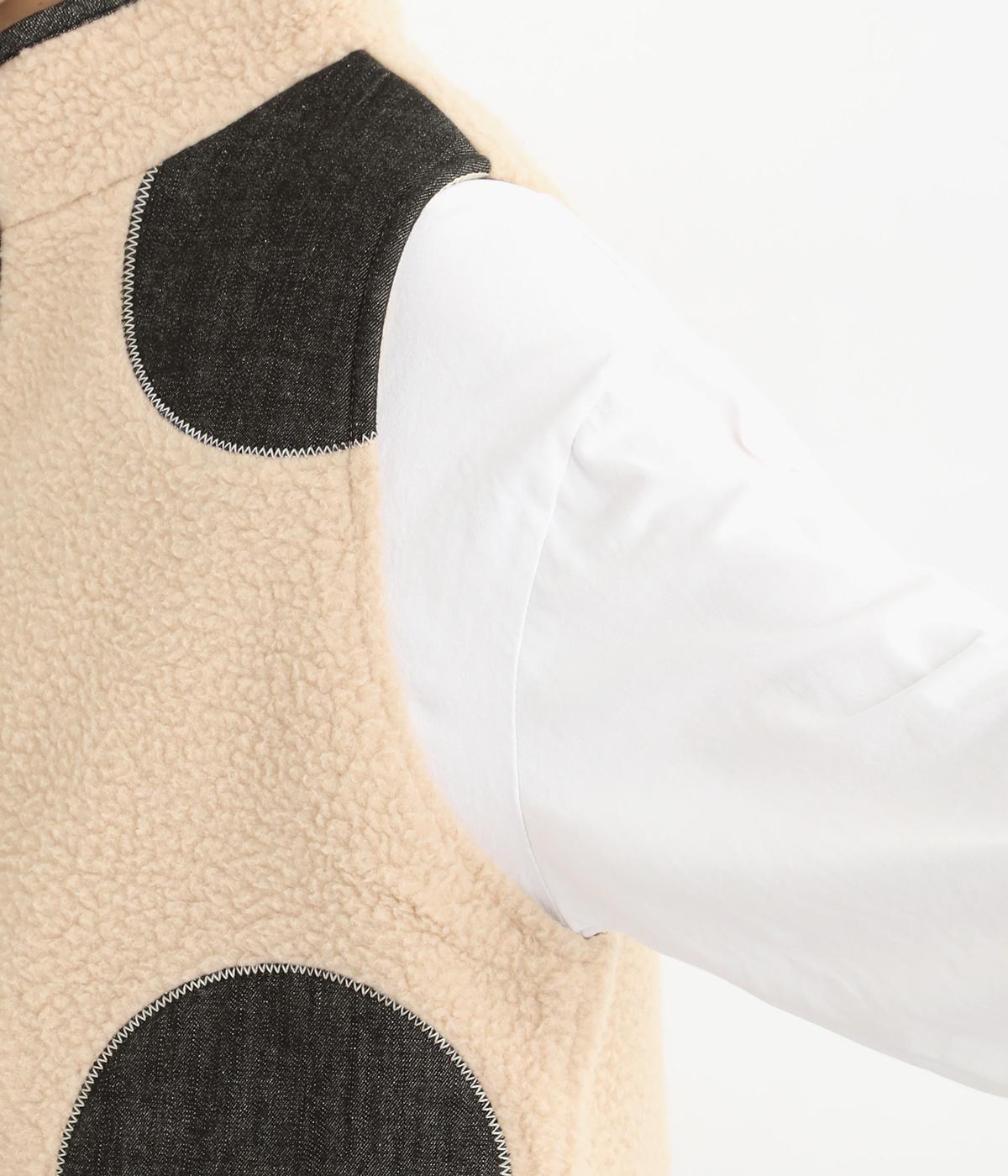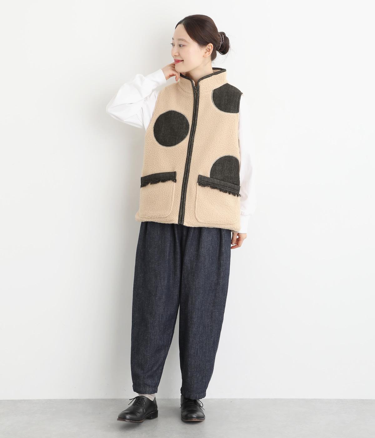 大きなドットがパッと目をひくボアベスト。ポケットのふちにはデニムでフリンジをあしらいました。首まわりから前立てに入ったデニムのパイピングがすっきり見せのアクセントになっています。着こなしに遊び心を添える一枚です。
