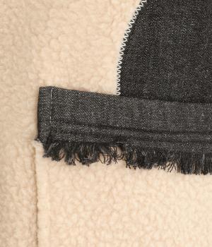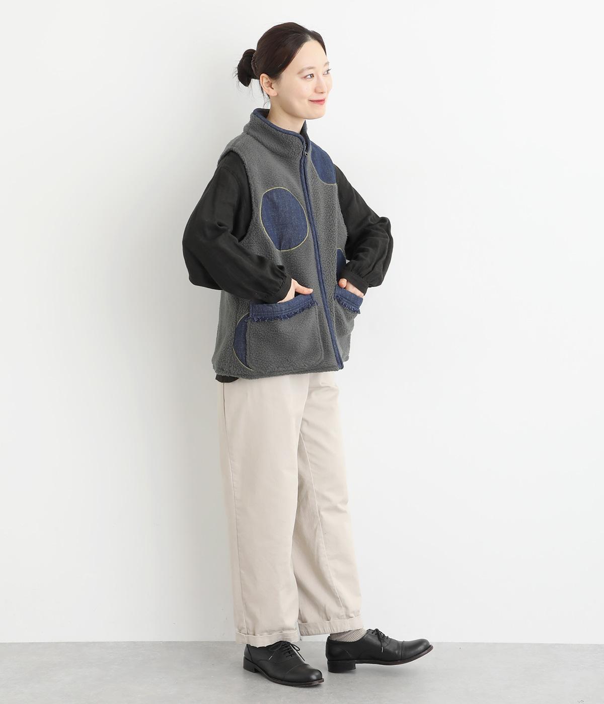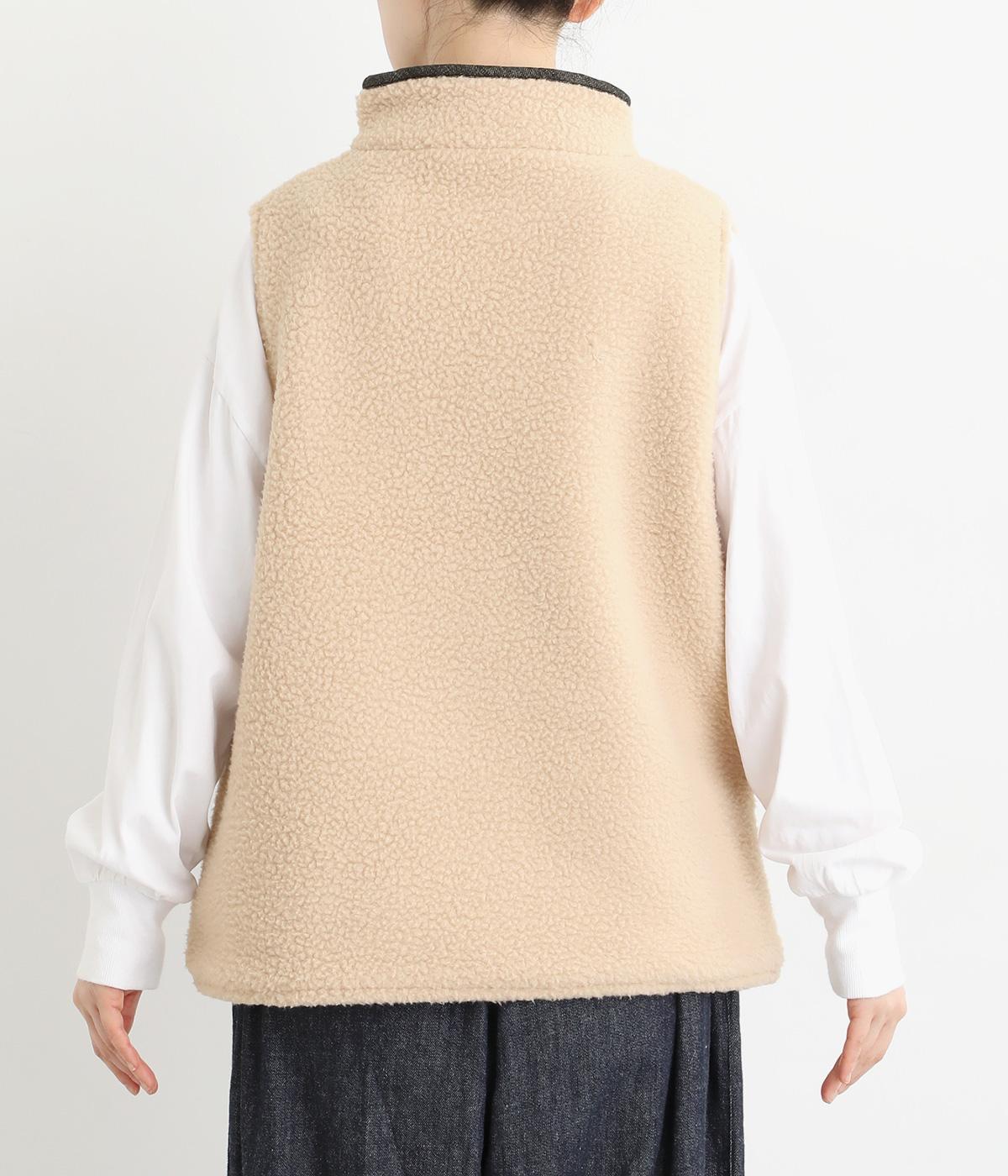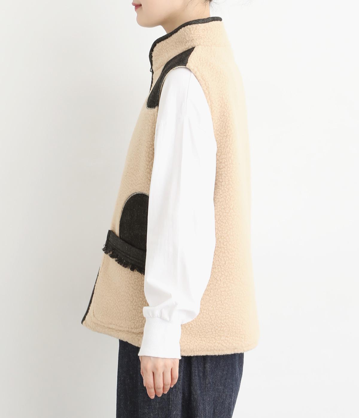 大きなドットがパッと目をひくボアベスト。ポケットのふちにはデニムでフリンジをあしらいました。首まわりから前立てに入ったデニムのパイピングがすっきり見せのアクセントになっています。着こなしに遊び心を添える一枚です。