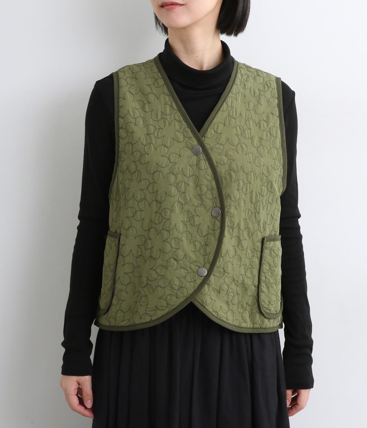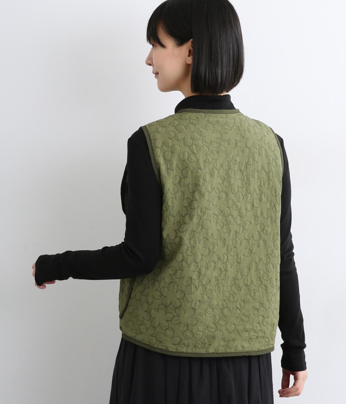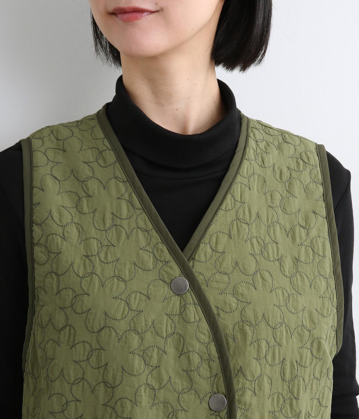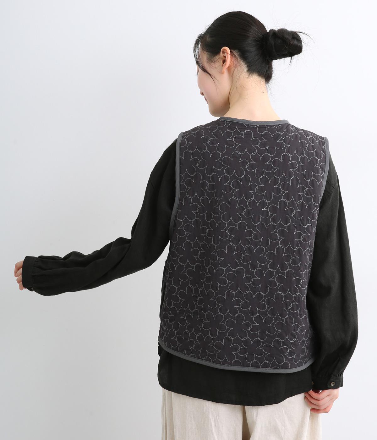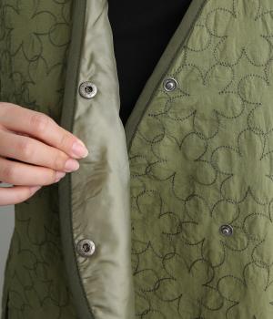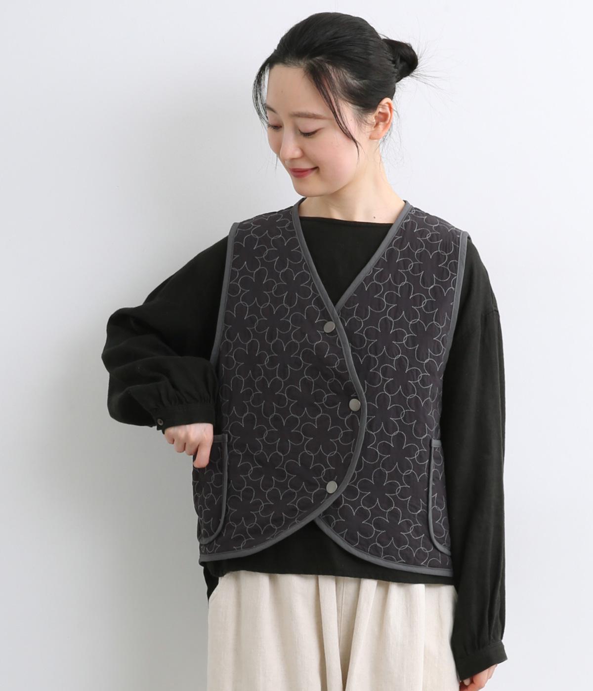 重なり合う花柄のステッチが特徴的なキルティングベストです。前立てのカーブラインがこなれ感を演出し、丸みのある裾がかわいらしさを添えます。サッと羽織るだけで秋冬のコーディネートが華やぐアイテムです。