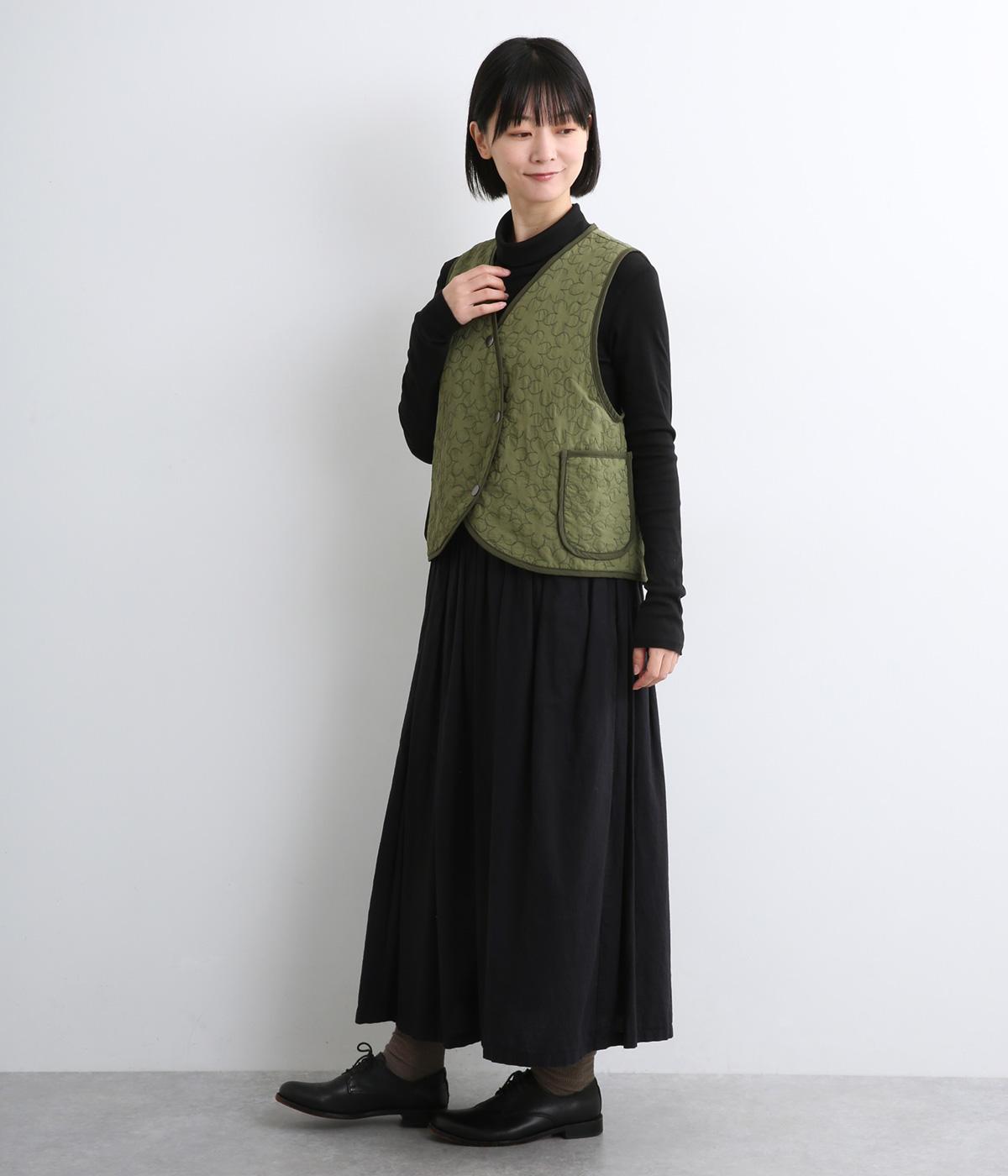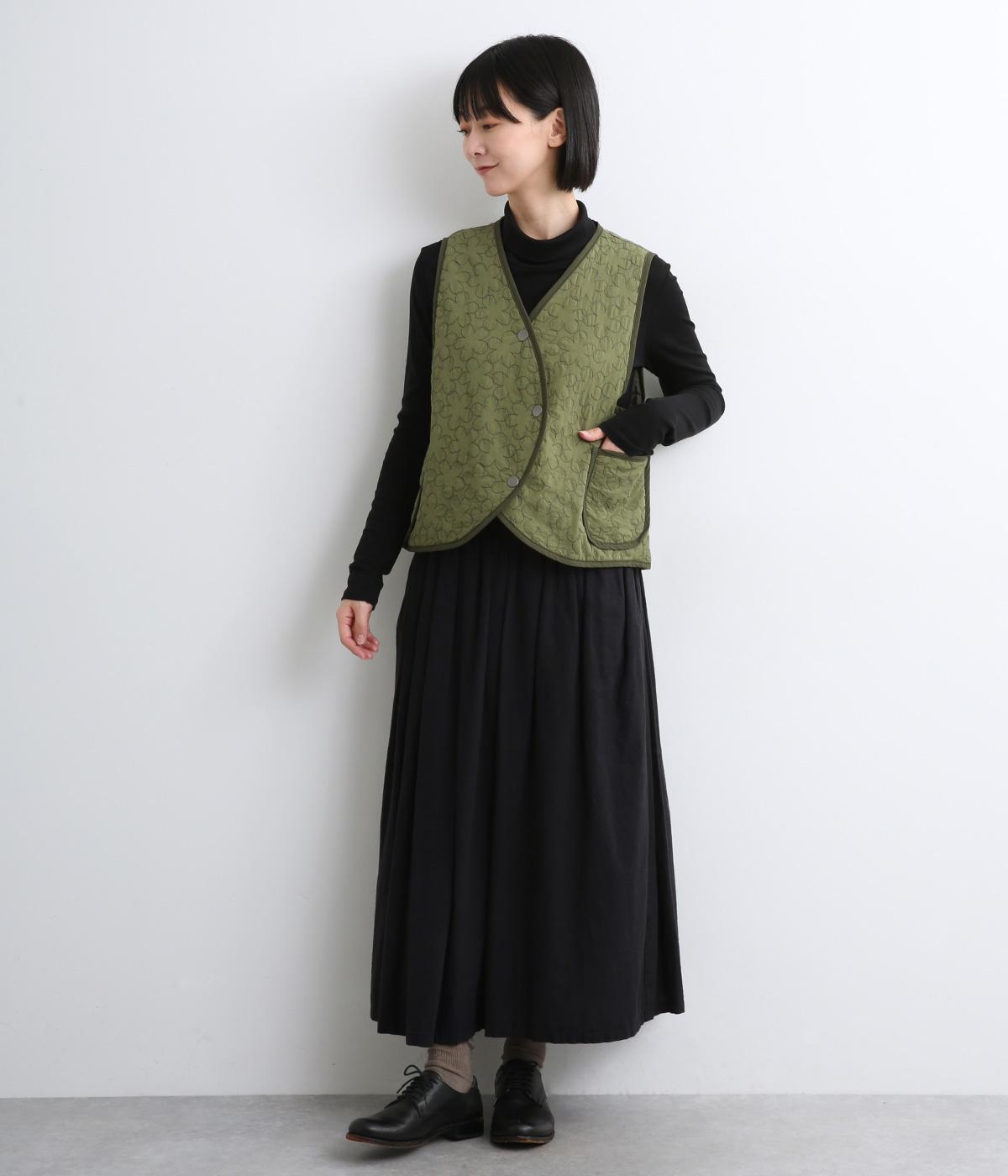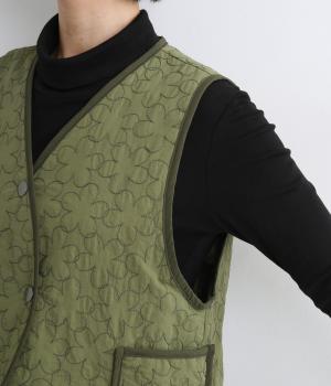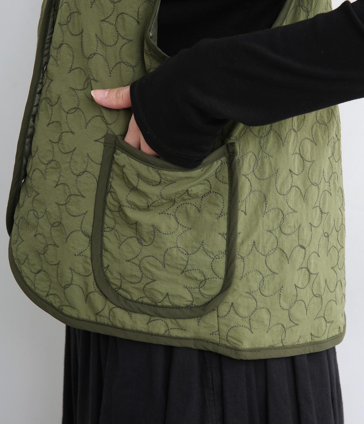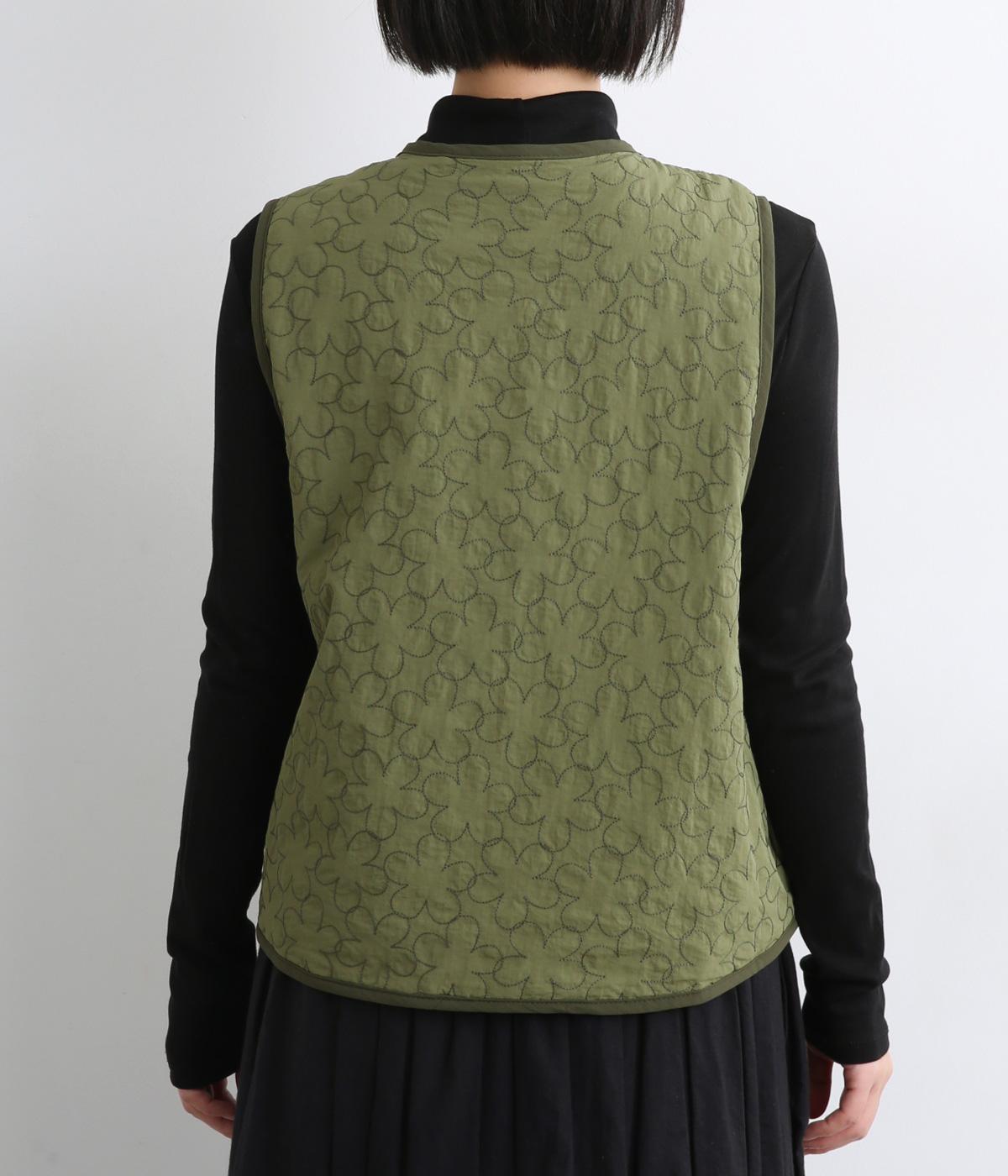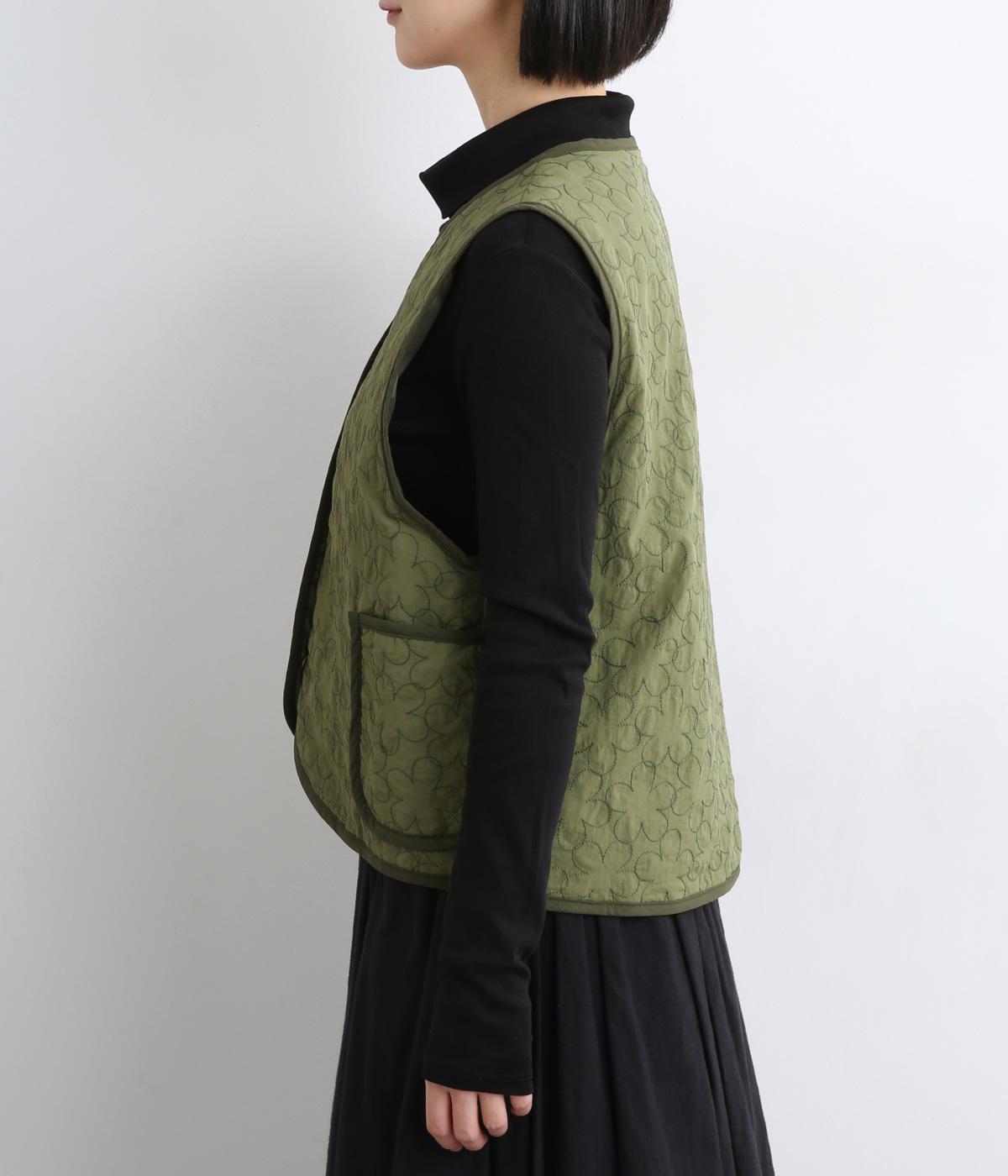 重なり合う花柄のステッチが特徴的なキルティングベストです。前立てのカーブラインがこなれ感を演出し、丸みのある裾がかわいらしさを添えます。サッと羽織るだけで秋冬のコーディネートが華やぐアイテムです。