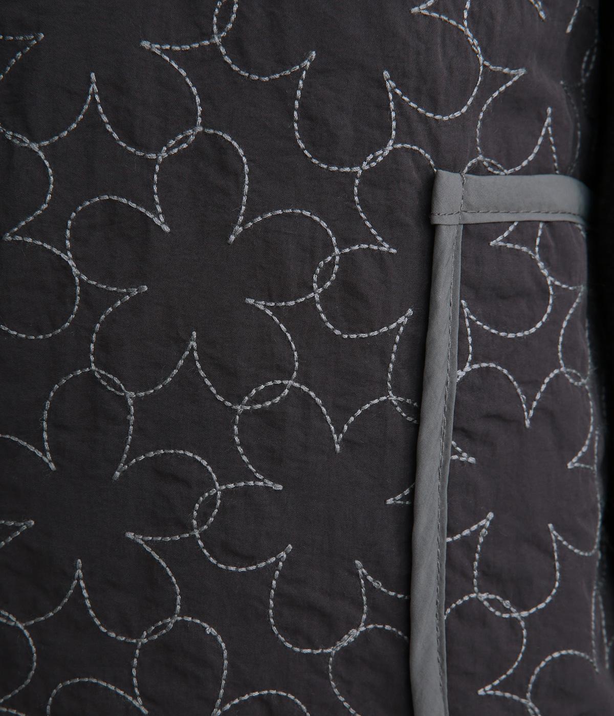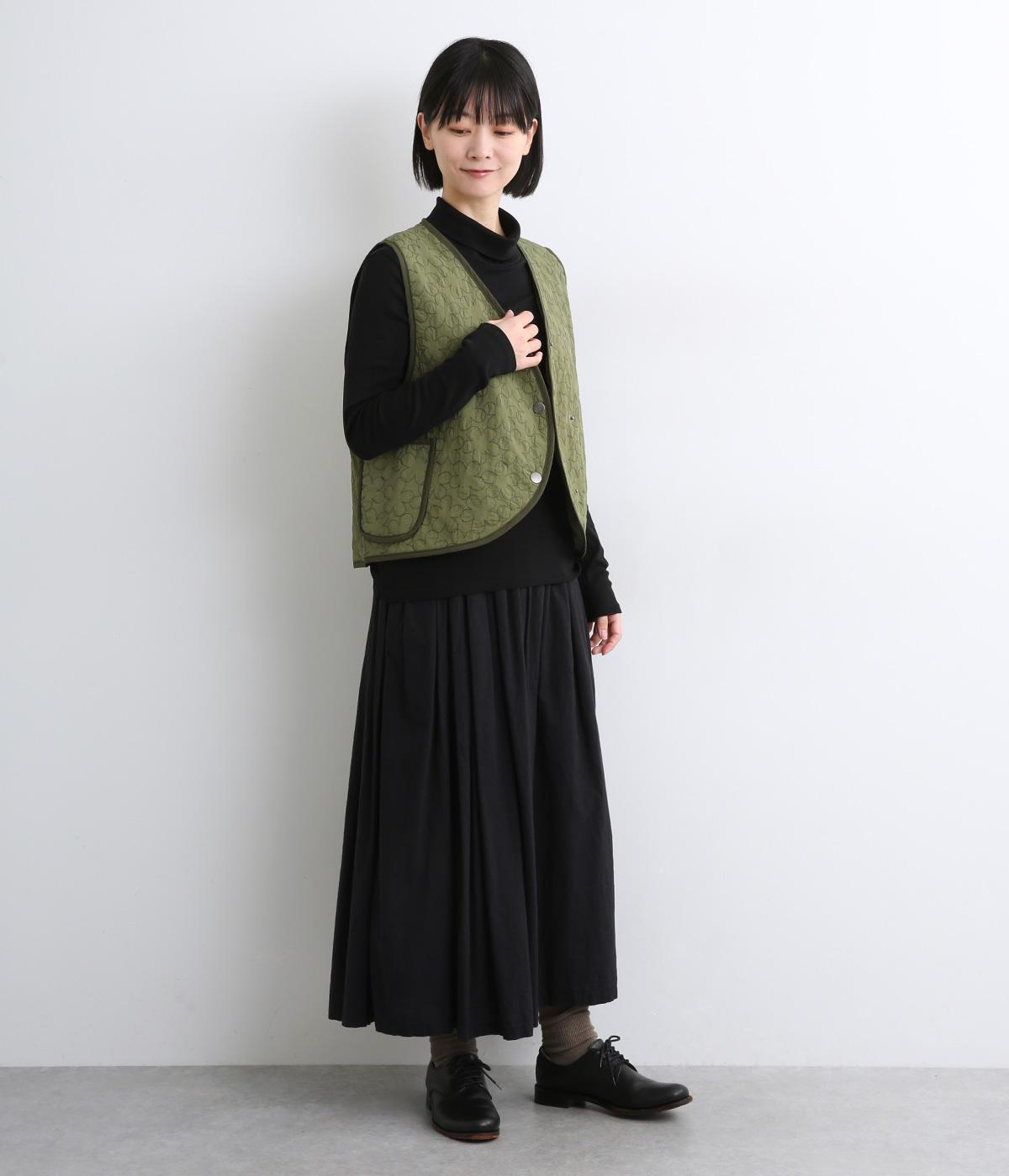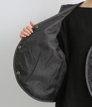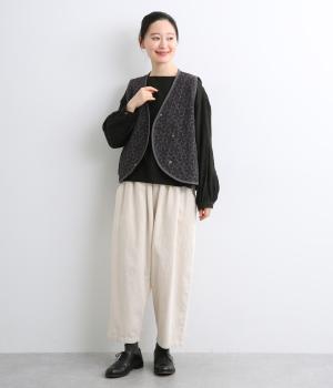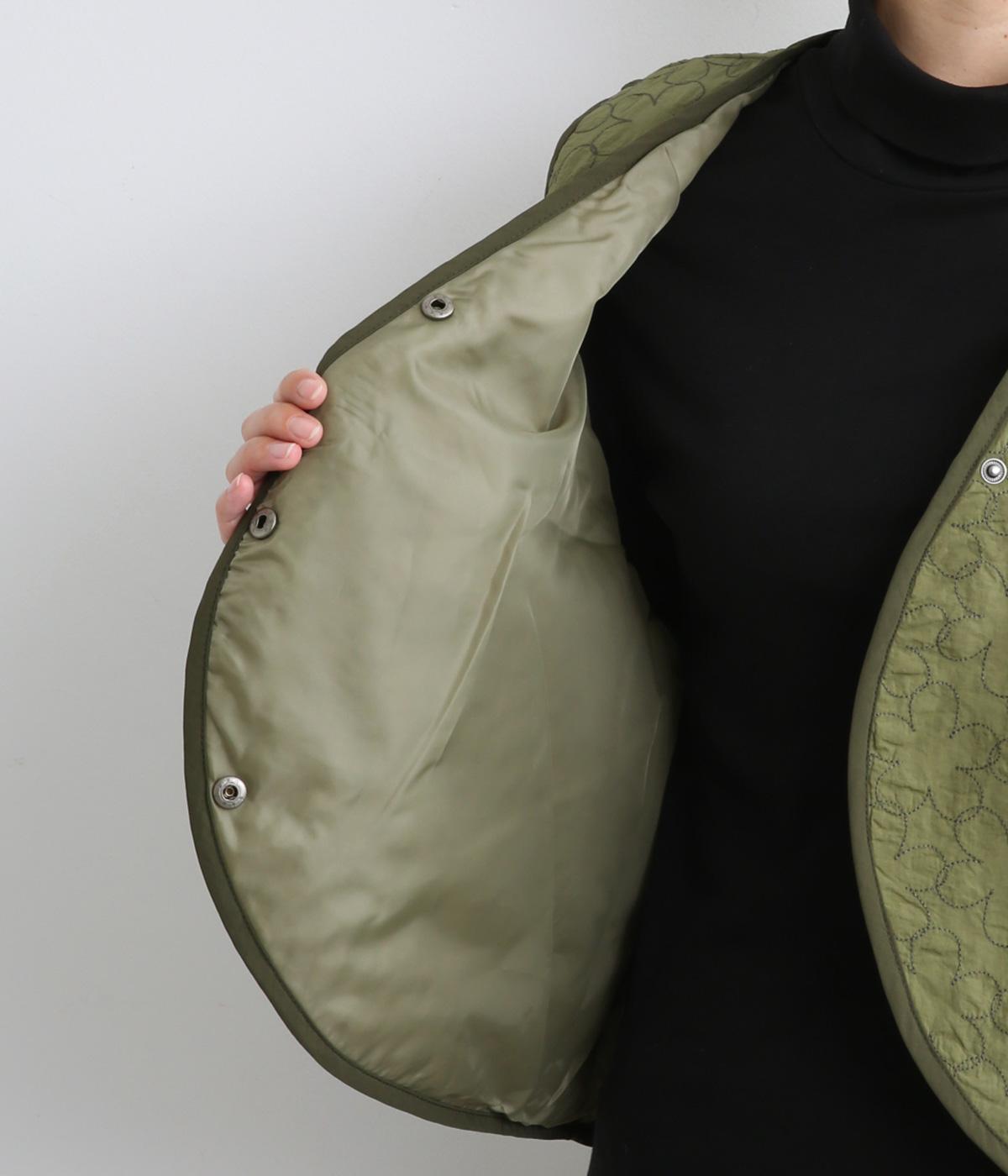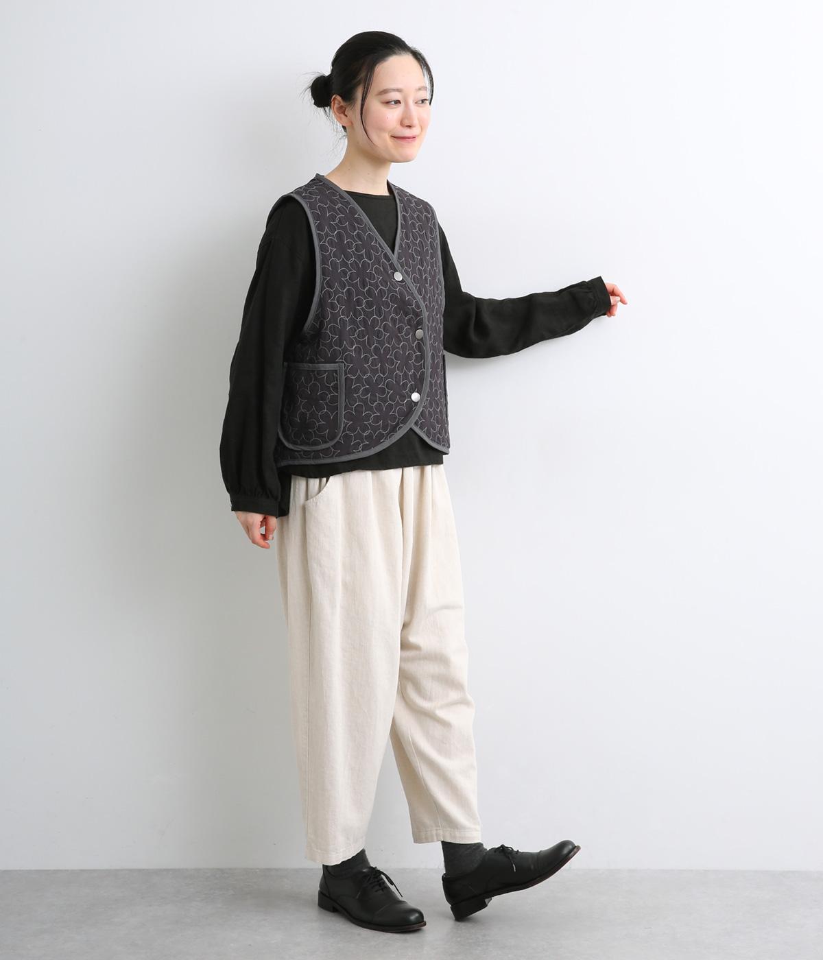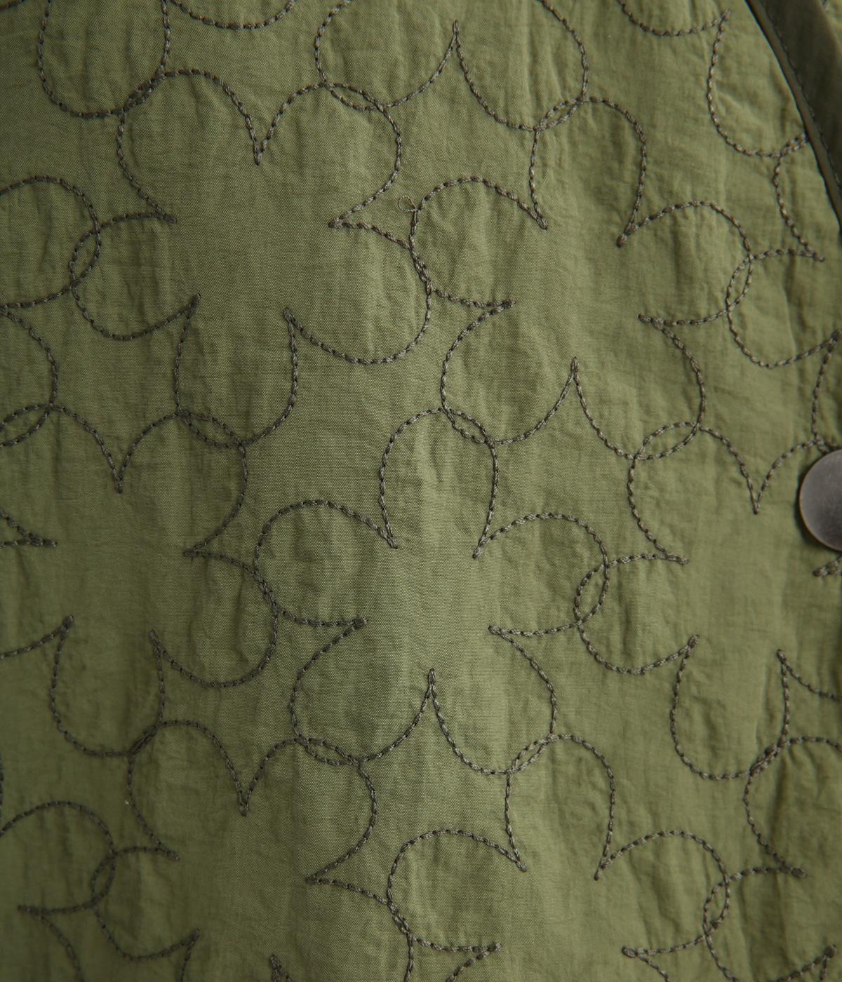 重なり合う花柄のステッチが特徴的なキルティングベストです。前立てのカーブラインがこなれ感を演出し、丸みのある裾がかわいらしさを添えます。サッと羽織るだけで秋冬のコーディネートが華やぐアイテムです。