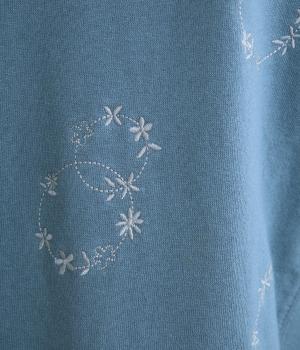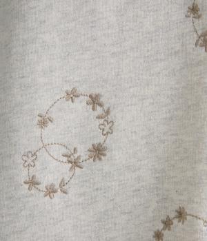 やわらかく、ほどよい厚みのあるコットン生地。柄はすべて刺しゅうで仕立てて上品な雰囲気に仕上げました。ふっくらと体を包む優しい素材感です。