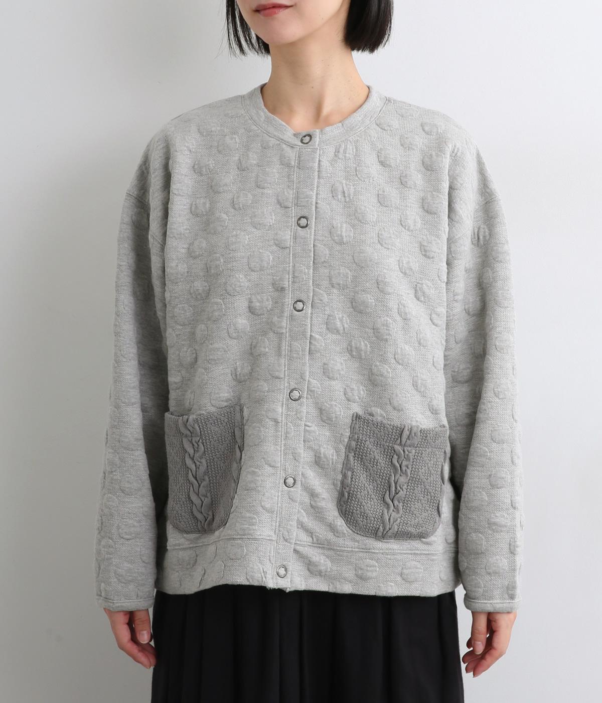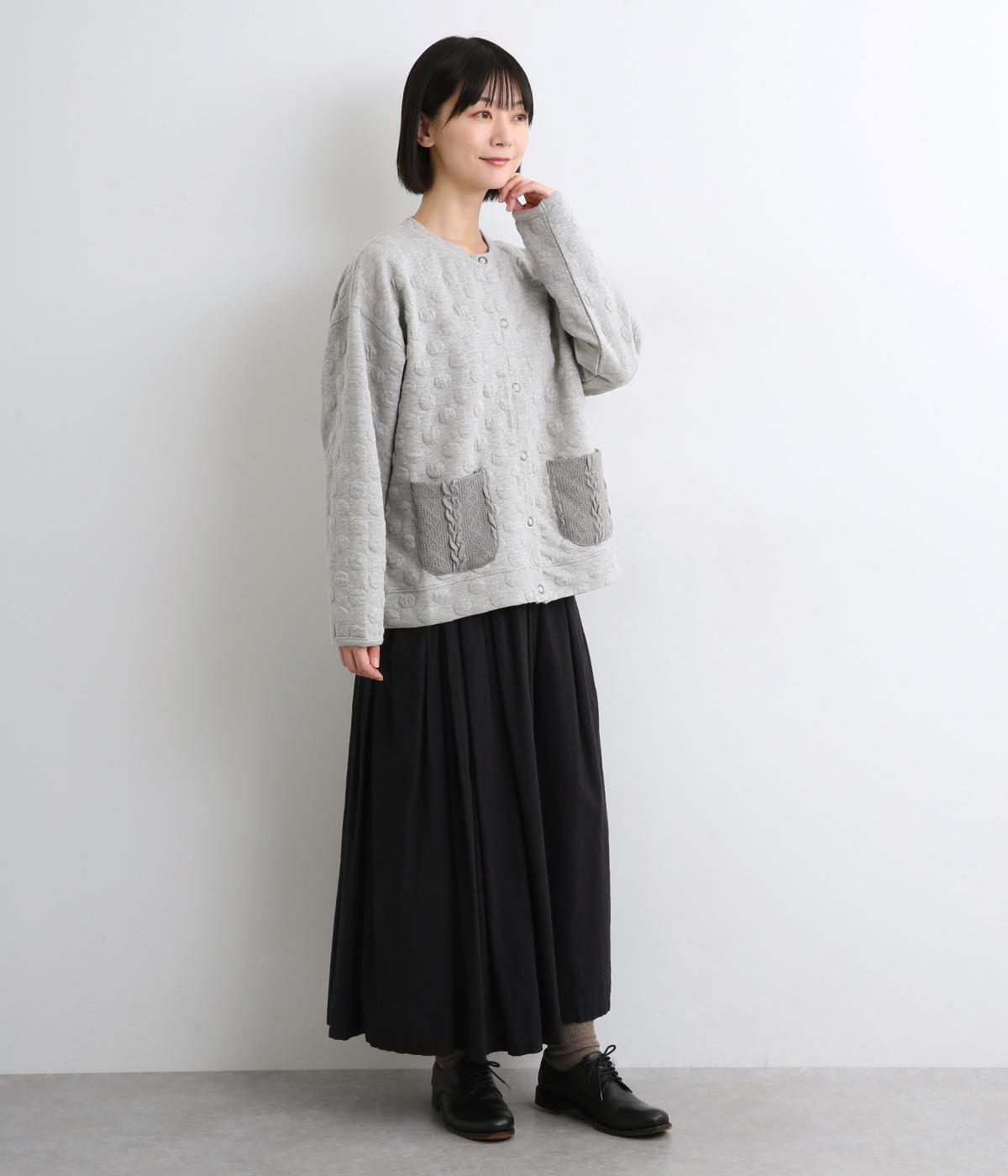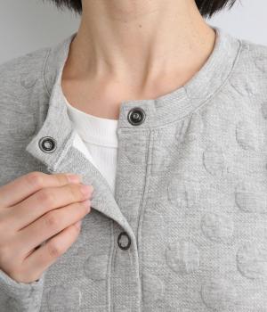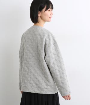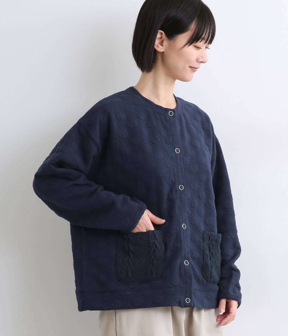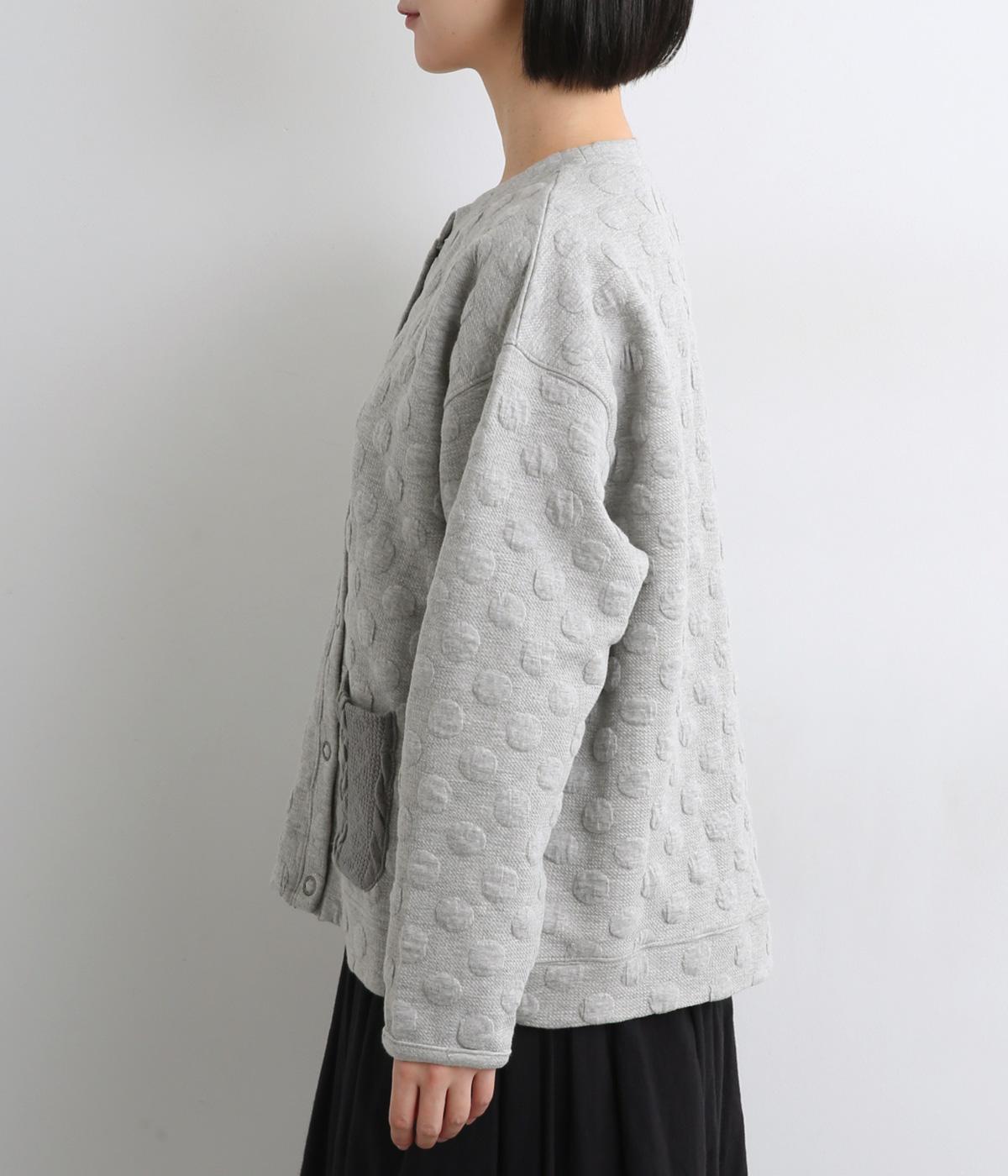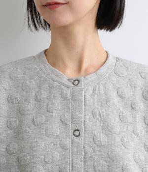 カジュアルな素材感とシンプルな型のカーディガンに、ぽこぽこと立体的なドットをほどこして愛らしさを添えました。ニットで仕立てたポケットがアクセントになっています。コーディネートにそっと華やかさを添える一枚です。
