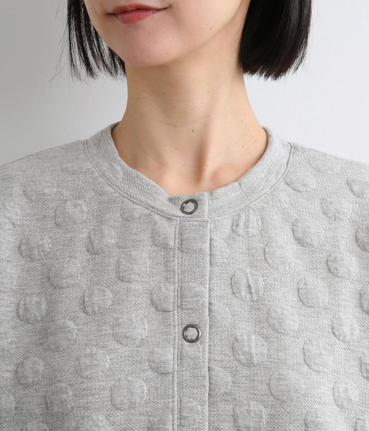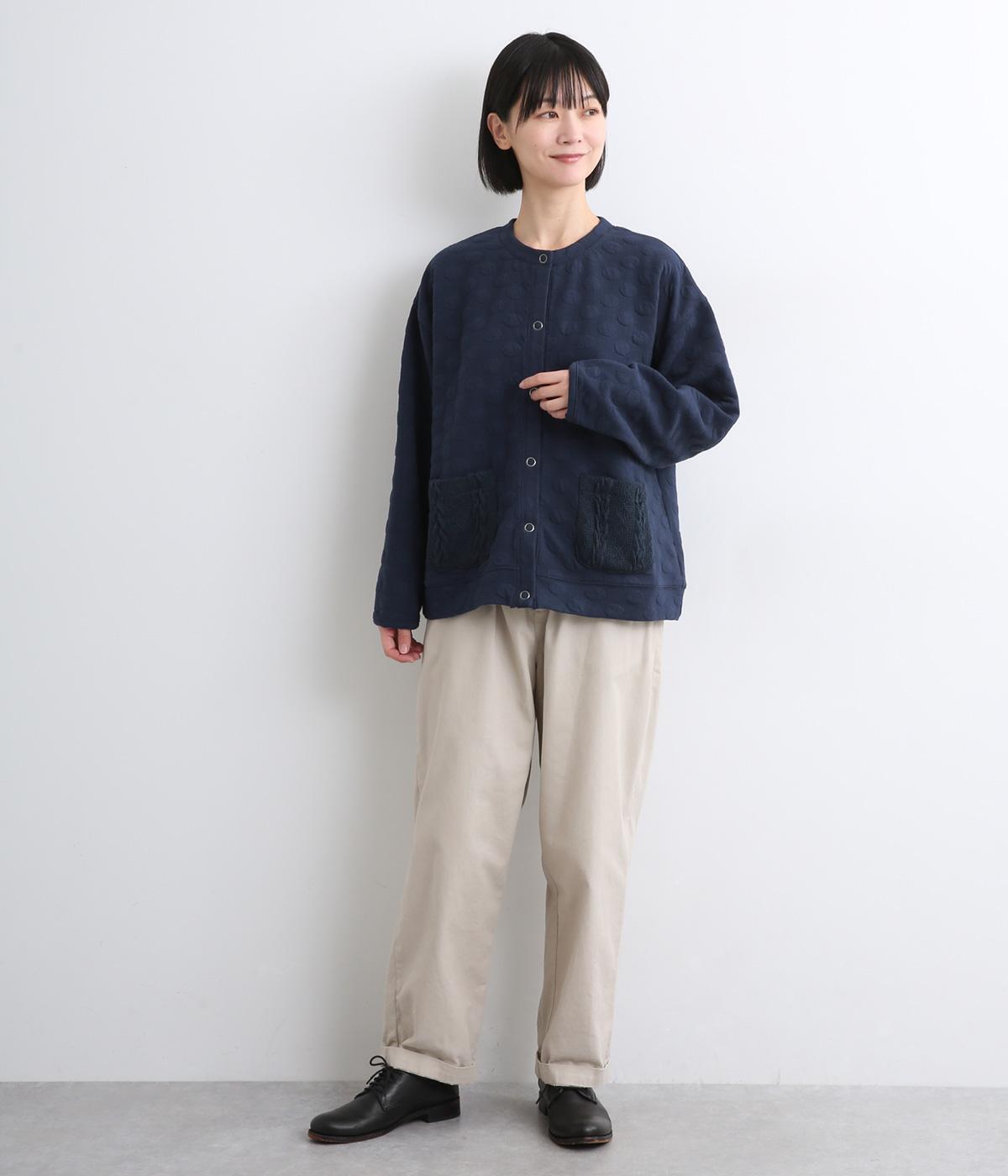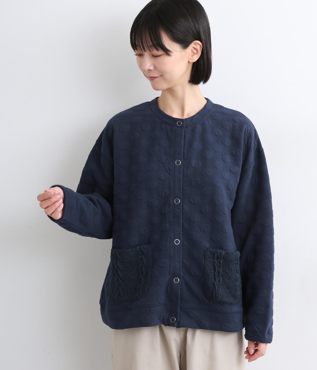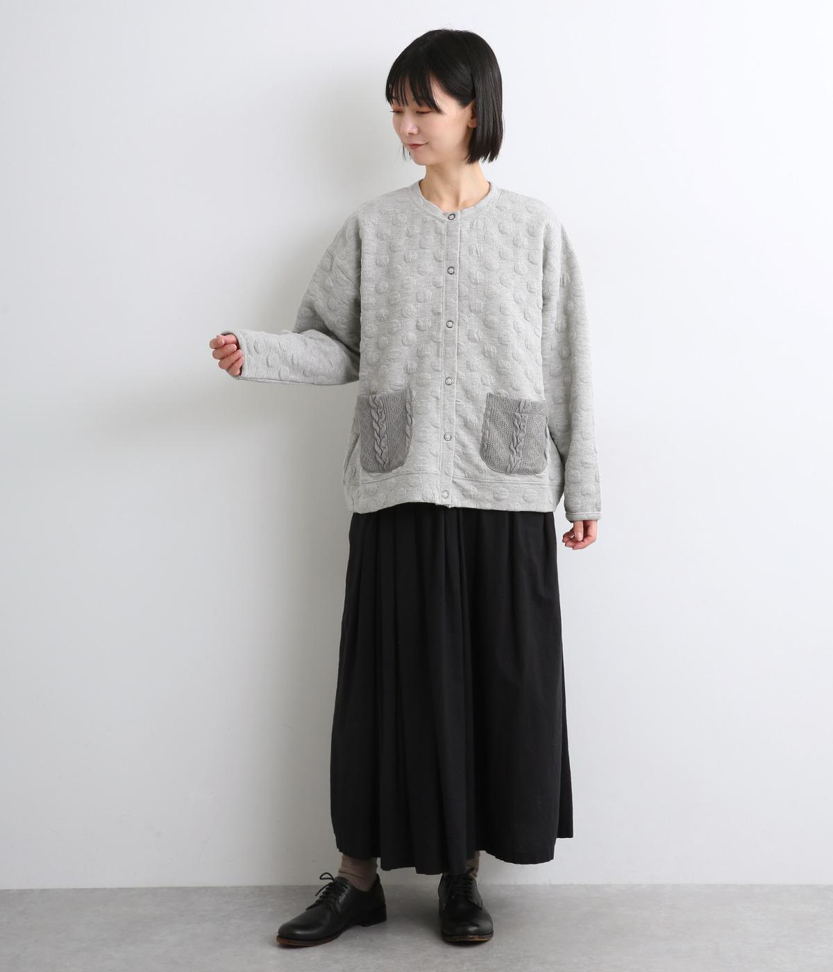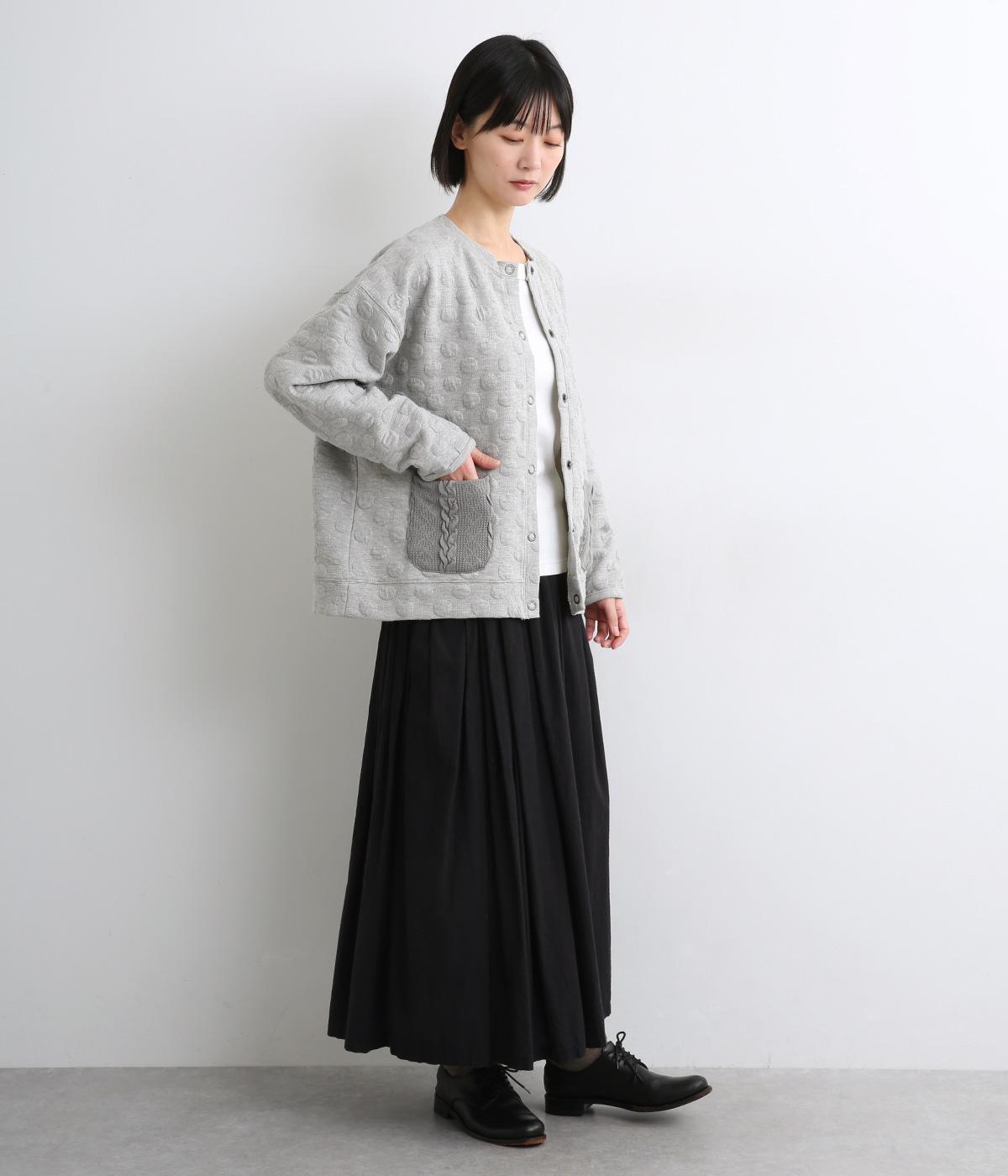 カジュアルな素材感とシンプルな型のカーディガンに、ぽこぽこと立体的なドットをほどこして愛らしさを添えました。ニットで仕立てたポケットがアクセントになっています。コーディネートにそっと華やかさを添える一枚です。