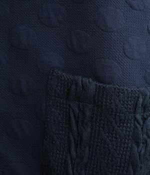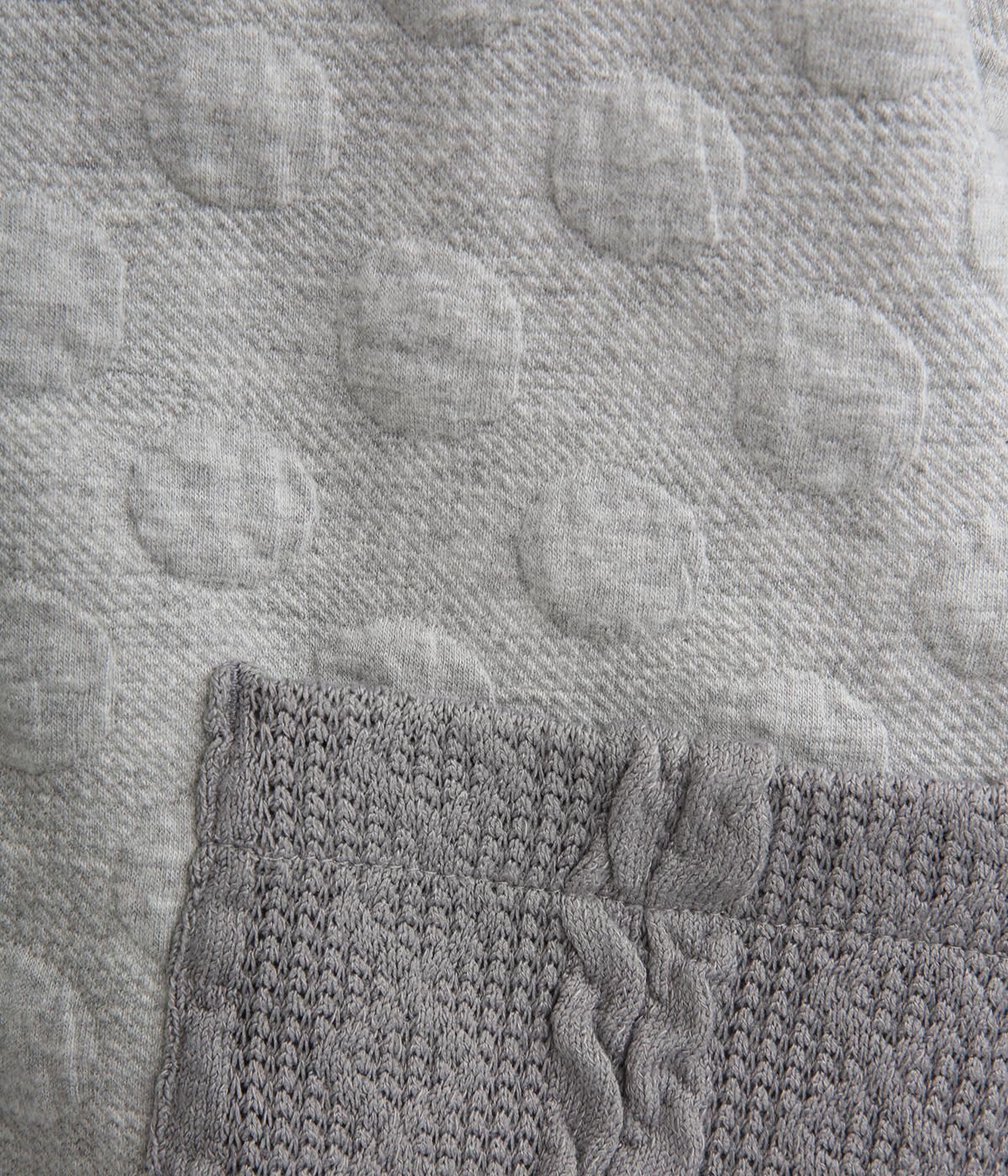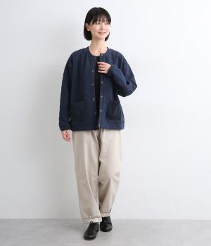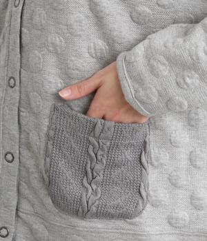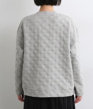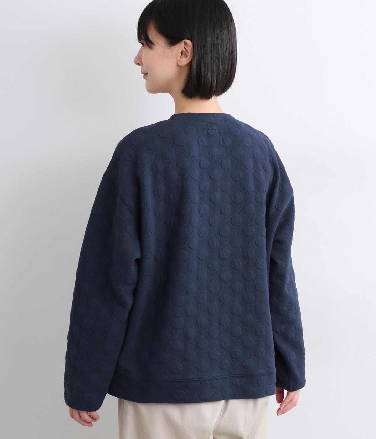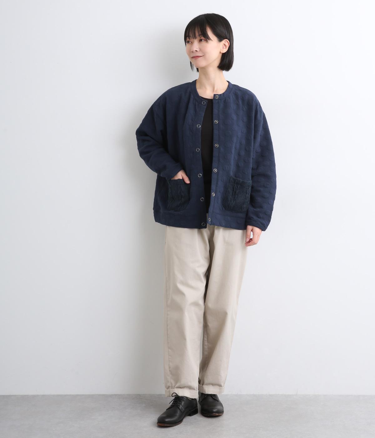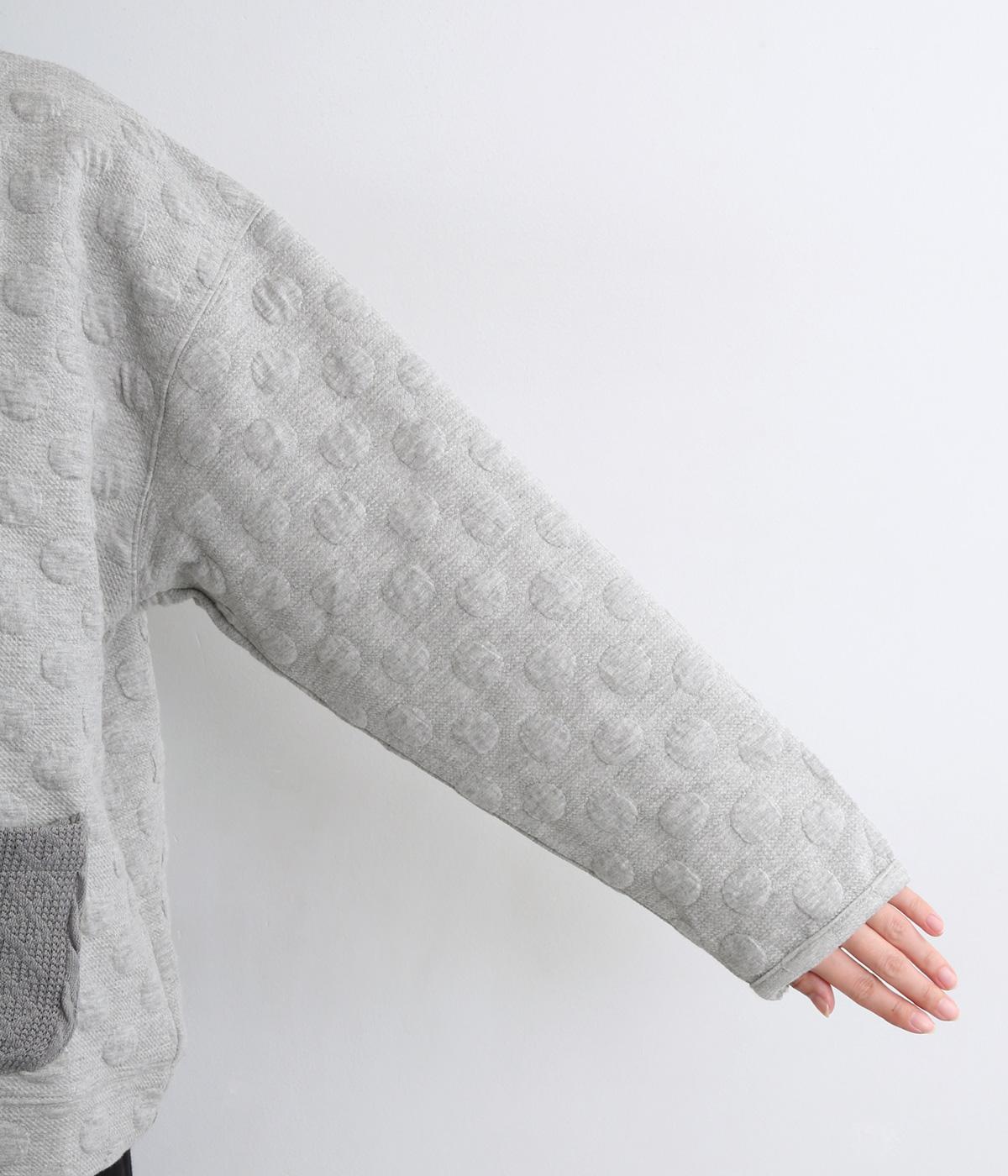 カジュアルな素材感とシンプルな型のカーディガンに、ぽこぽこと立体的なドットをほどこして愛らしさを添えました。ニットで仕立てたポケットがアクセントになっています。コーディネートにそっと華やかさを添える一枚です。