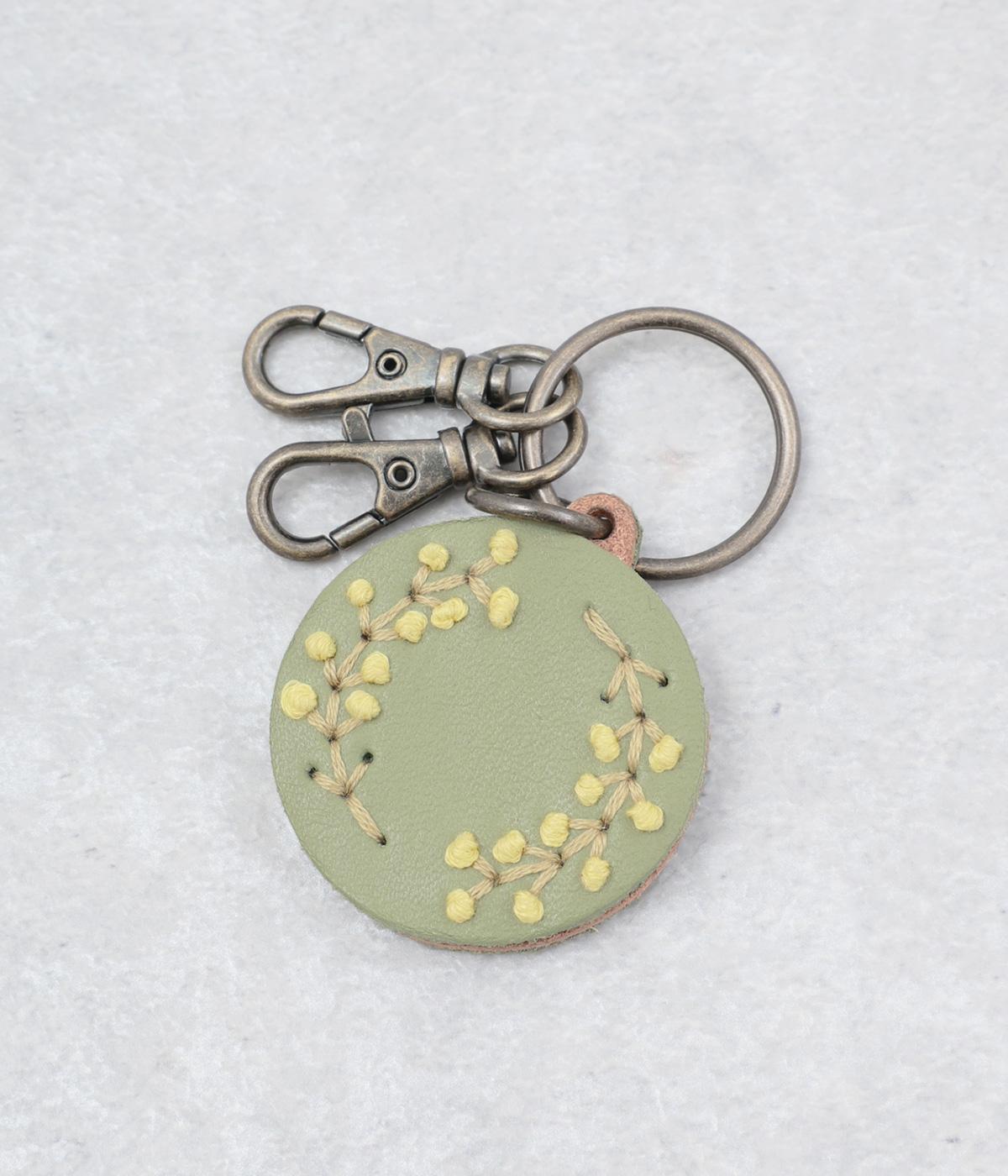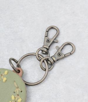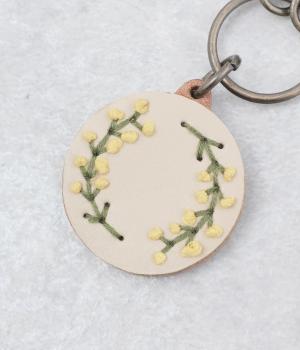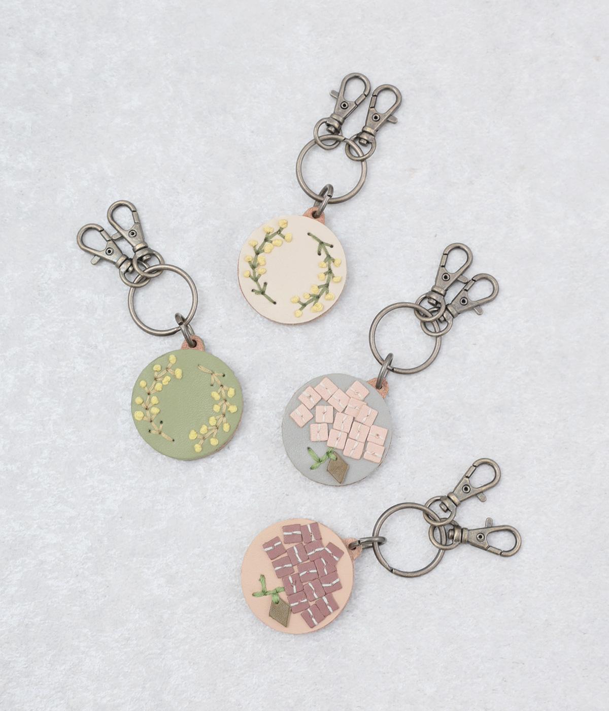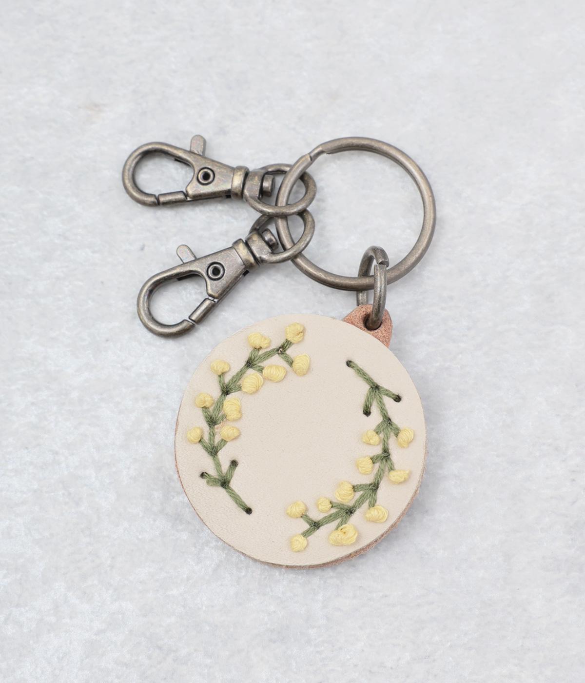 小ぶりながら存在感のあるキーリング。中央にボリュームをもたせた刺しゅうが引き立ち、クリームを挟んだビスケットのような側面が愛らしさを添えます。ミモザやアジサイなど彩り豊かなモチーフは、バッグやポーチにさりげないアクセントをプラスします。