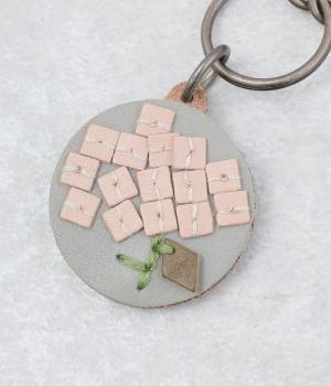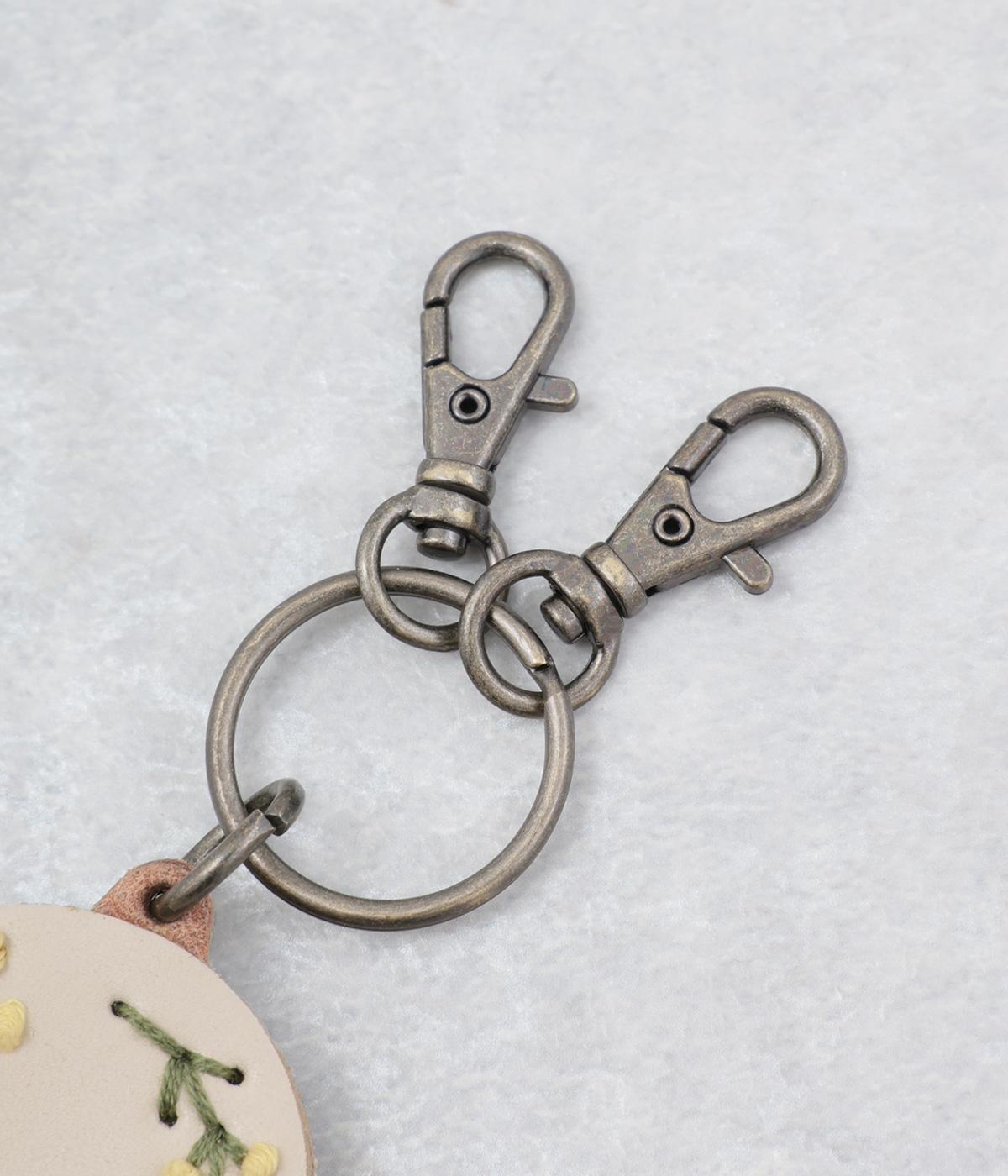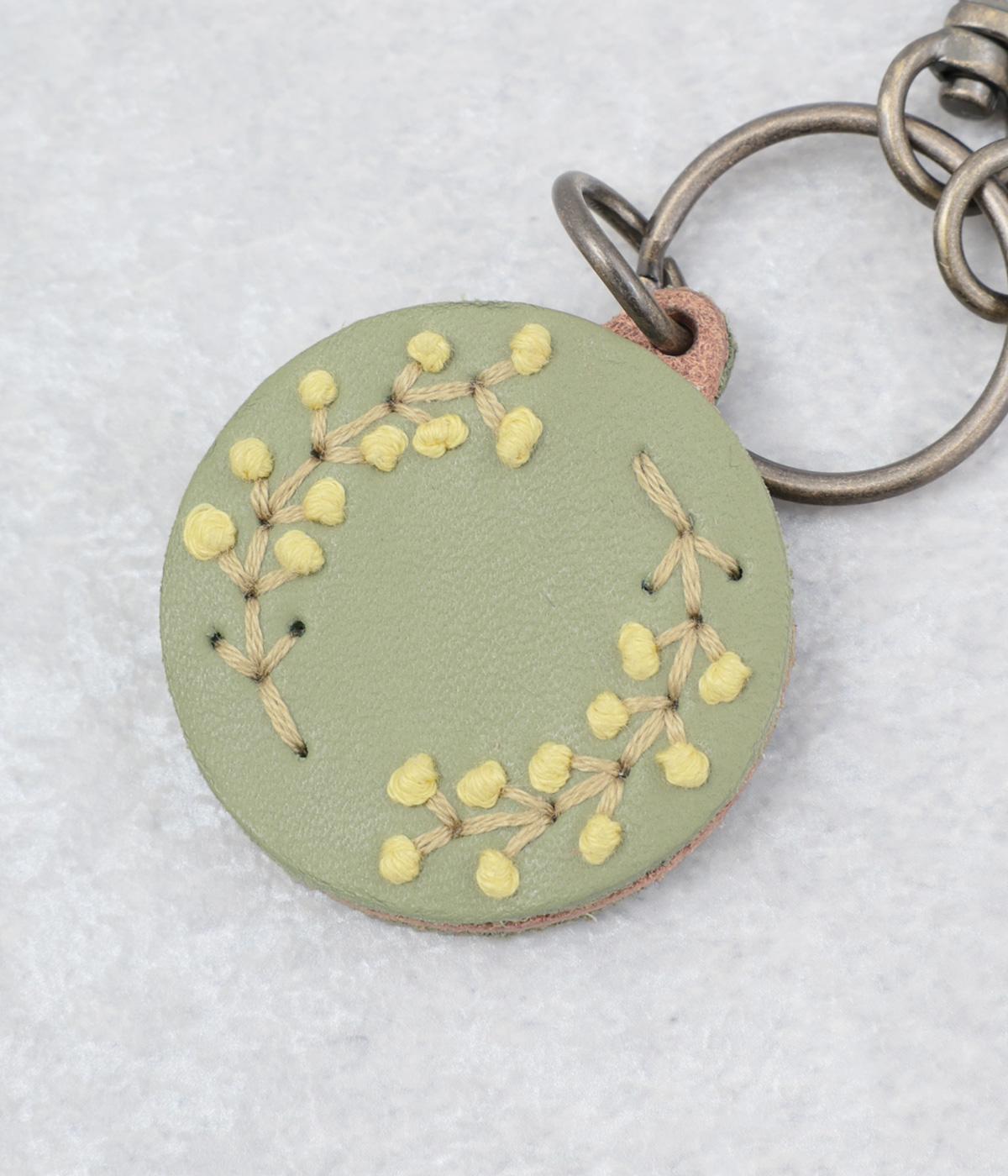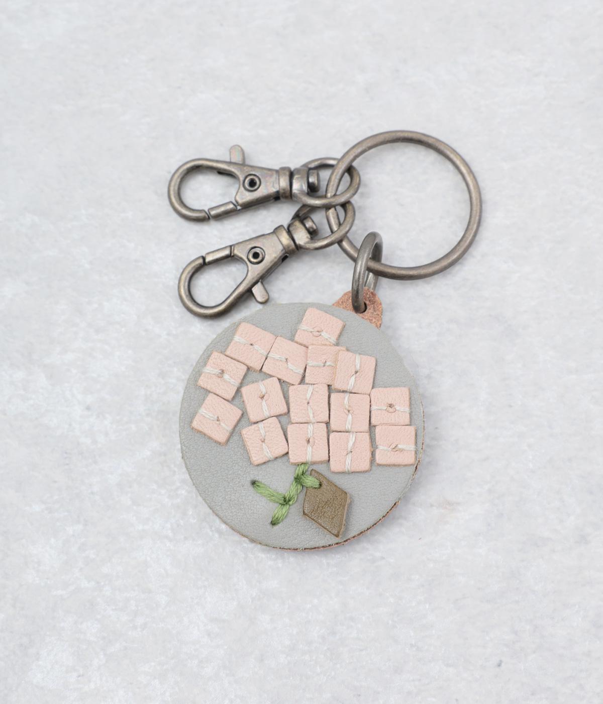 小ぶりながら存在感のあるキーリング。中央にボリュームをもたせた刺しゅうが引き立ち、クリームを挟んだビスケットのような側面が愛らしさを添えます。ミモザやアジサイなど彩り豊かなモチーフは、バッグやポーチにさりげないアクセントをプラスします。