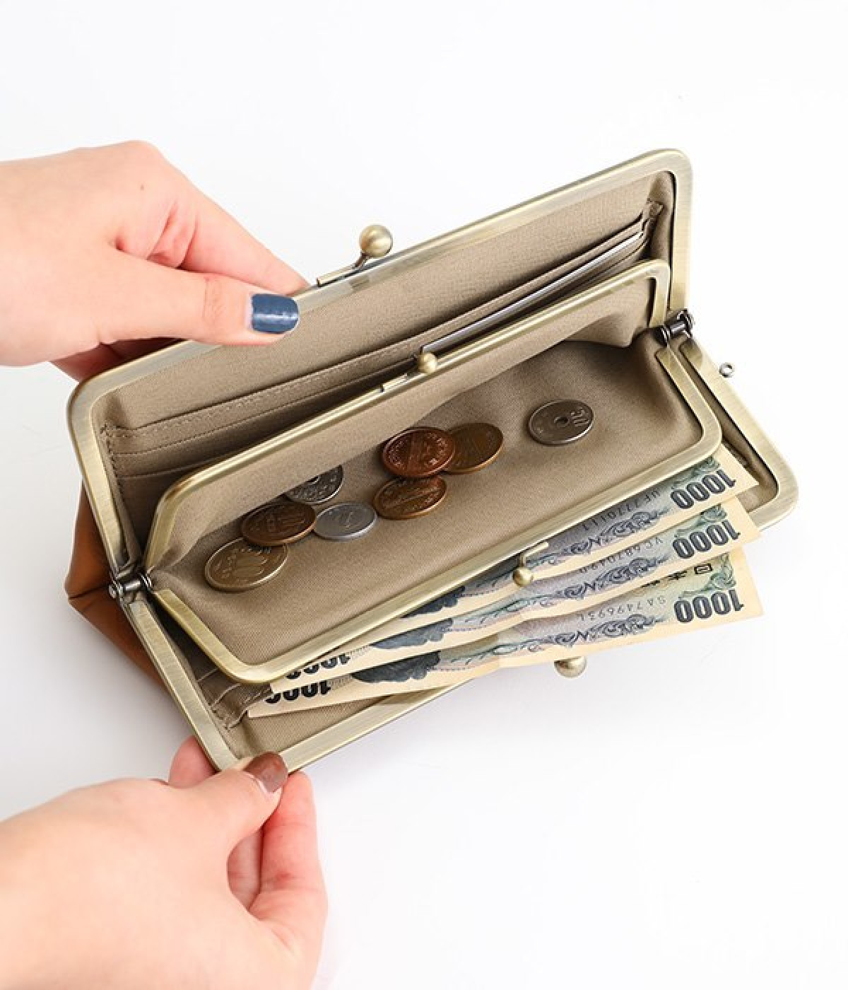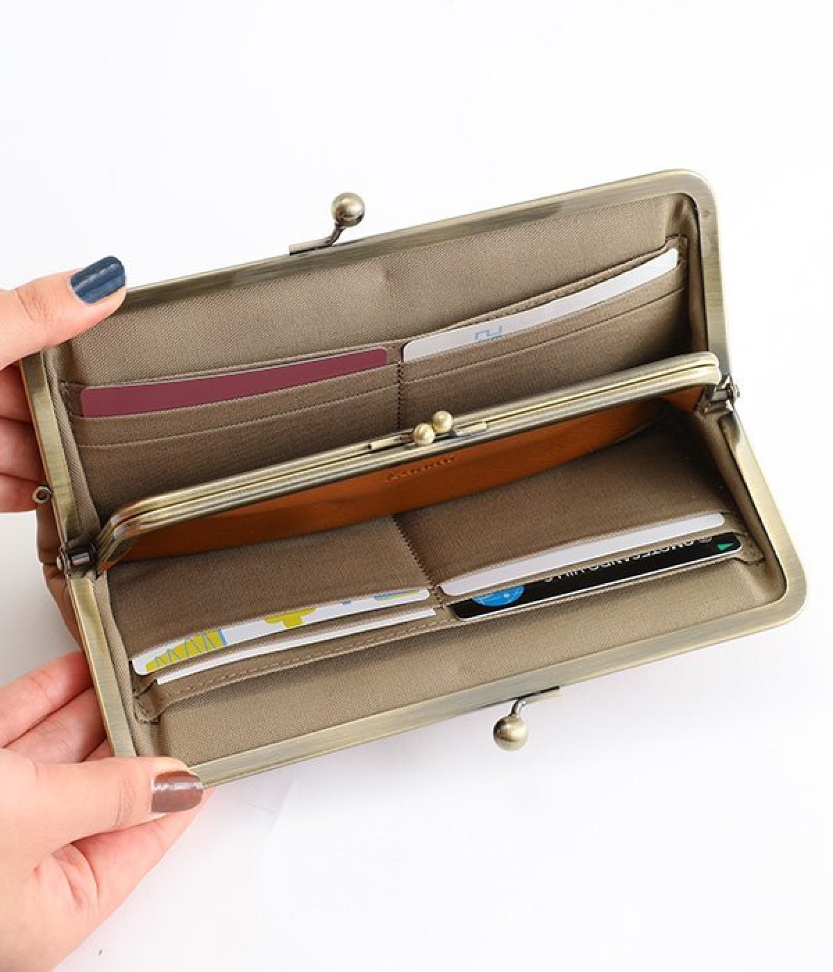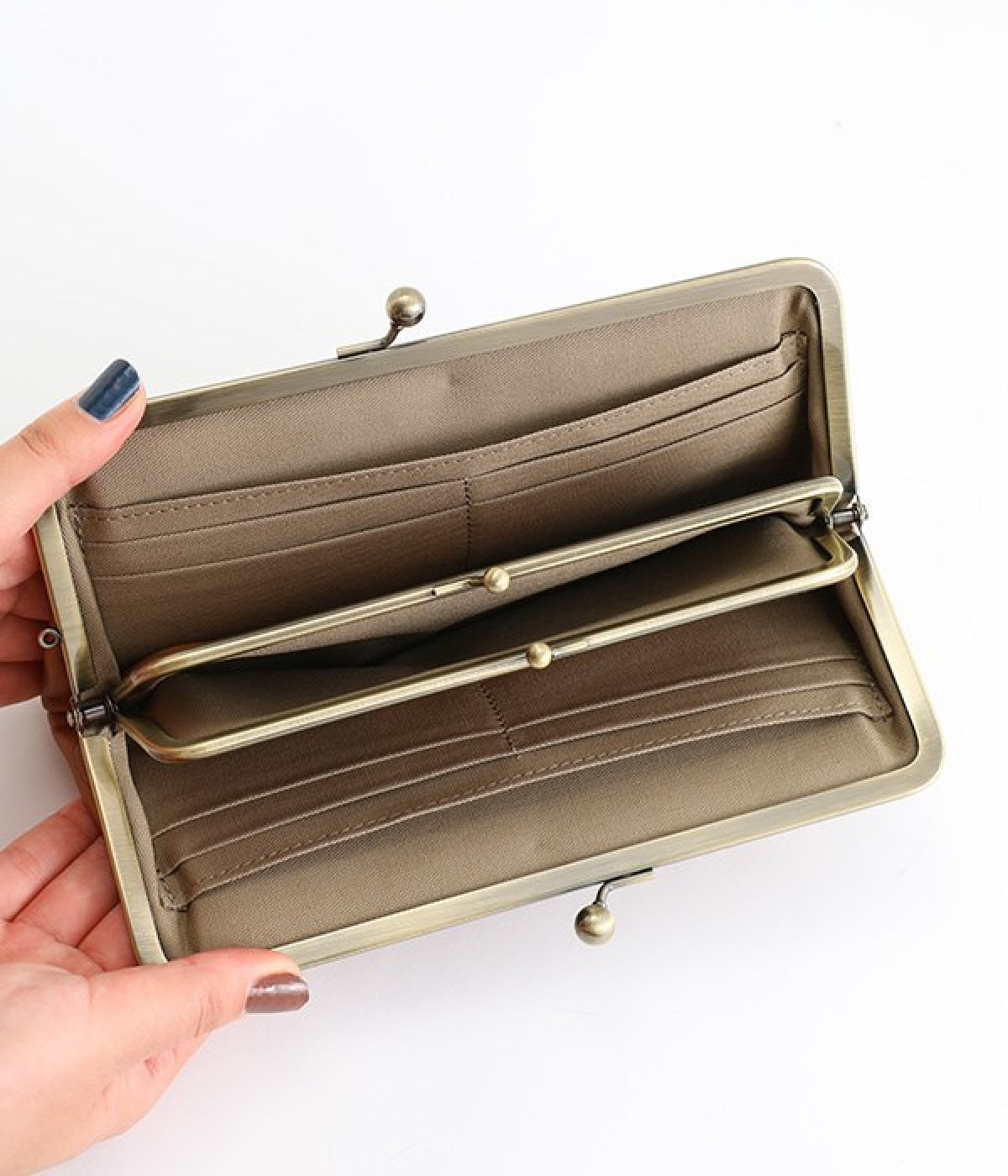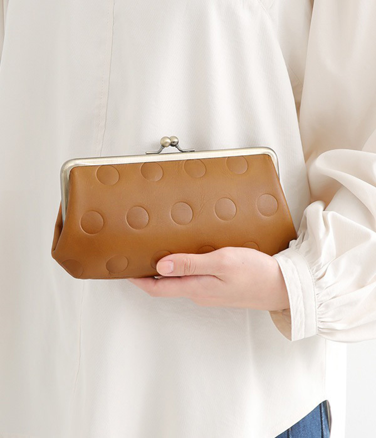 水玉をさりげなく効かせたロングウォレット。中にもがま口がついた親子がま口デザインで、見ためにもかわいらしく、使い勝手も◎です。ふっくらとしたやさしいフォルムながら、ぺたんこですっきりと使えてバッグの中でもかさばりません。カード入れが充実しているのもうれしいポイント。上質な本革仕様で、使い続けるほどに味が出て愛着の湧くアイテムです。