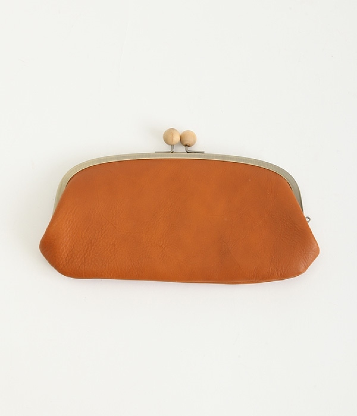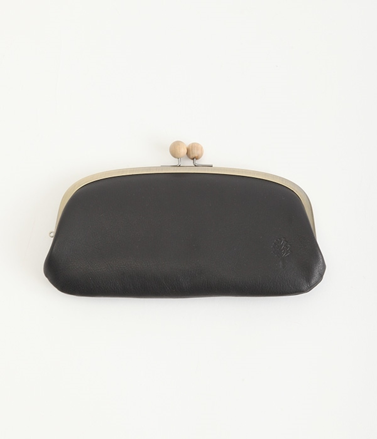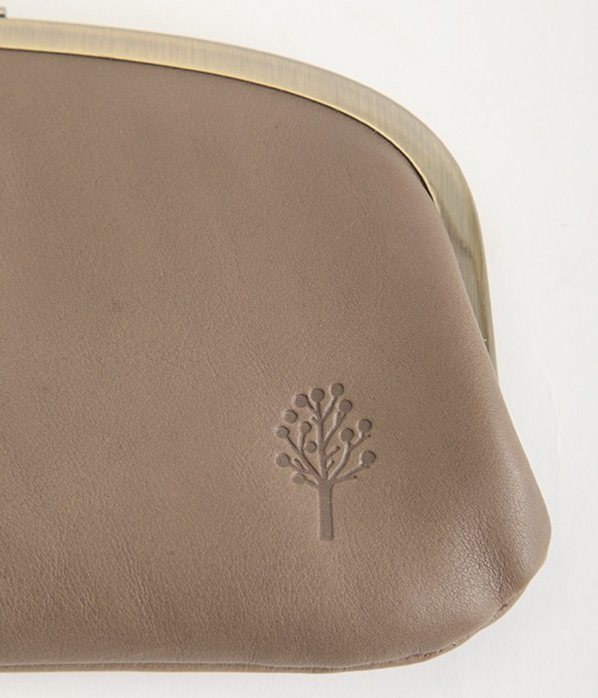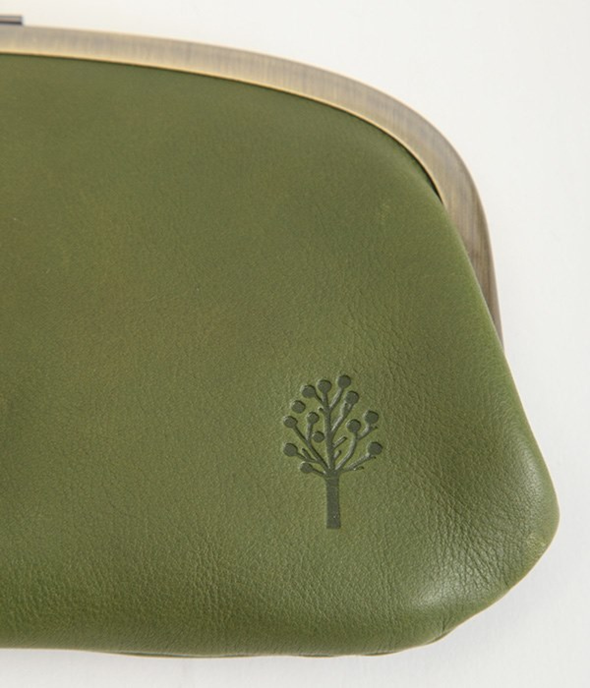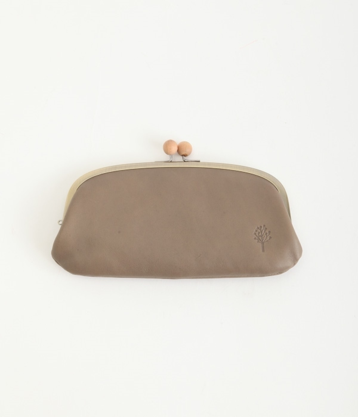内部にコンパクトなサイズのがま口を設けた、二重構造のがま口財布です。お札もすっぽり収まる横長のフォルムで、カード入れも豊富に設けた整理整頓が楽ちんなデザイン。片面の右端には木のモチーフの型押しをあしらいました。マットな質感の牛革製で、つまみの部分には桜の木玉を採用。使い込むほどに経年変化によって風合いが増し、味わい深い表情が楽しめます。