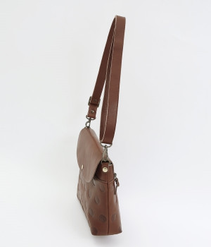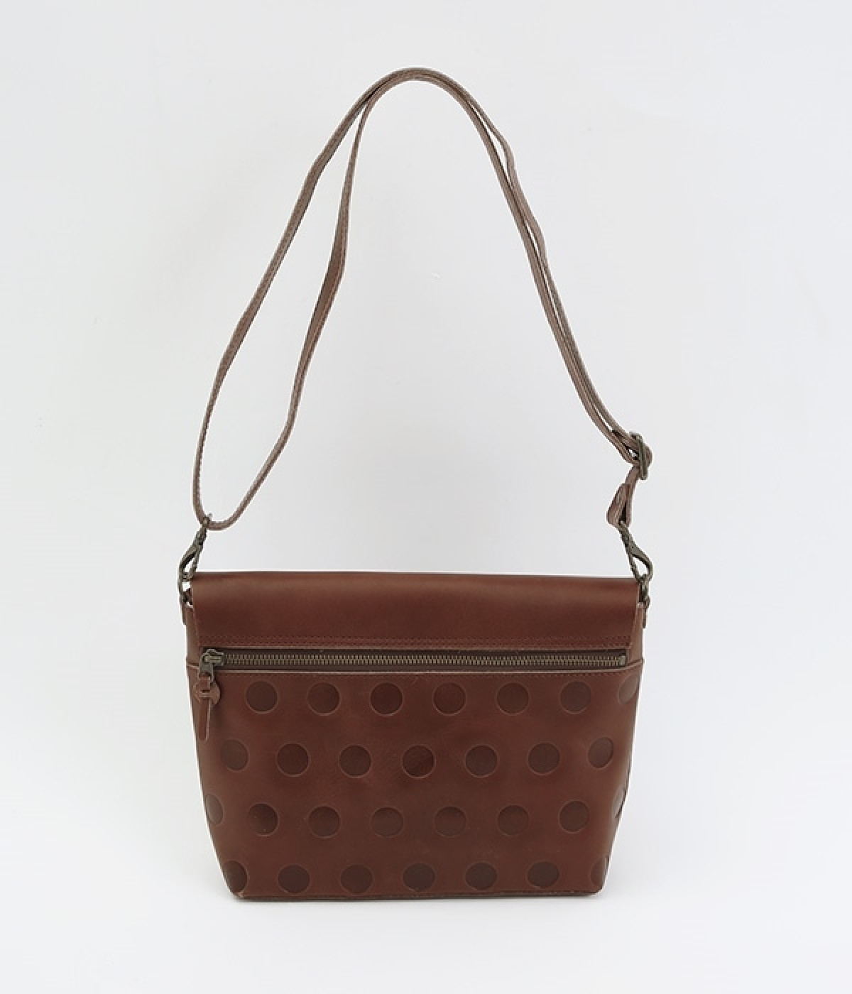 キャンディのような水玉模様がかわいらしいショルダーバッグ。しなやかでハリのある牛革を使用し、使い込むほど味わい深い表情へと変化が楽しめます。内側は小物の整理に便利な二つの内ポケットつき。大事なものを収納できる背面ファスナーをあしらい、口が大きくひらくので出し入れもスムーズです。ストラップを短めにして斜めに背負えばメッセンジャーバッグとしても大活躍。両手をあけて身軽に歩きたい、そんな日にもぴったりです。