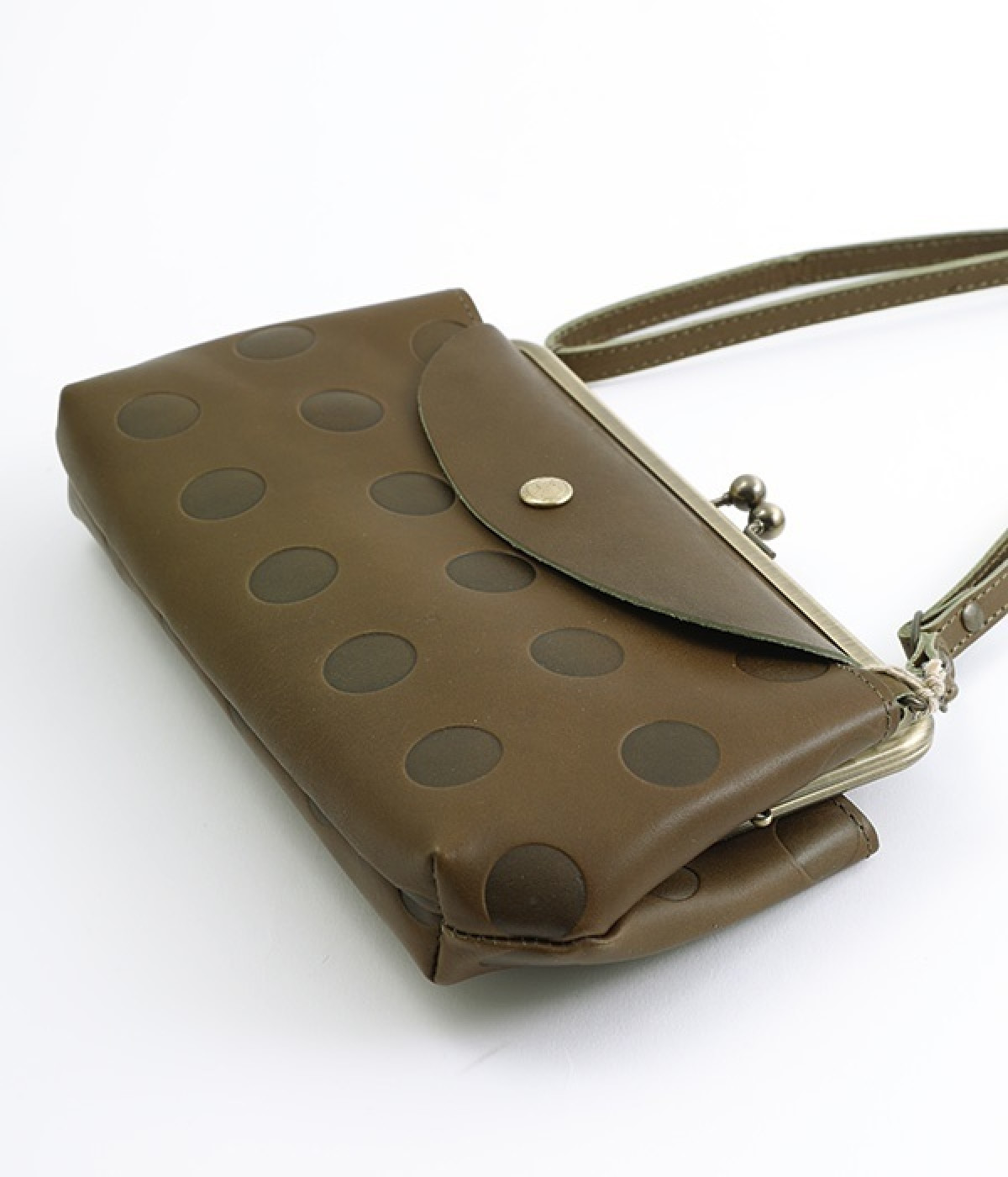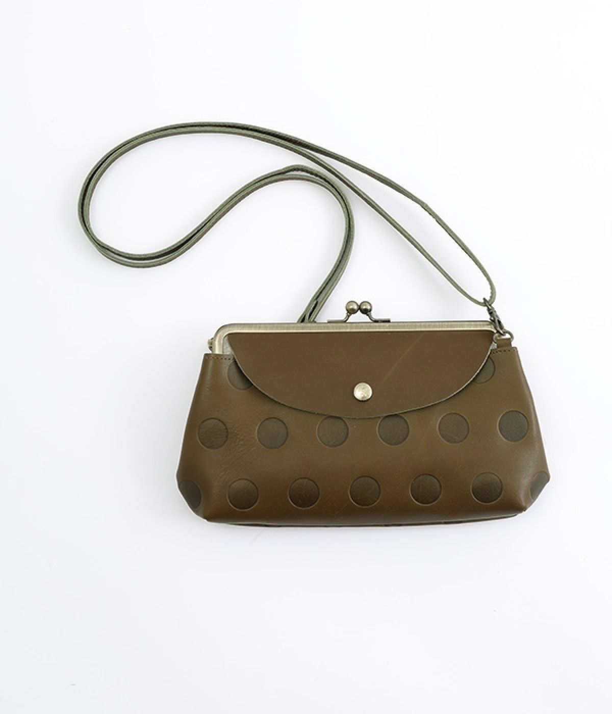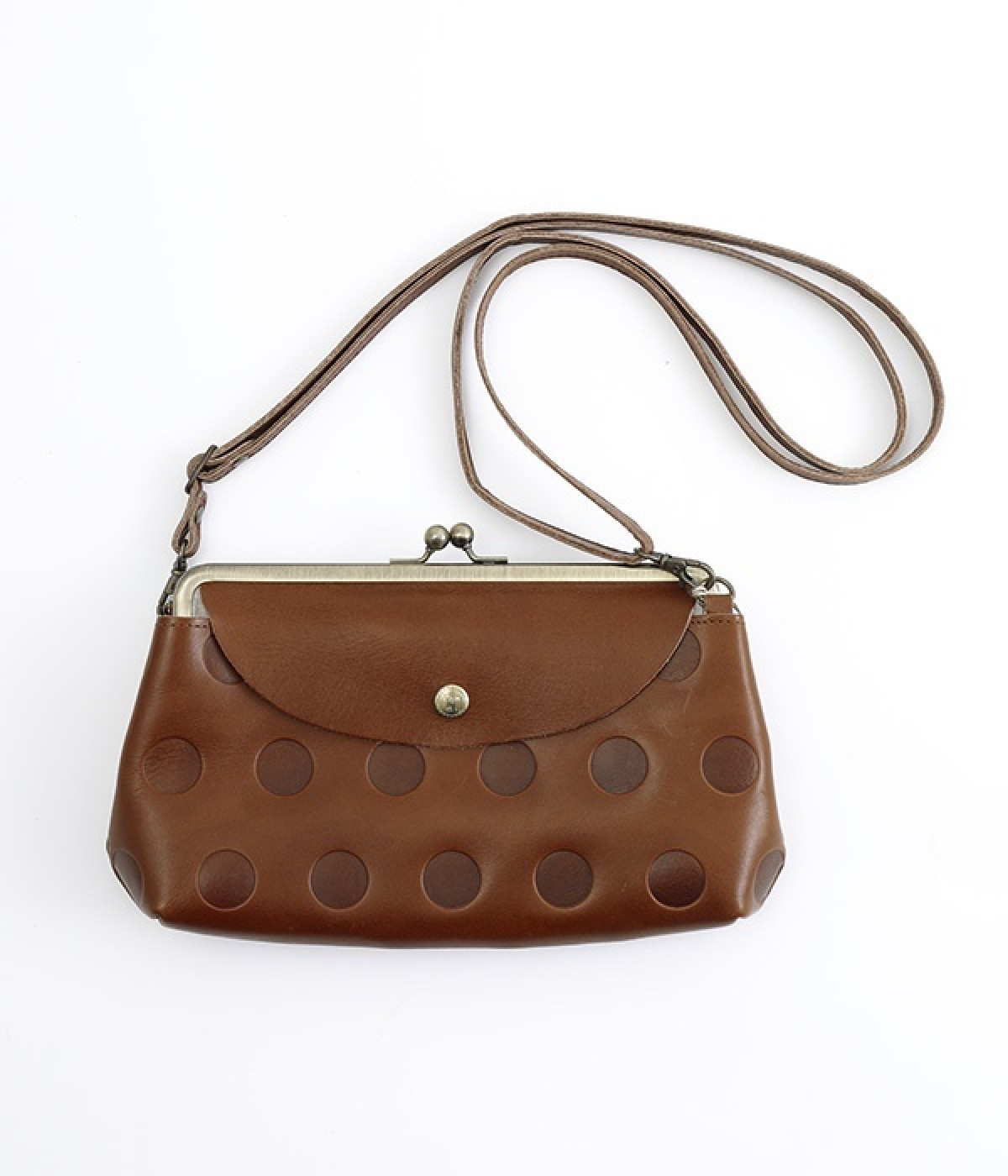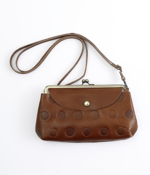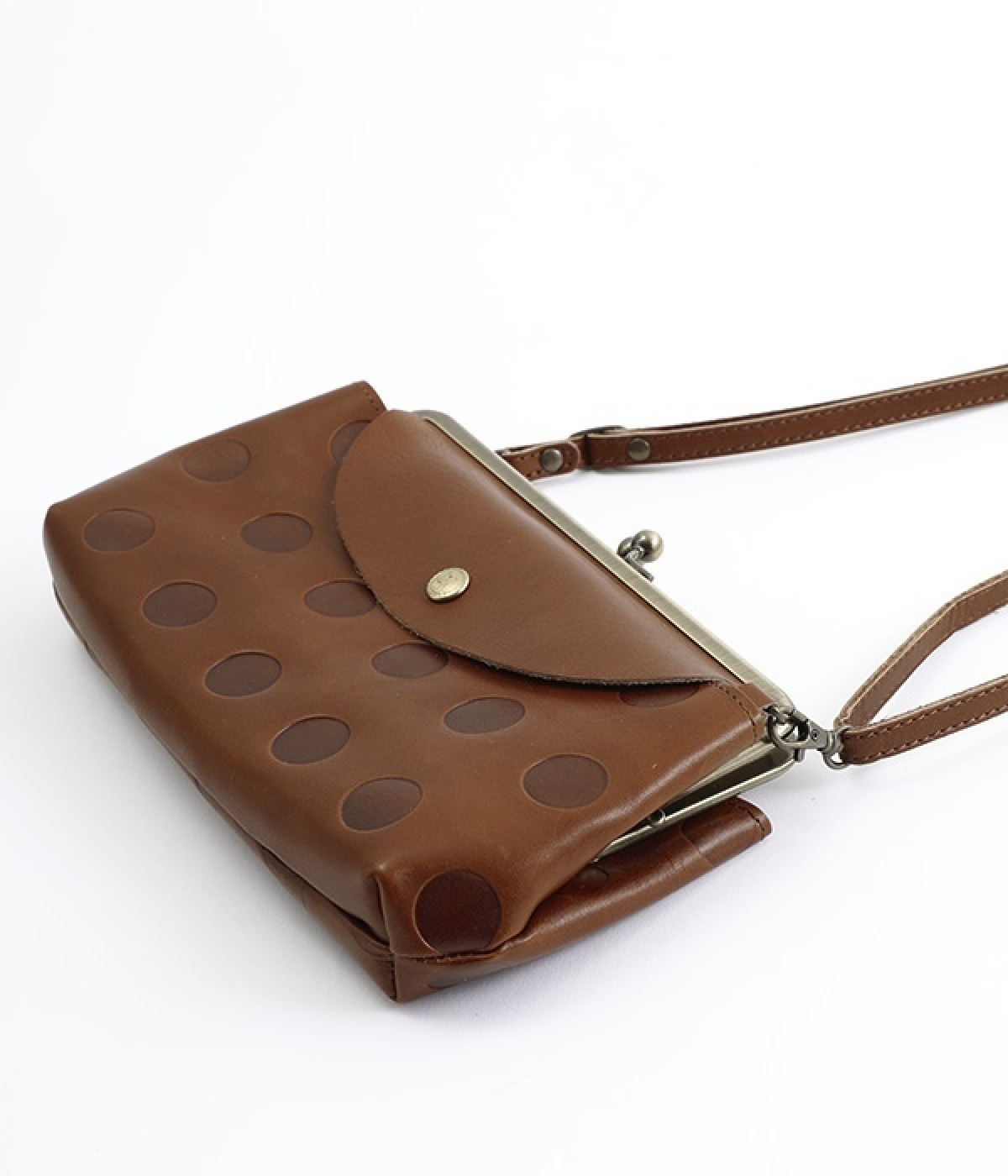 柔らかな手ざわりのカウレザーに、かわいらしいドットの型押しを施したがま口タイプのお財布ポシェットです。内側にはカードポケットと小銭が入るがま口の仕切りがあり、中身の整理が楽に行えます。外側には両面に蓋つきのポケットを備え、スマートフォンや鍵などを入れても◎。ショルダー紐は取り外し可能なので、いつもはバッグの中に入れてお財布にしたり、ランチやちょっとしたおでかけには斜めがけにと便利に使えます。