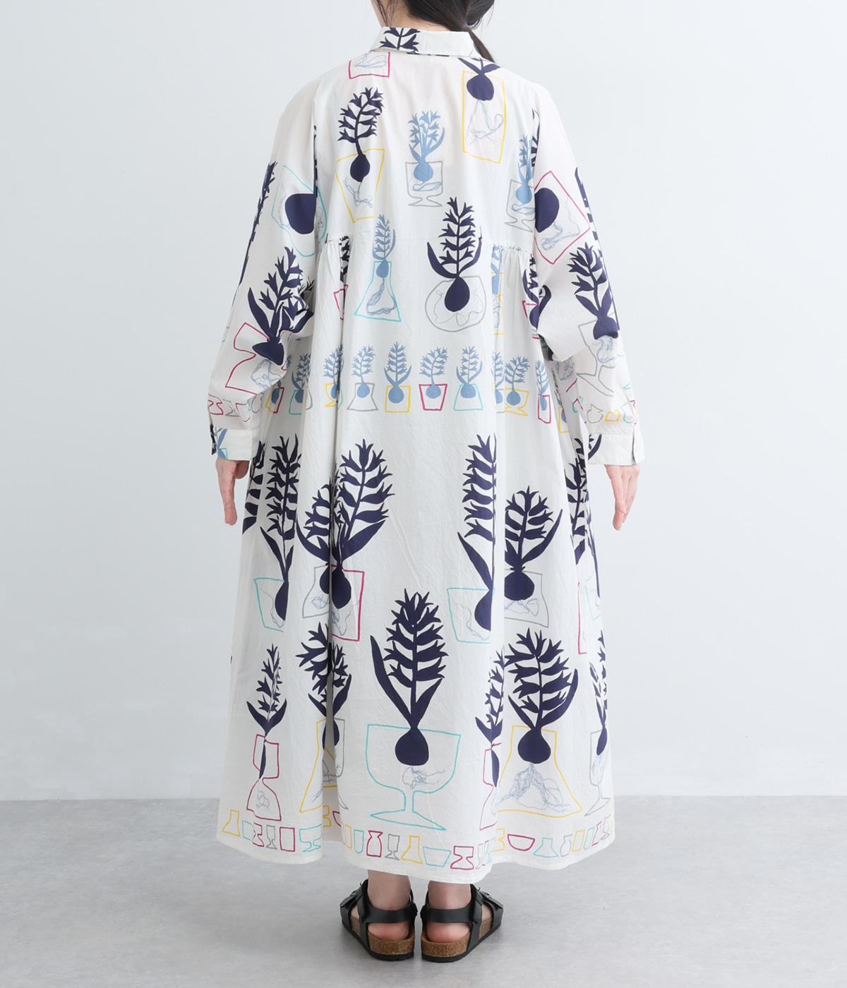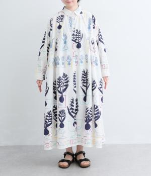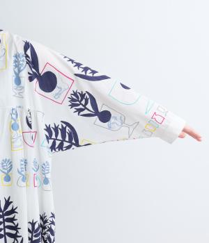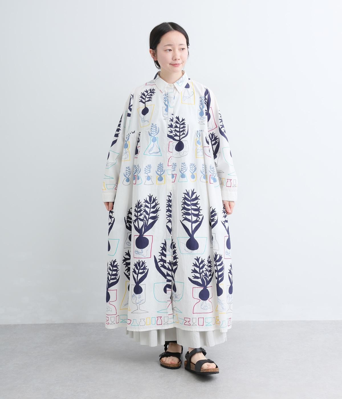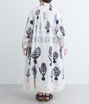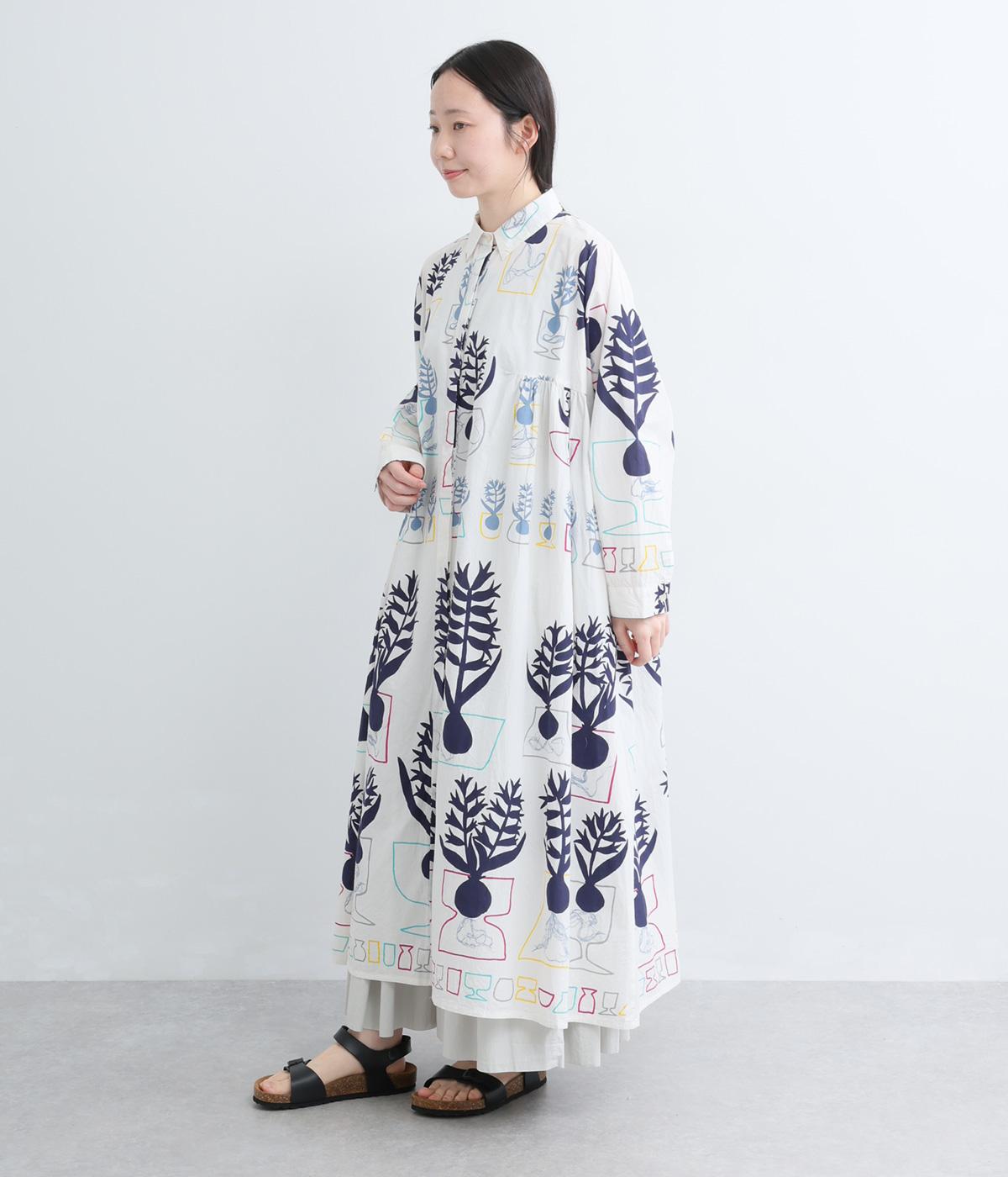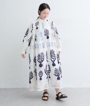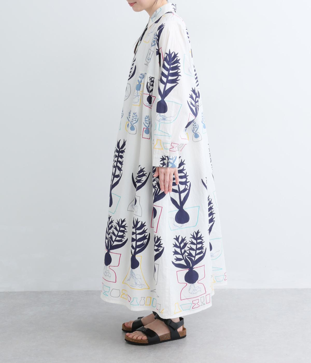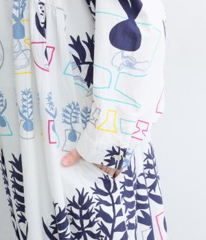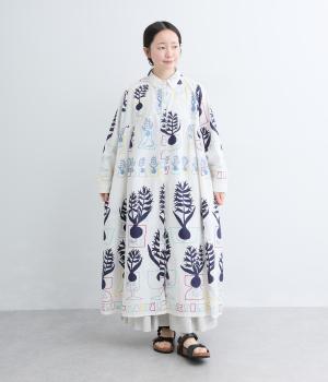 球根の根っこまで描かれたヒヤシンスがシュールさと愛らしさをまとうワンピース。たっぷりと広がる裾まわりが、ハリのある生地で立体的なシルエットを描きます。装いの主役になる、存在感あふれる特別な一枚です。