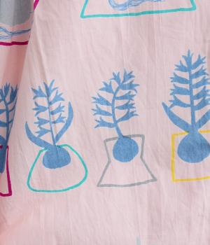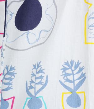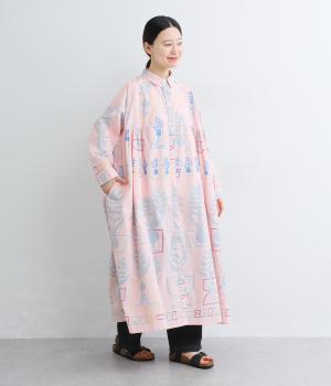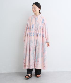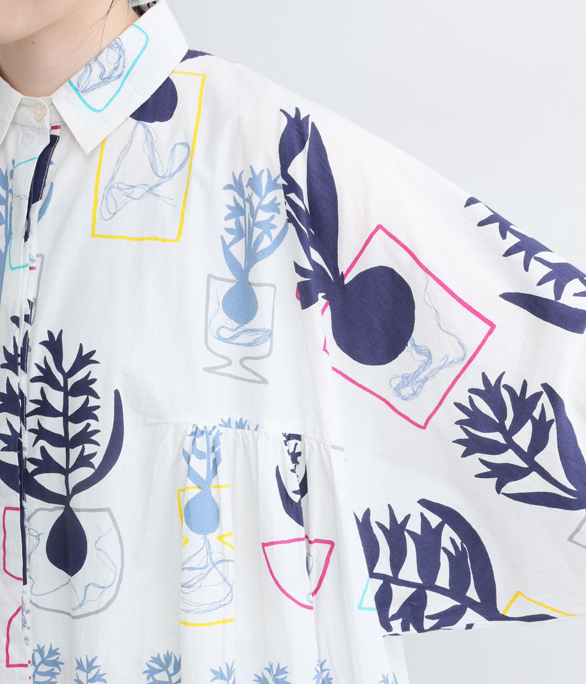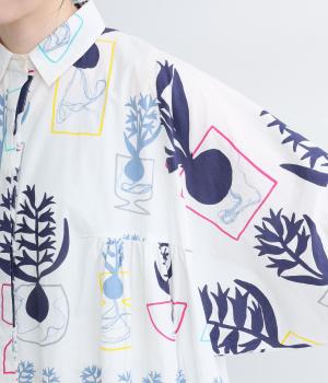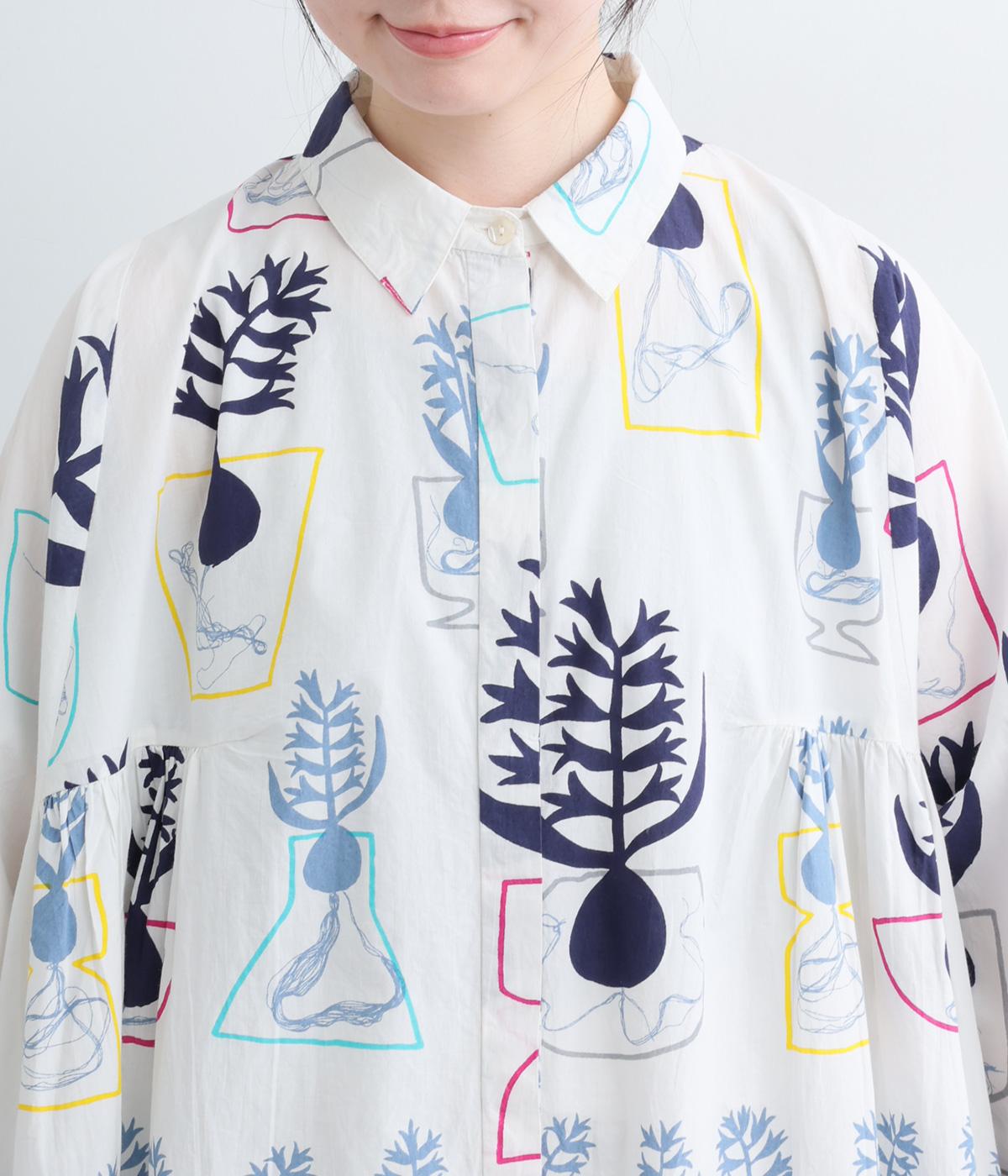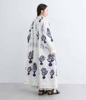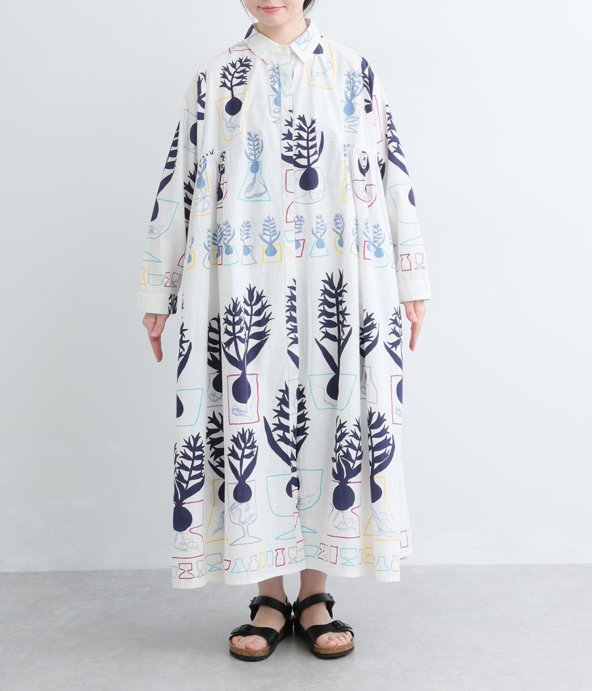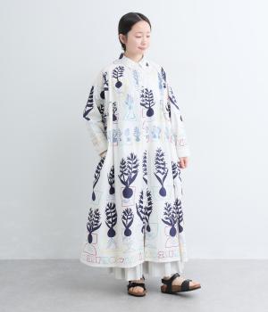 球根の根っこまで描かれたヒヤシンスがシュールさと愛らしさをまとうワンピース。たっぷりと広がる裾まわりが、ハリのある生地で立体的なシルエットを描きます。装いの主役になる、存在感あふれる特別な一枚です。