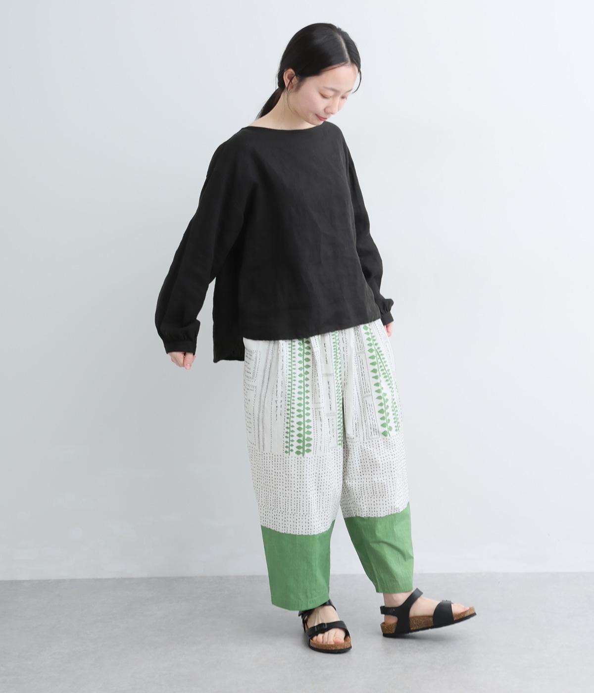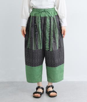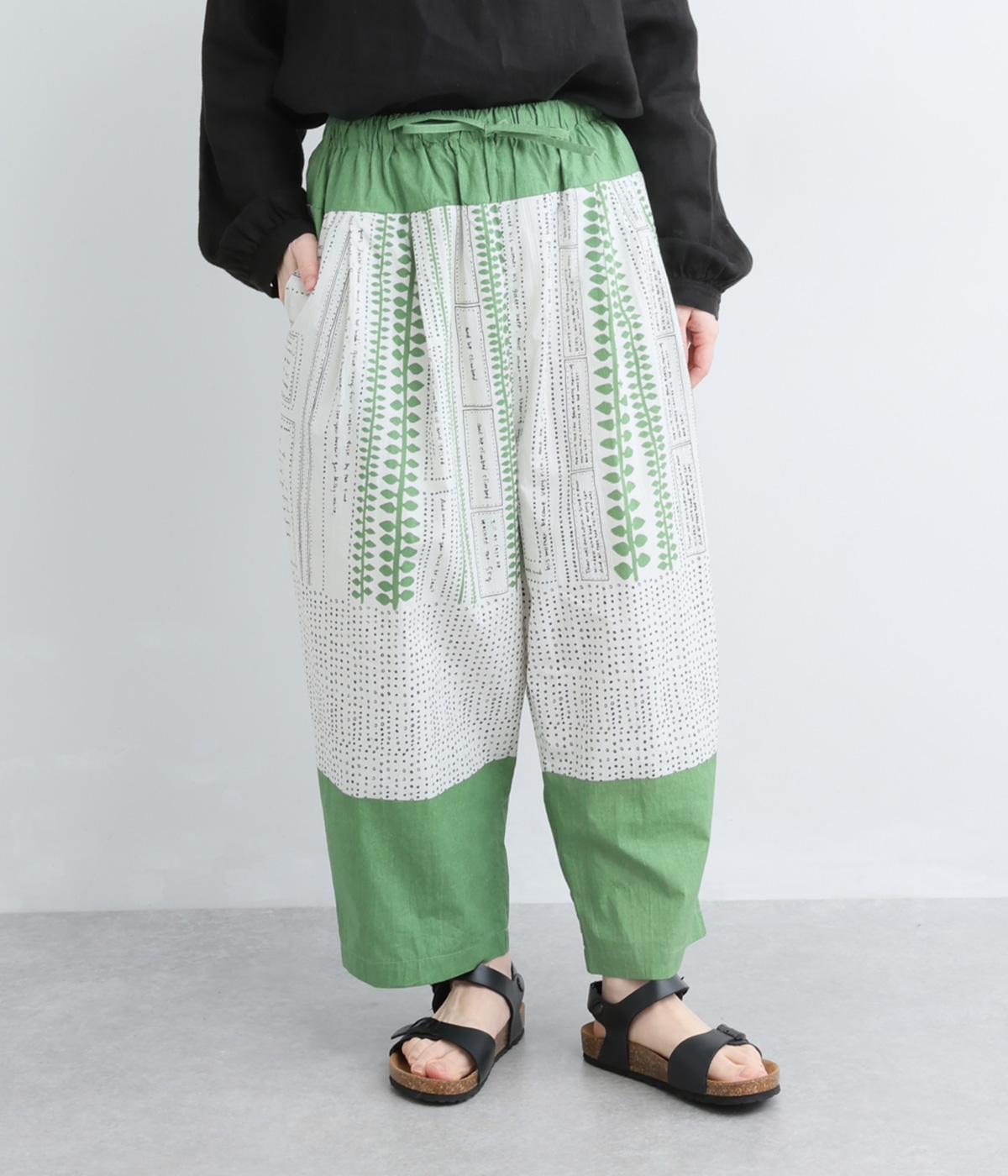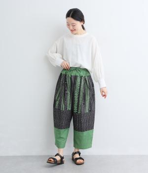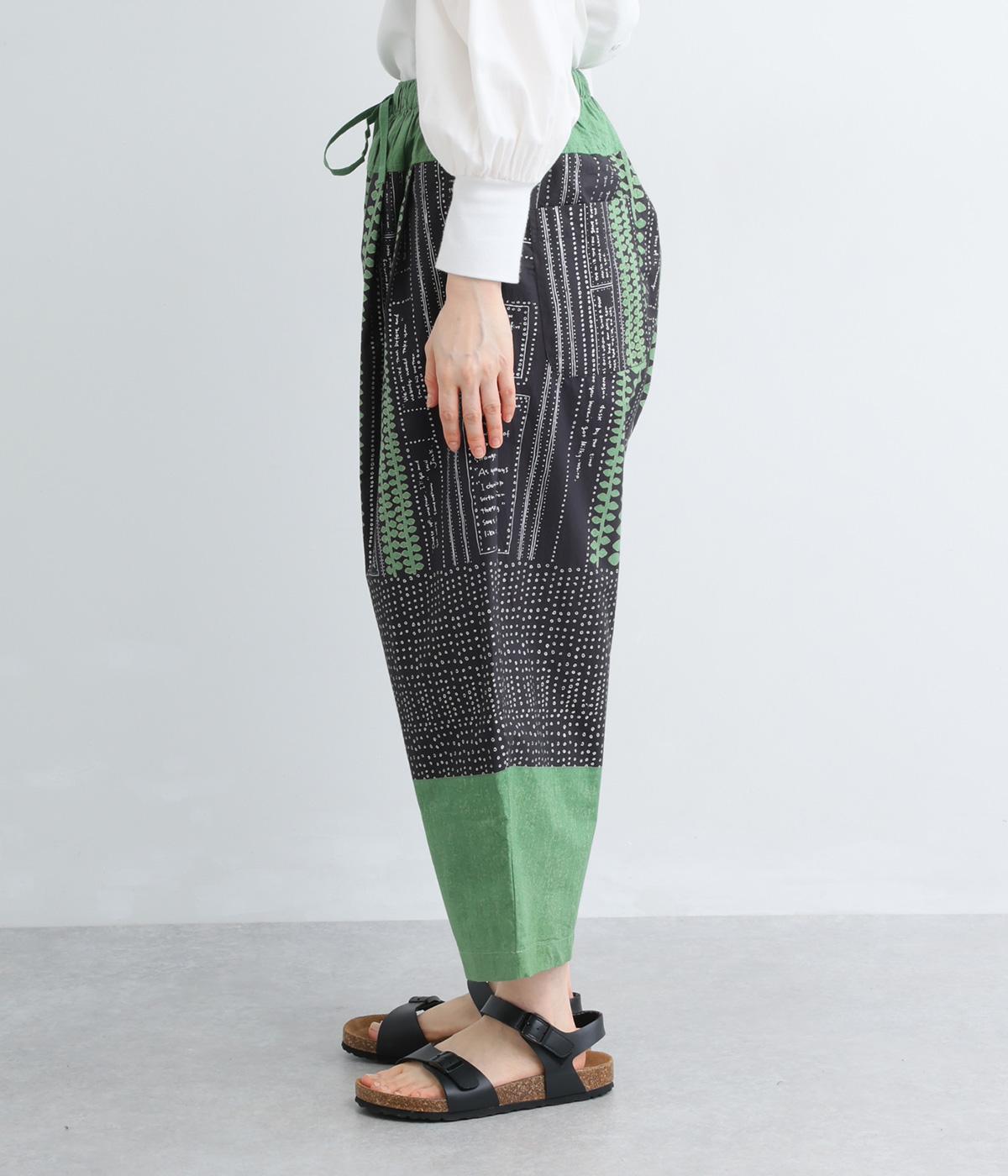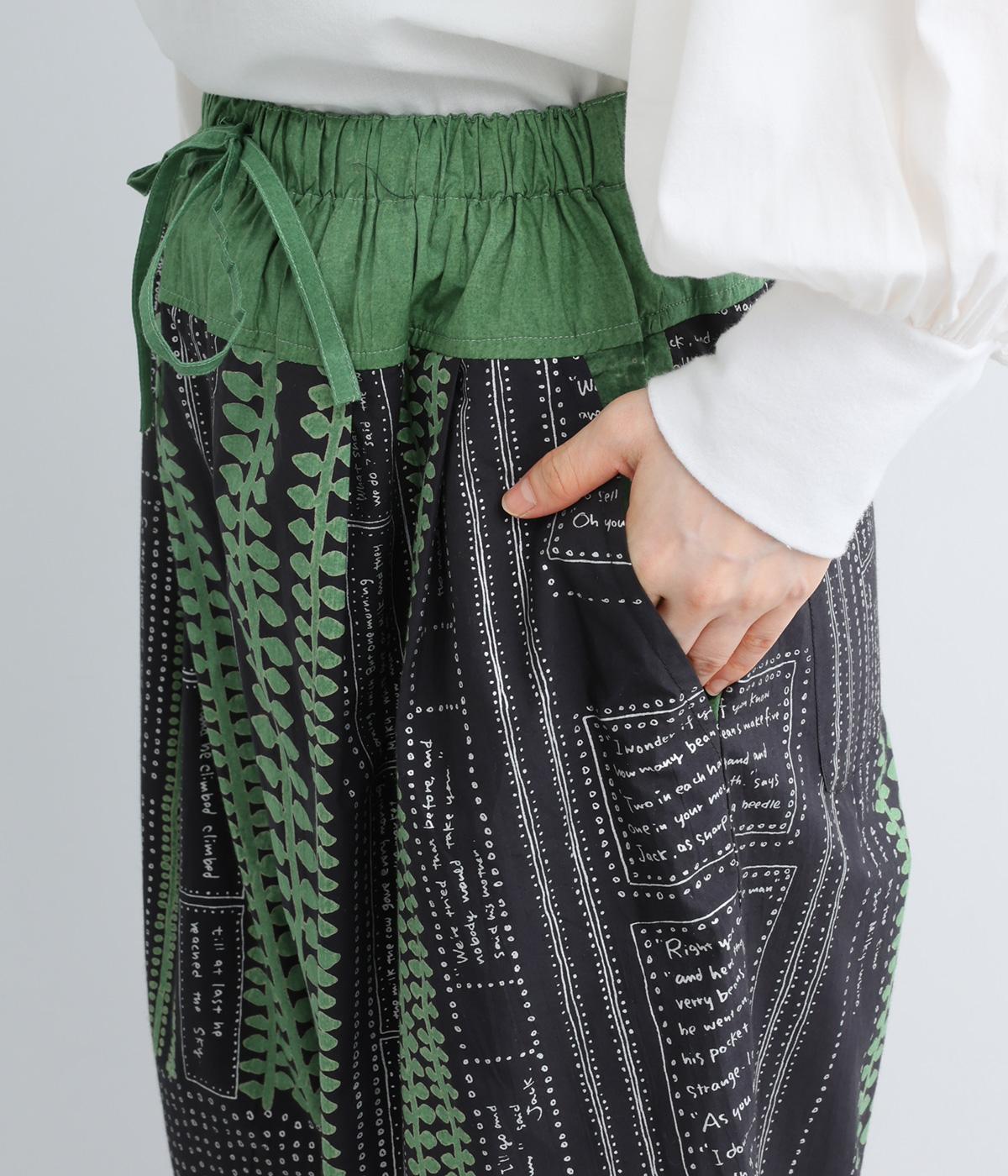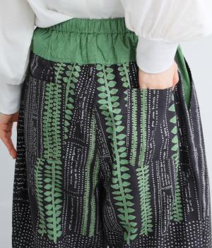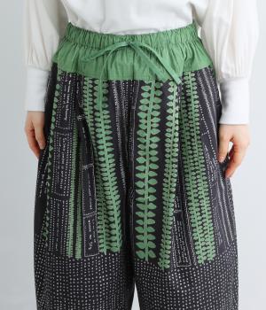 宮崎のアトリエで仕立て屋を営むcoco madeさんとのコラボレーション。童話「ジャックと豆の木」をモチーフにしたテキスタイルが温かな雰囲気をまといます。ウエストはゴム仕様で、裏地を配した安心感のある穿き心地です。