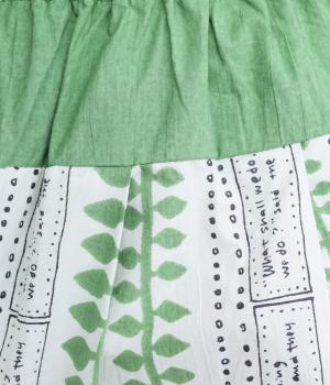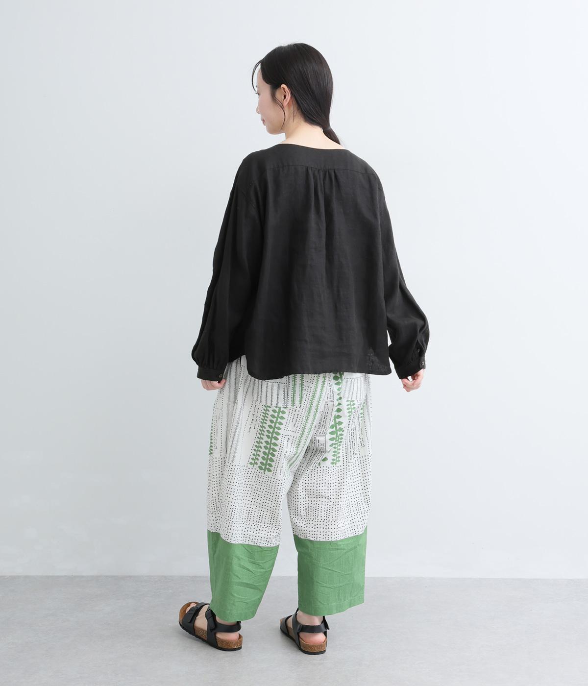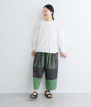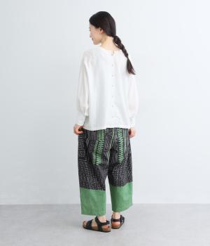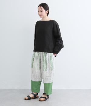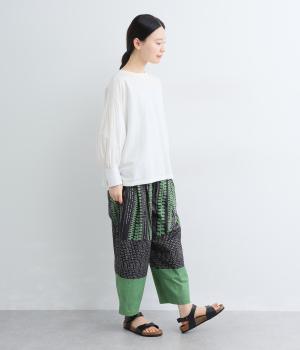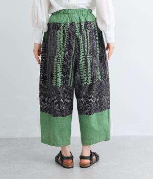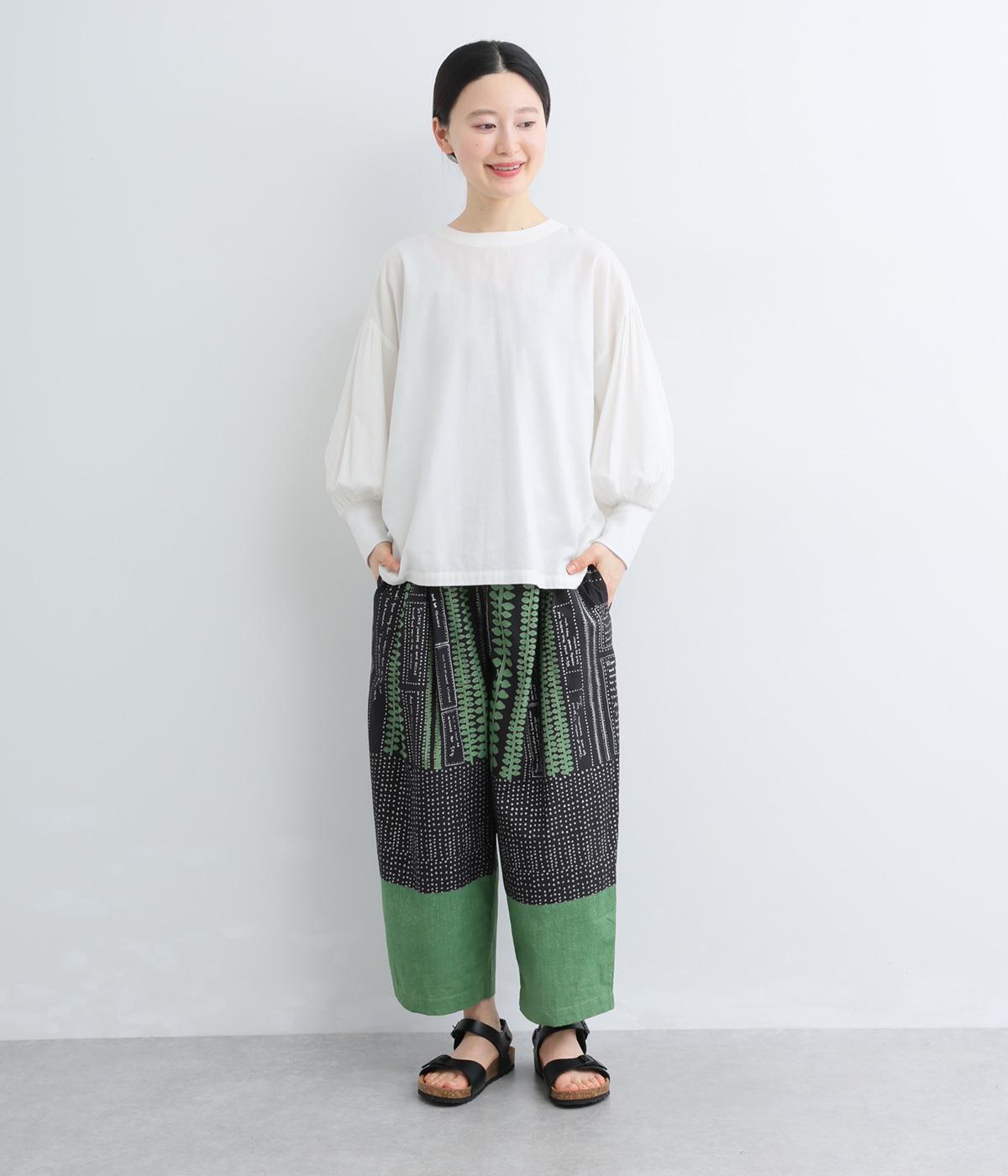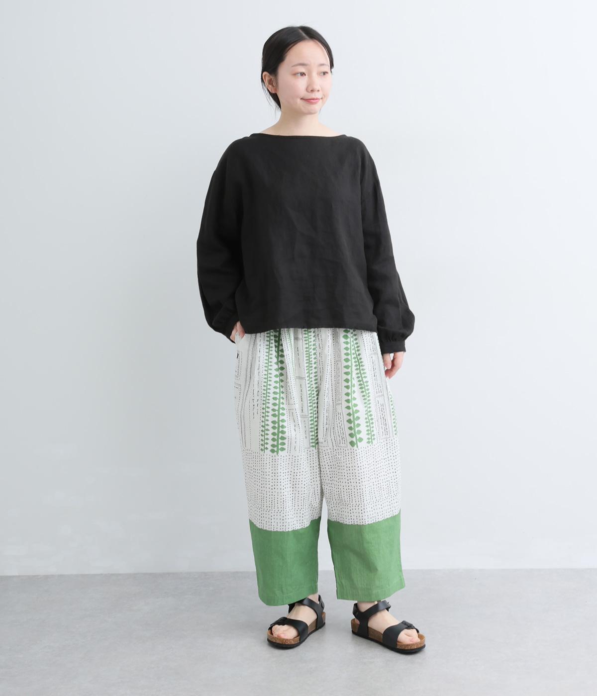 宮崎のアトリエで仕立て屋を営むcoco madeさんとのコラボレーション。童話「ジャックと豆の木」をモチーフにしたテキスタイルが温かな雰囲気をまといます。ウエストはゴム仕様で、裏地を配した安心感のある穿き心地です。