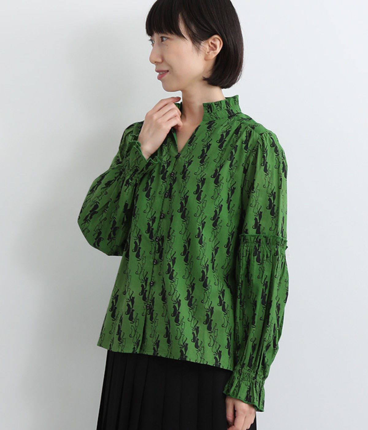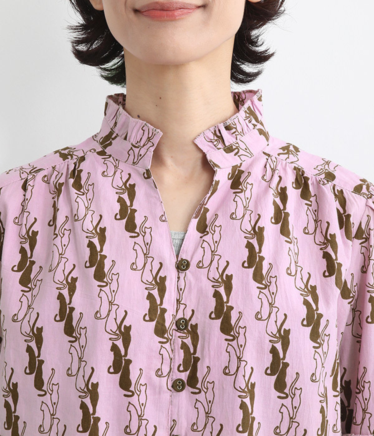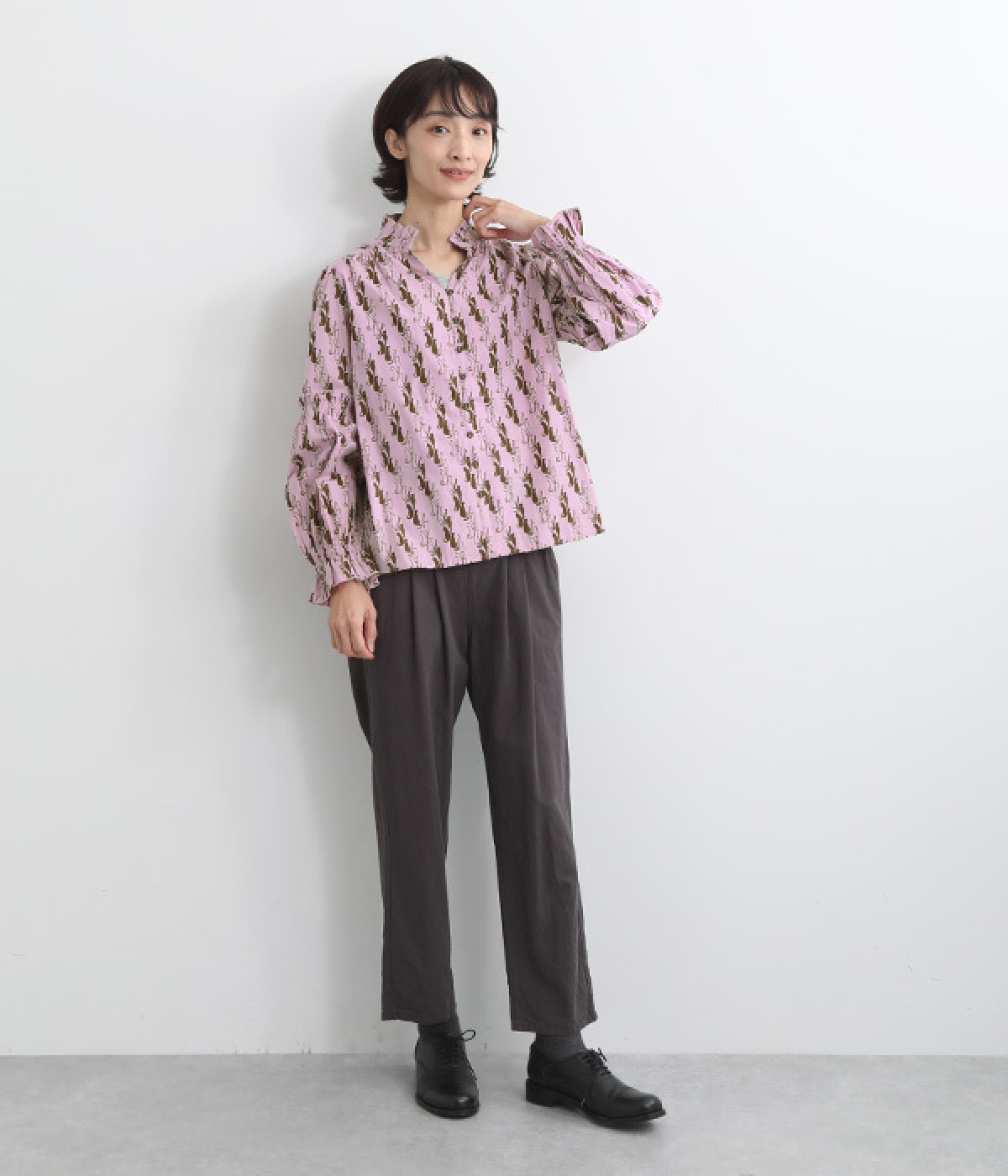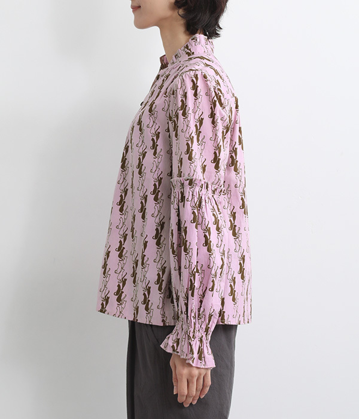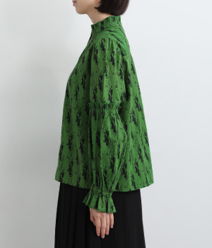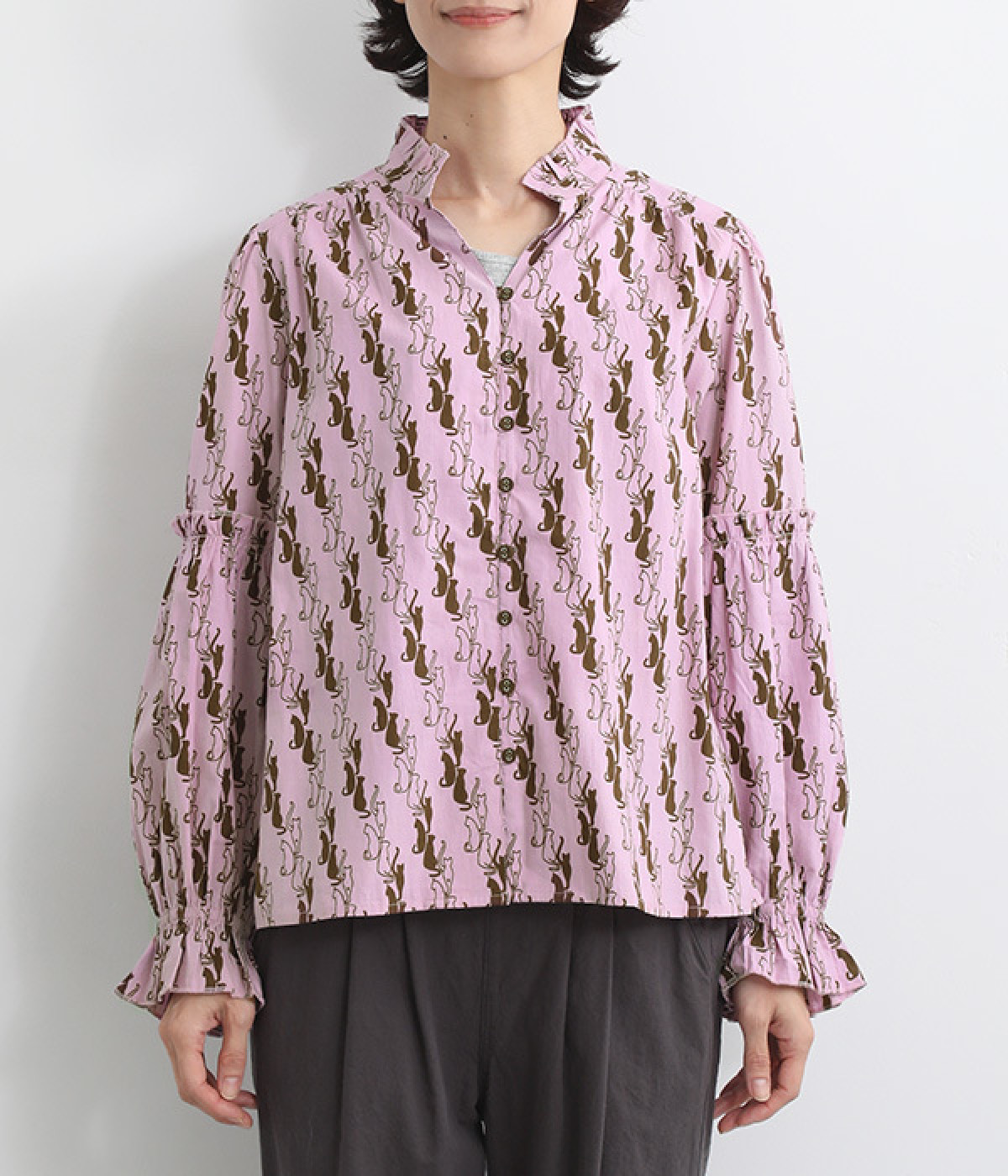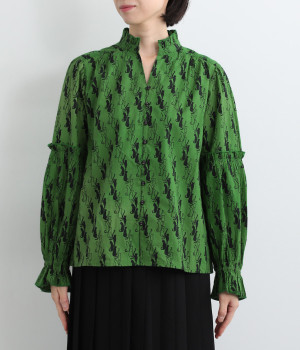 華やかさを演出する、スタンド襟&袖のフリル仕立て