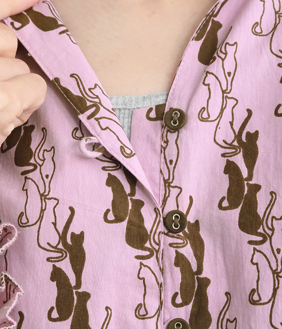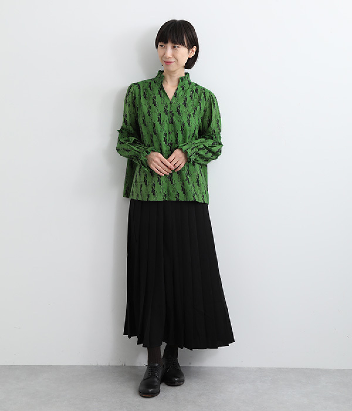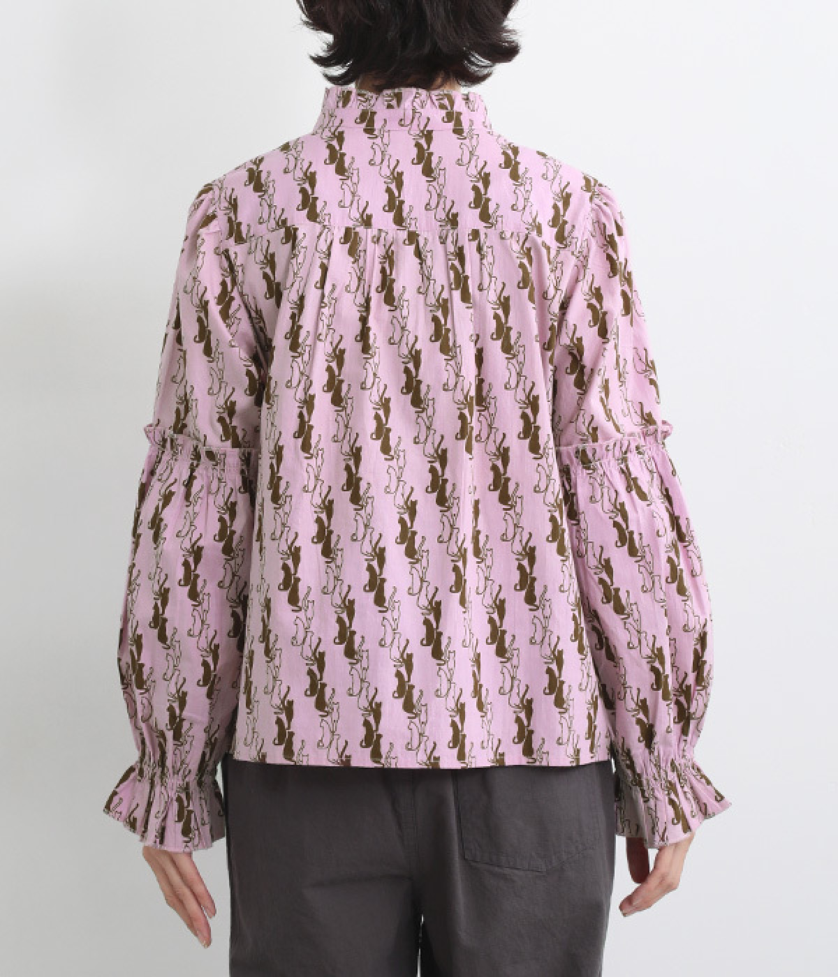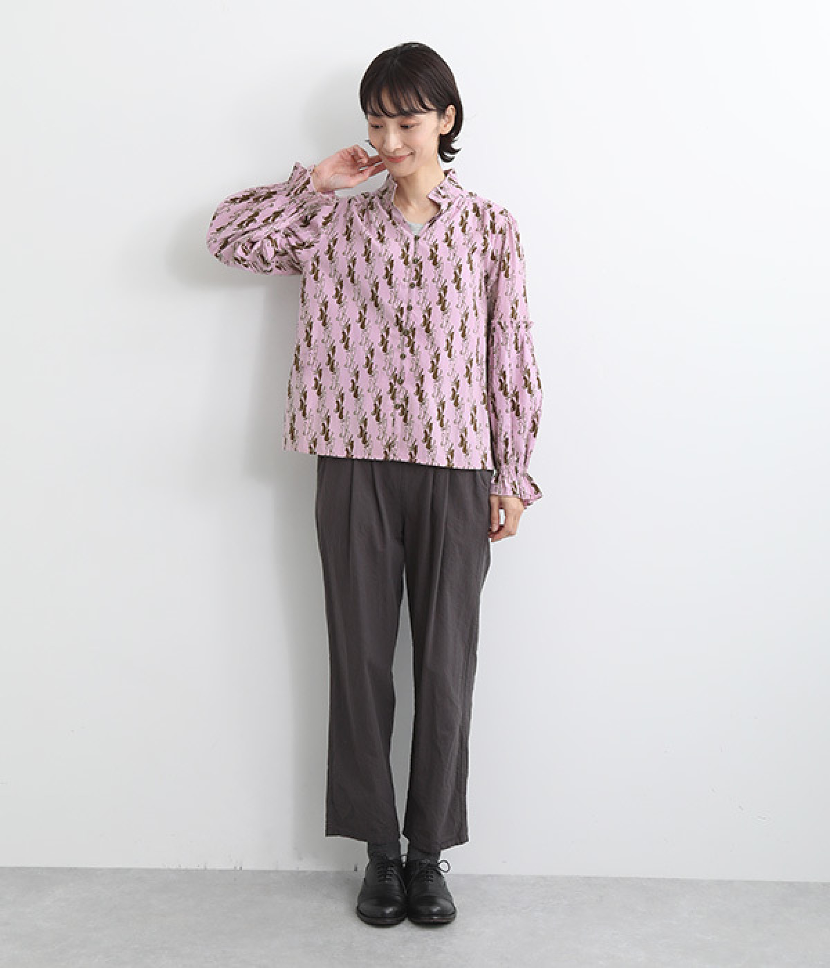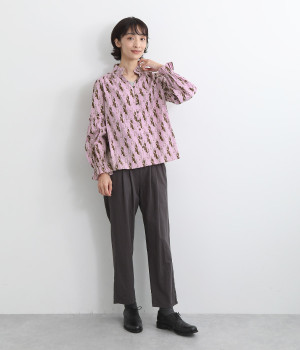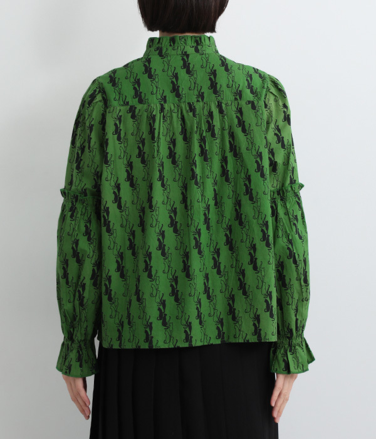 華やかさを演出する、スタンド襟&袖のフリル仕立て