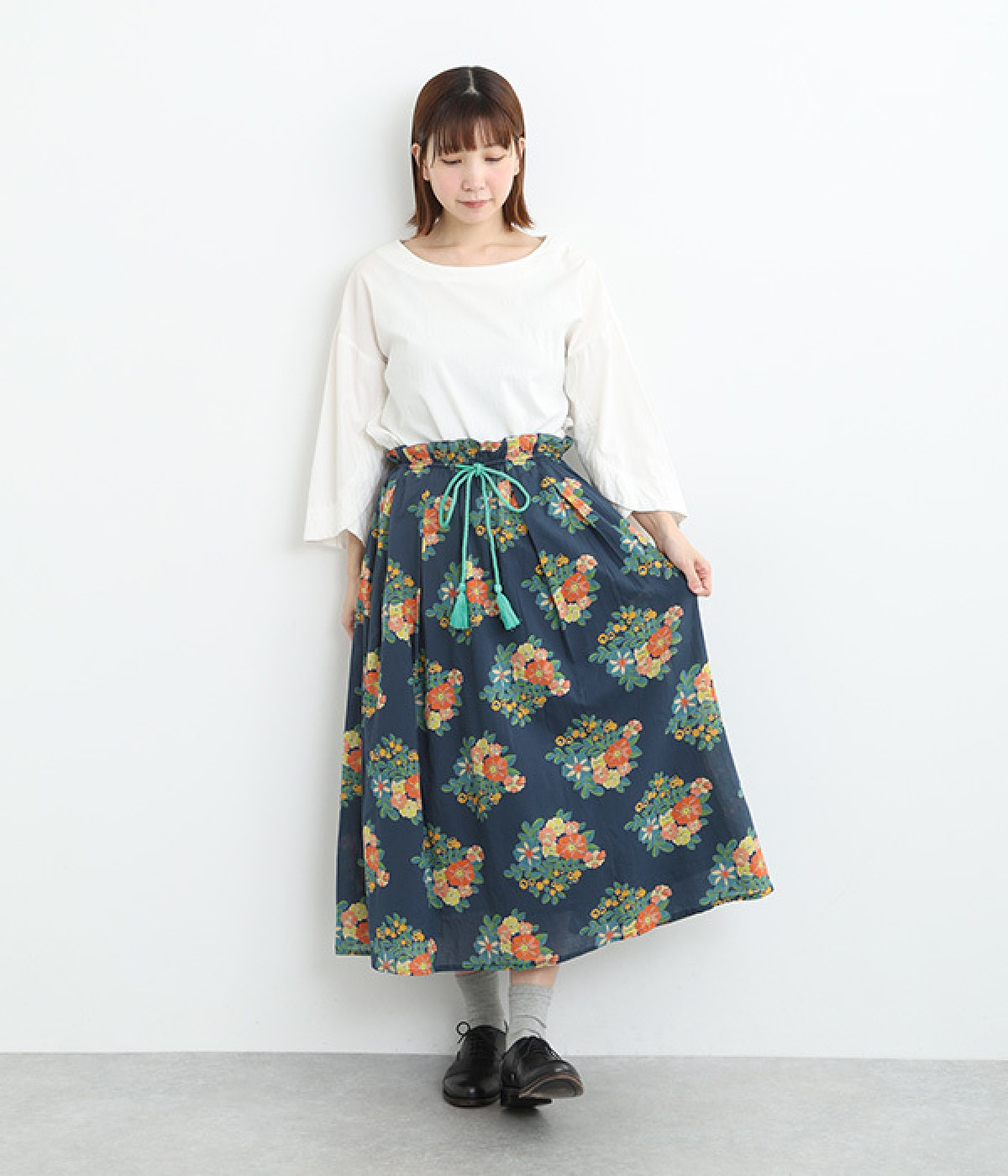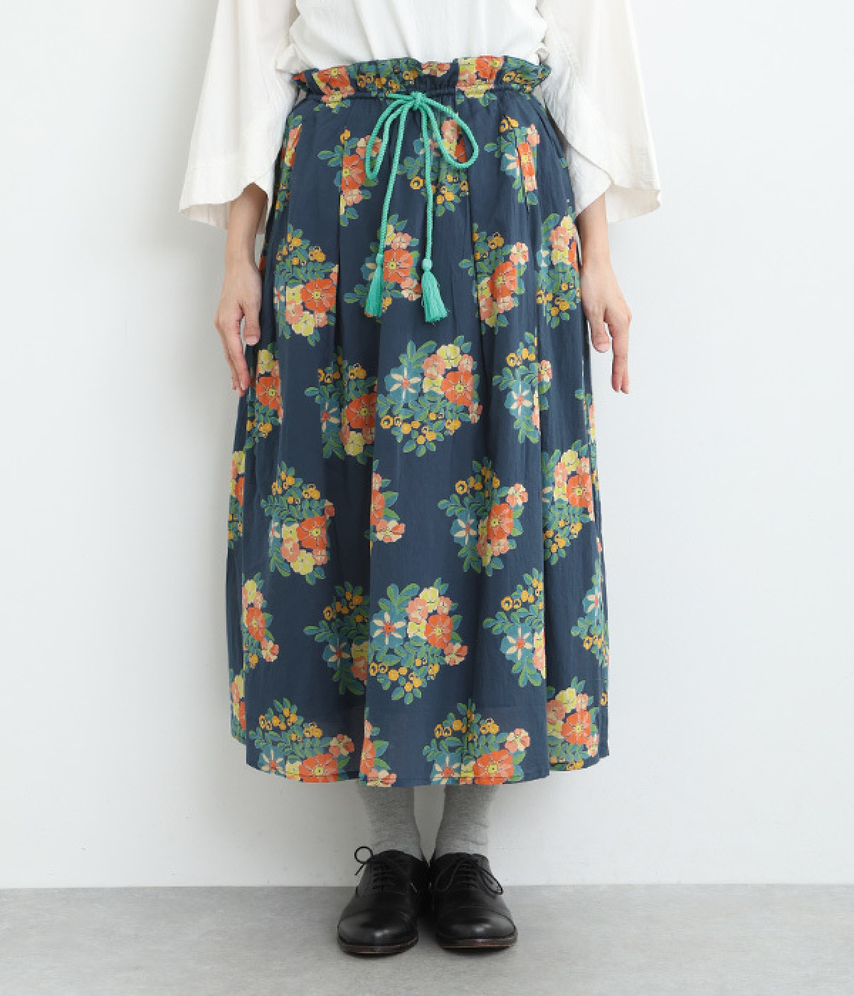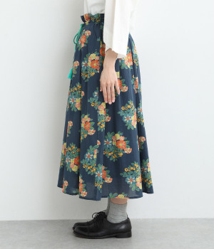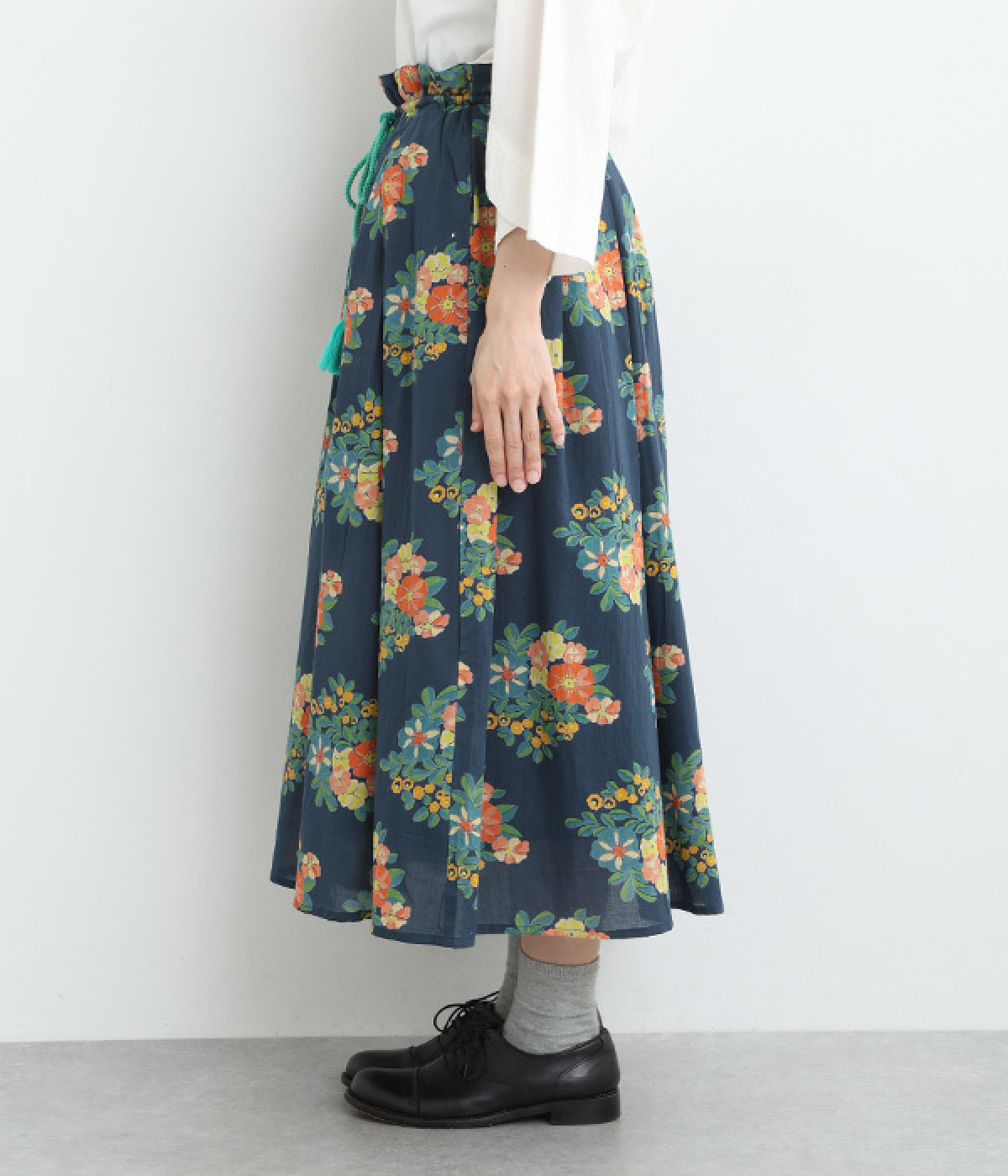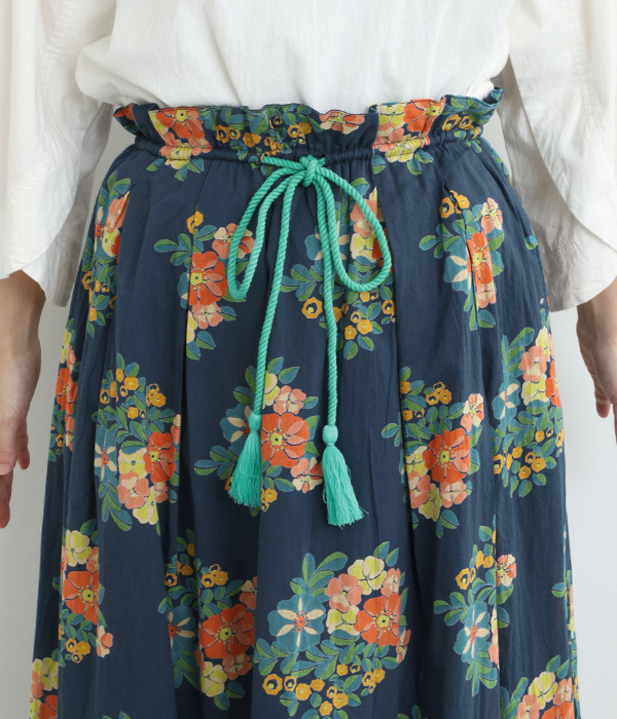 調整紐のタッセルやベルト部分のフリル仕様が大人かわいい印象を与える、クラシカルなフレアスカート。スタイリングのポイントになる分量感のあるシルエットで、トップスインの着こなしも◎ウエストはぐるりとゴムが入っています。