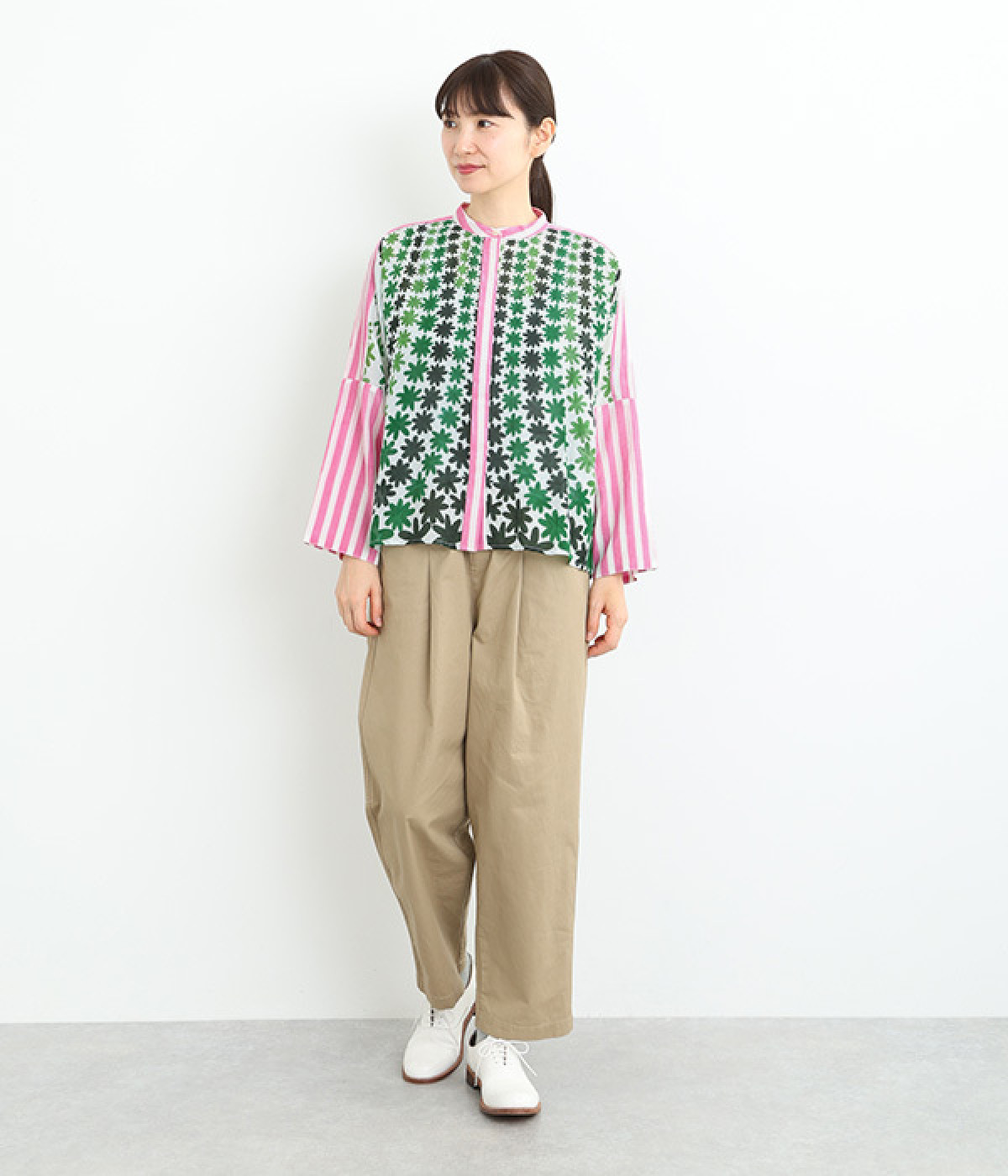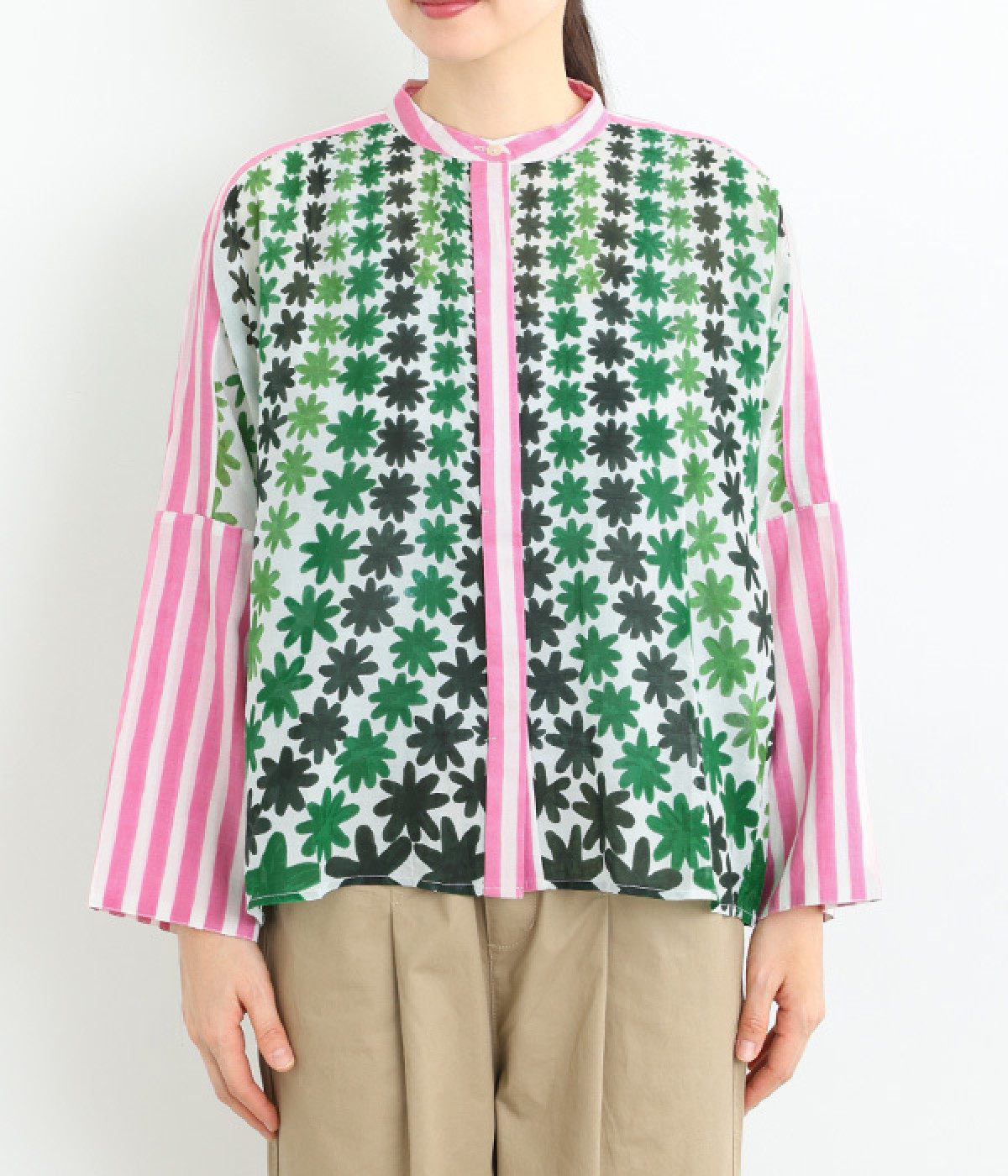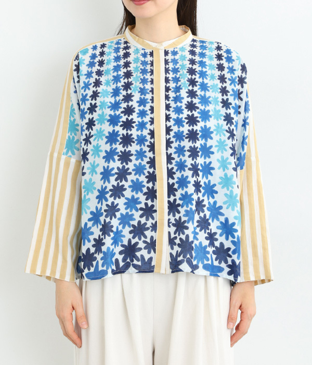 フラワー柄の雰囲気にマッチした、ややゆとりのあるシルエット。ストライプ生地部分は二重仕立てにするなど、透け感にも変化をつけています。着こなしのポイントになる一枚で、前あき羽織りスタイルも◎