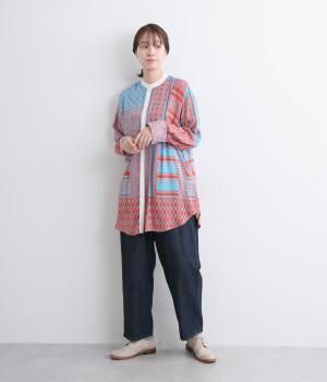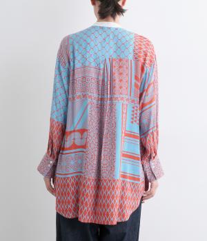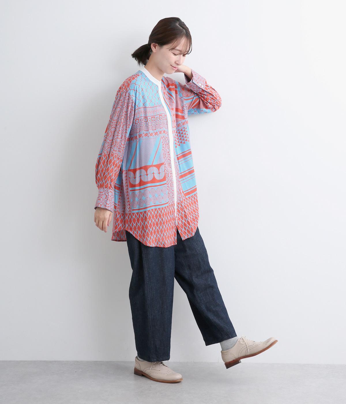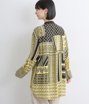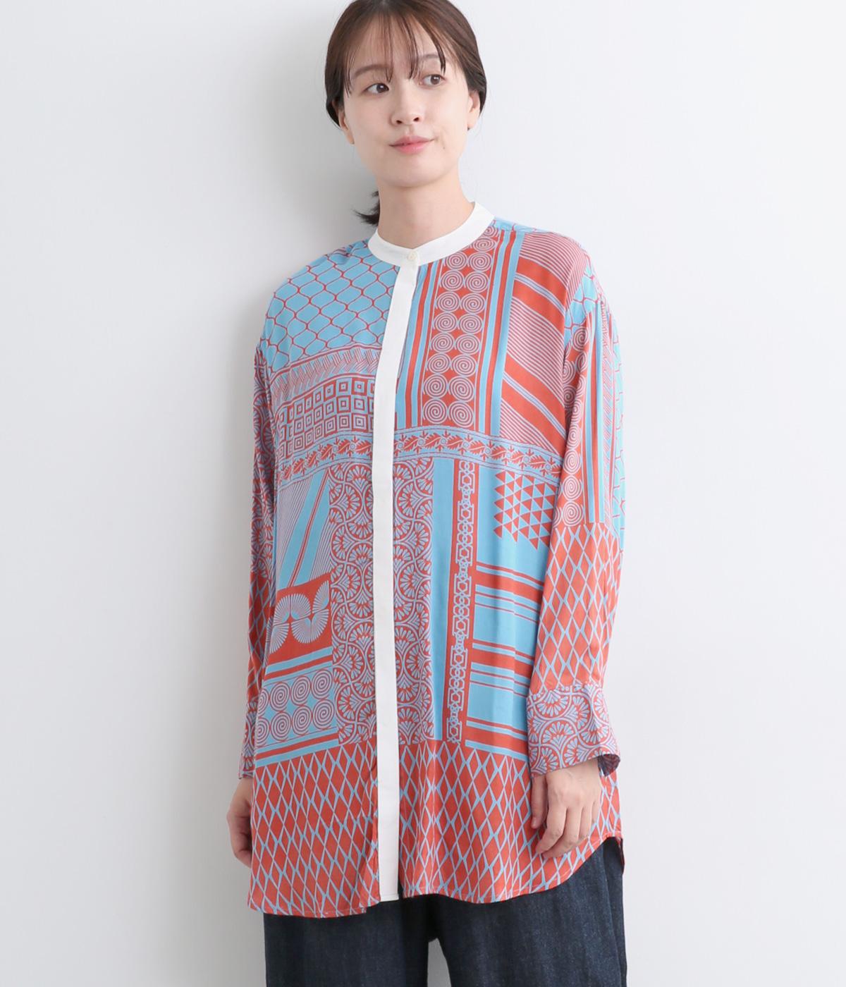 個性的なデザインが目を引くプリントブラウス。ヒップがすっぽり隠れる丈感なので、体のラインを拾いにくく、着まわしがききます。比翼仕立てでボタンが隠れ、すっきりとフォーマルな印象。シンプルなパンツと相性抜群です。