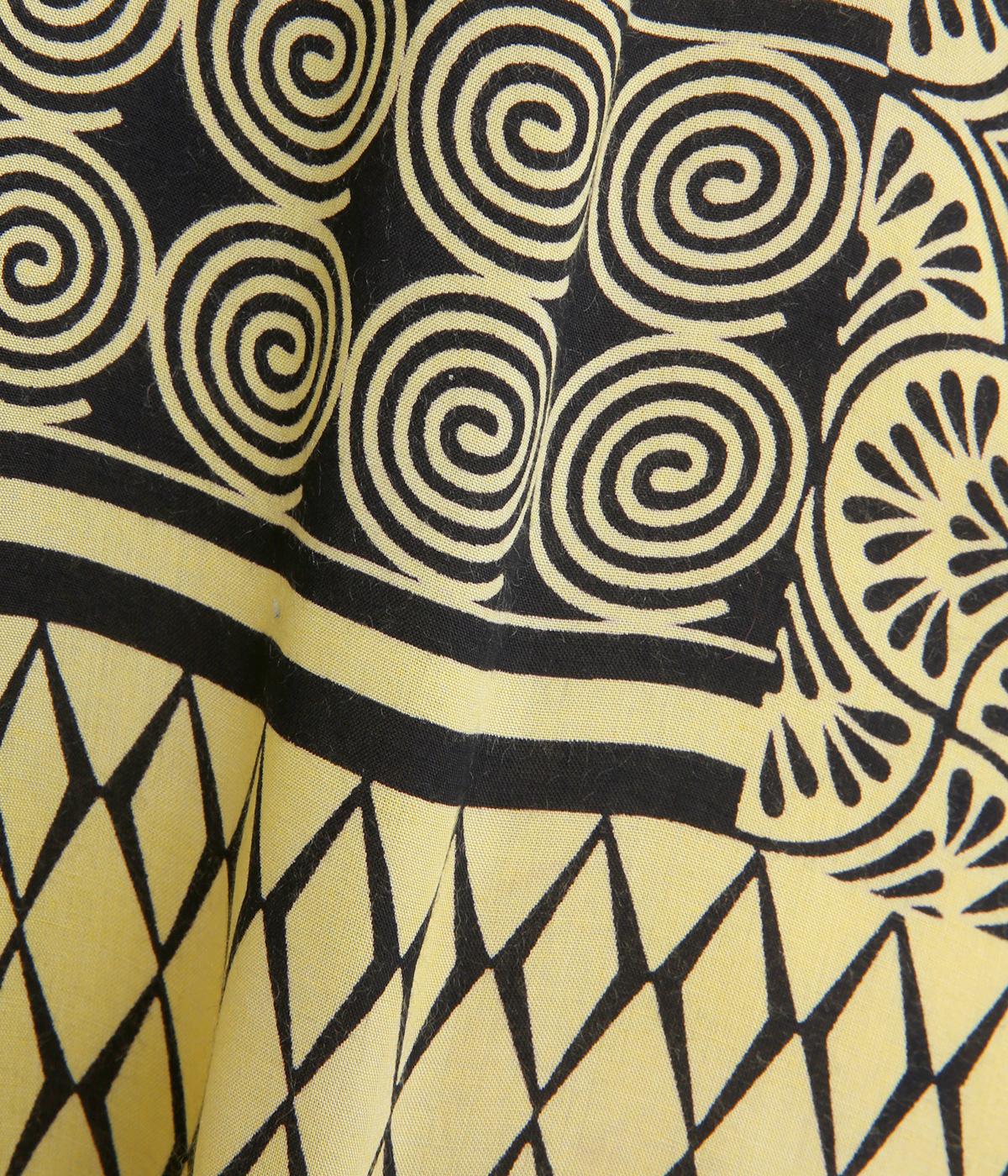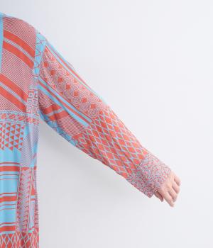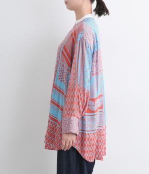 通気性に優れ、しなやかな肌ざわりが魅力的なレーヨンを使用しています。陶器のような芸術的な印象を与えるプリントと、とろみのある素材感がマッチ。薄手でゆったりしています。