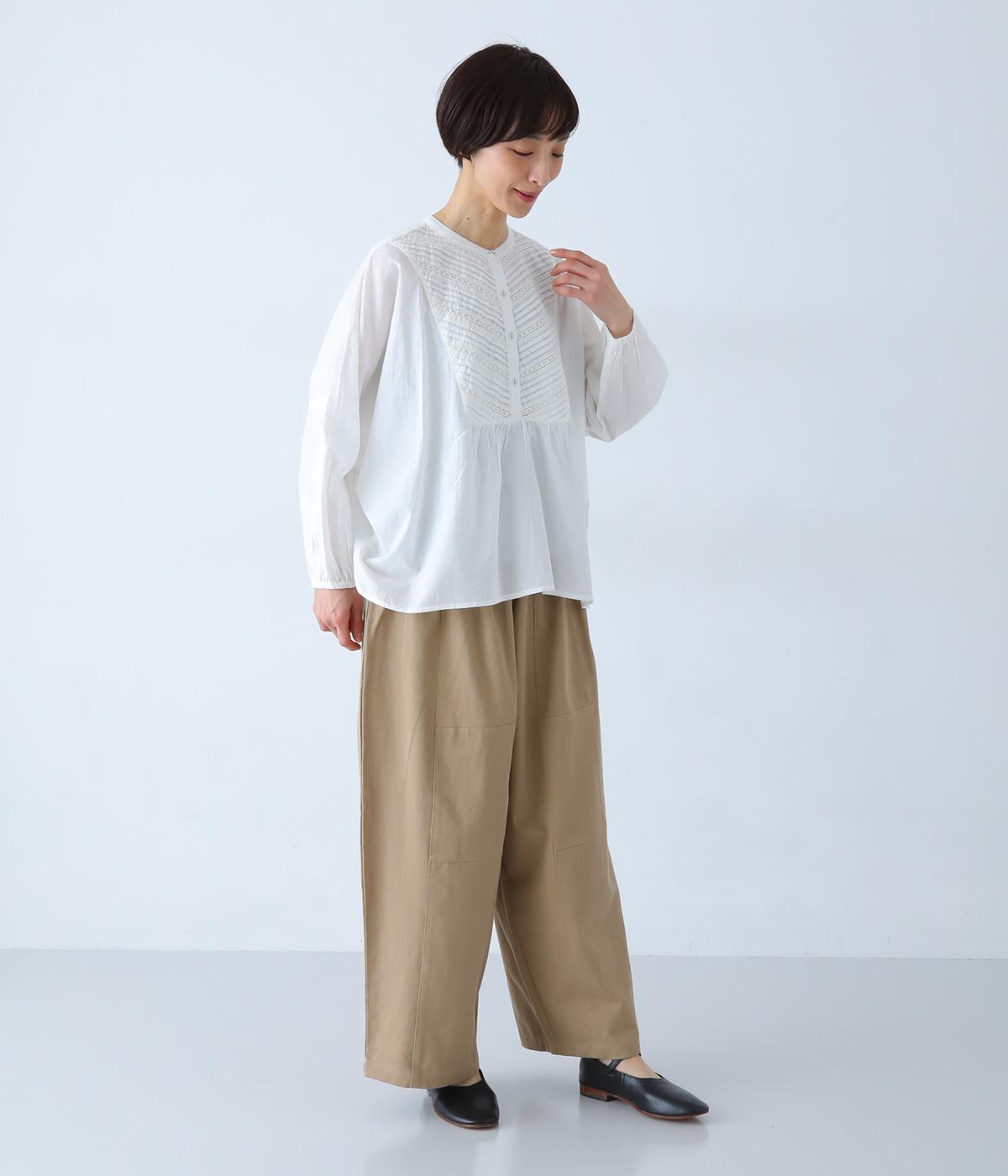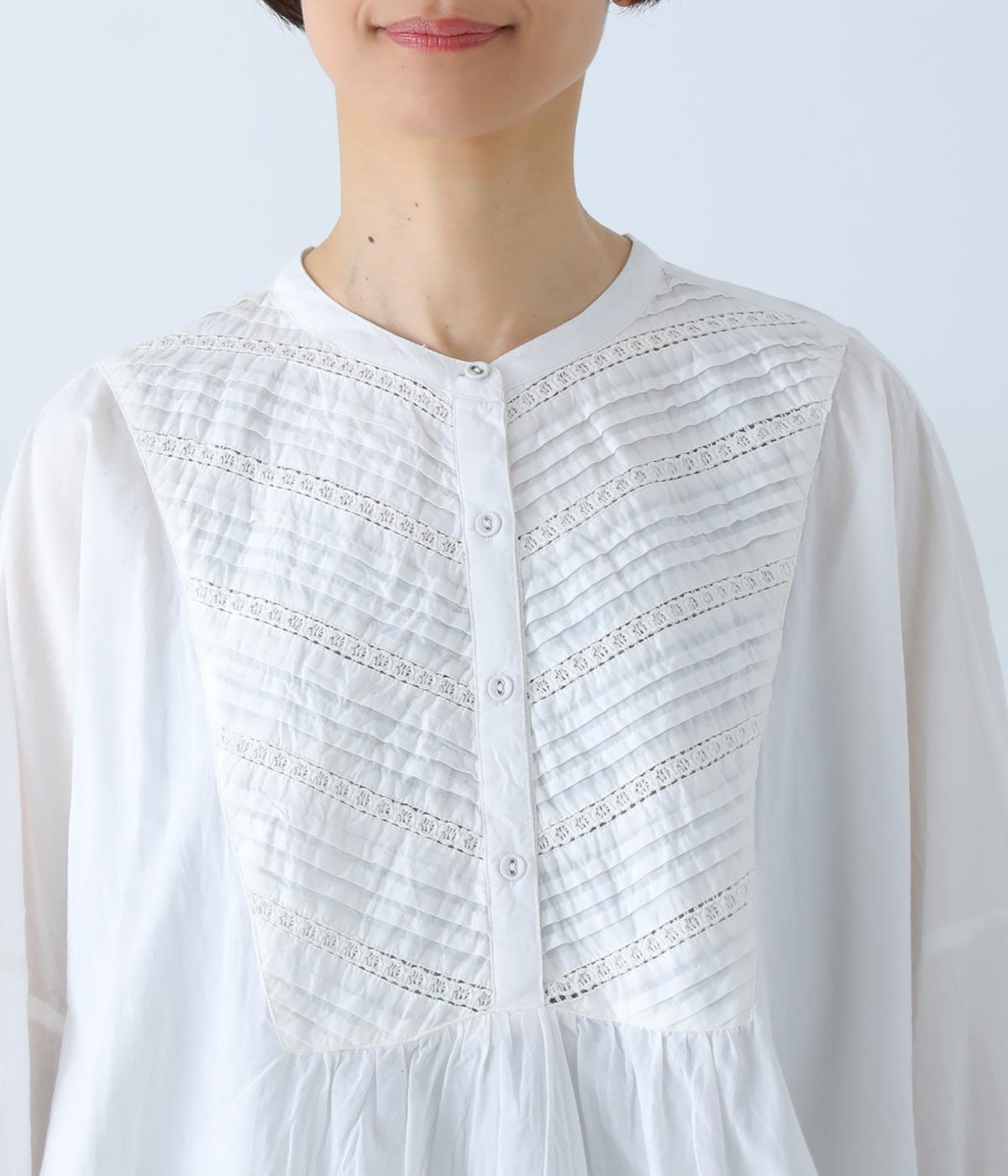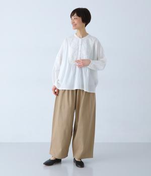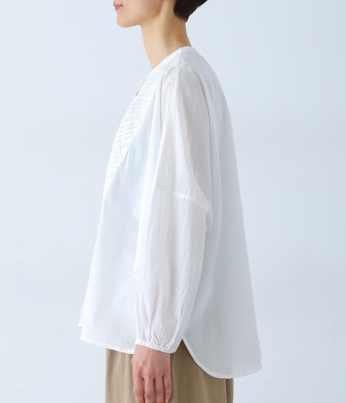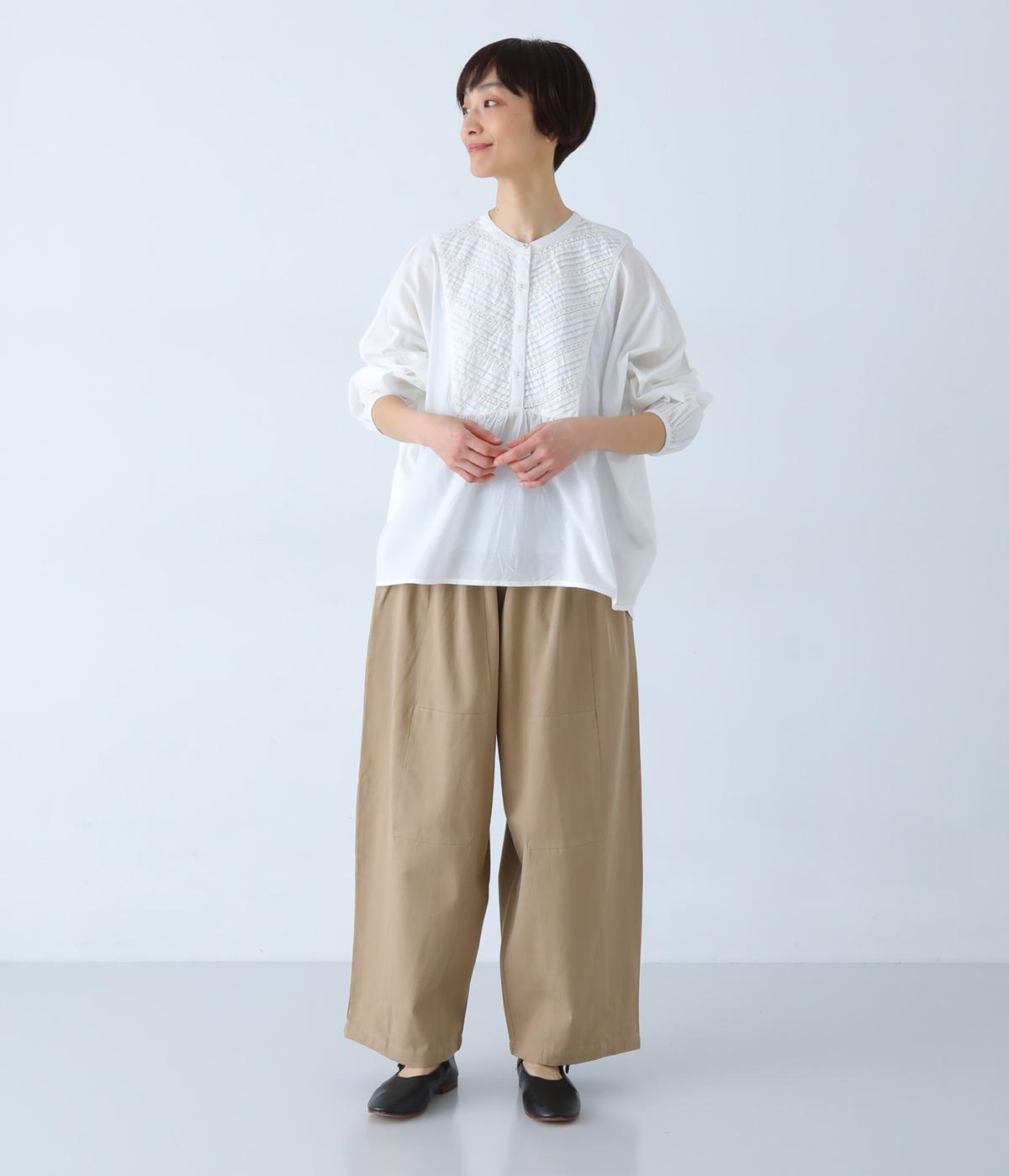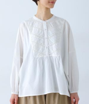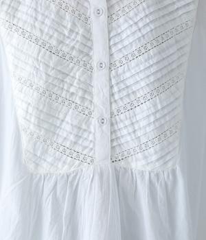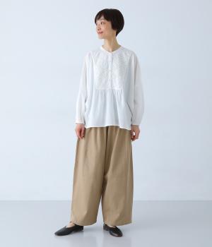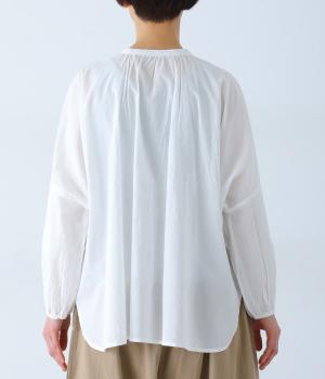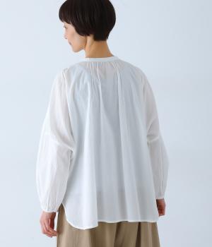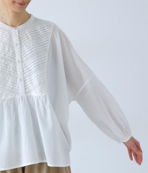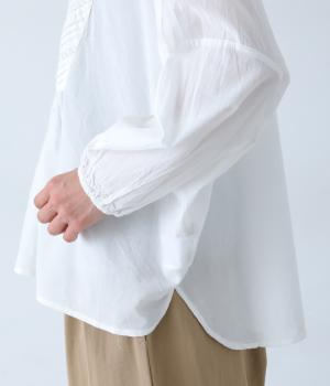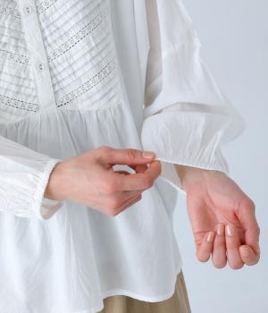 胸元のヨーク部分に細かなピンタックとレースをたっぷりと施し、上品で繊細な表情に仕上げました。ゆったりとしたシルエットながら、裾のスリットがほどよい抜け感をプラス。袖口はゴム仕様なので、軽くまくった着こなしのアレンジもたのしめます。