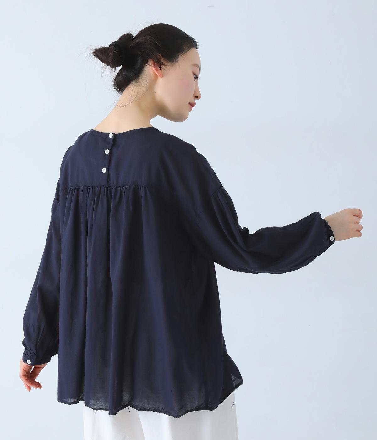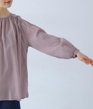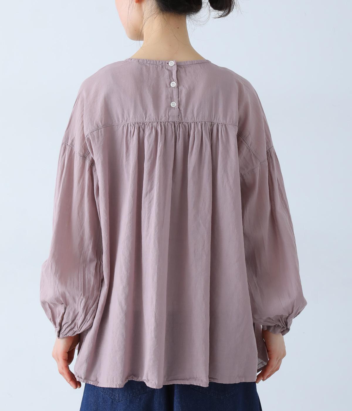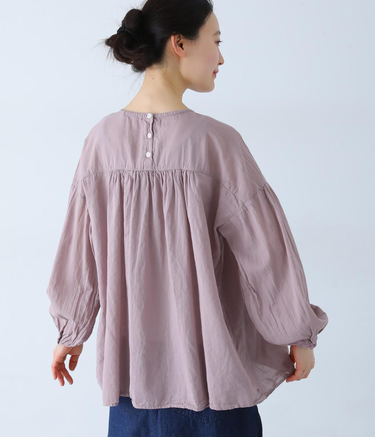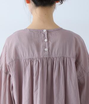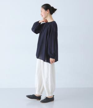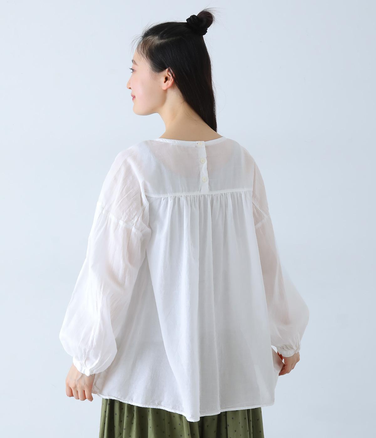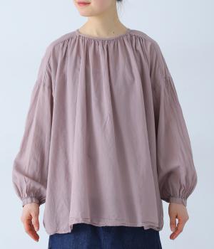 襟ぐりと切り替え部分にたっぷりとギャザーを寄せた、やわらかな立体感が特徴のブラウスです。ゆったりとした身幅が自然なフレアシルエットをつくり、軽やかな表情を見せてくれます。うしろはボタン仕様で、着脱もスムーズ。生地の透け感を活かした、インナーとのレイヤードもたのしめる一枚です。