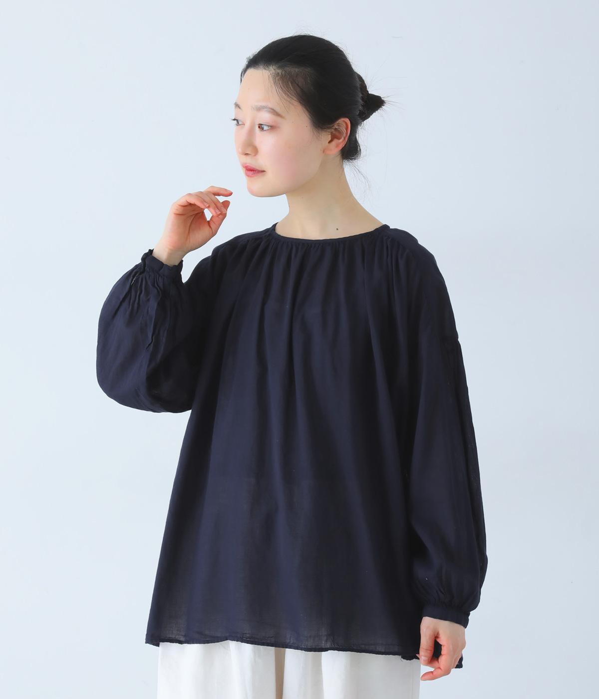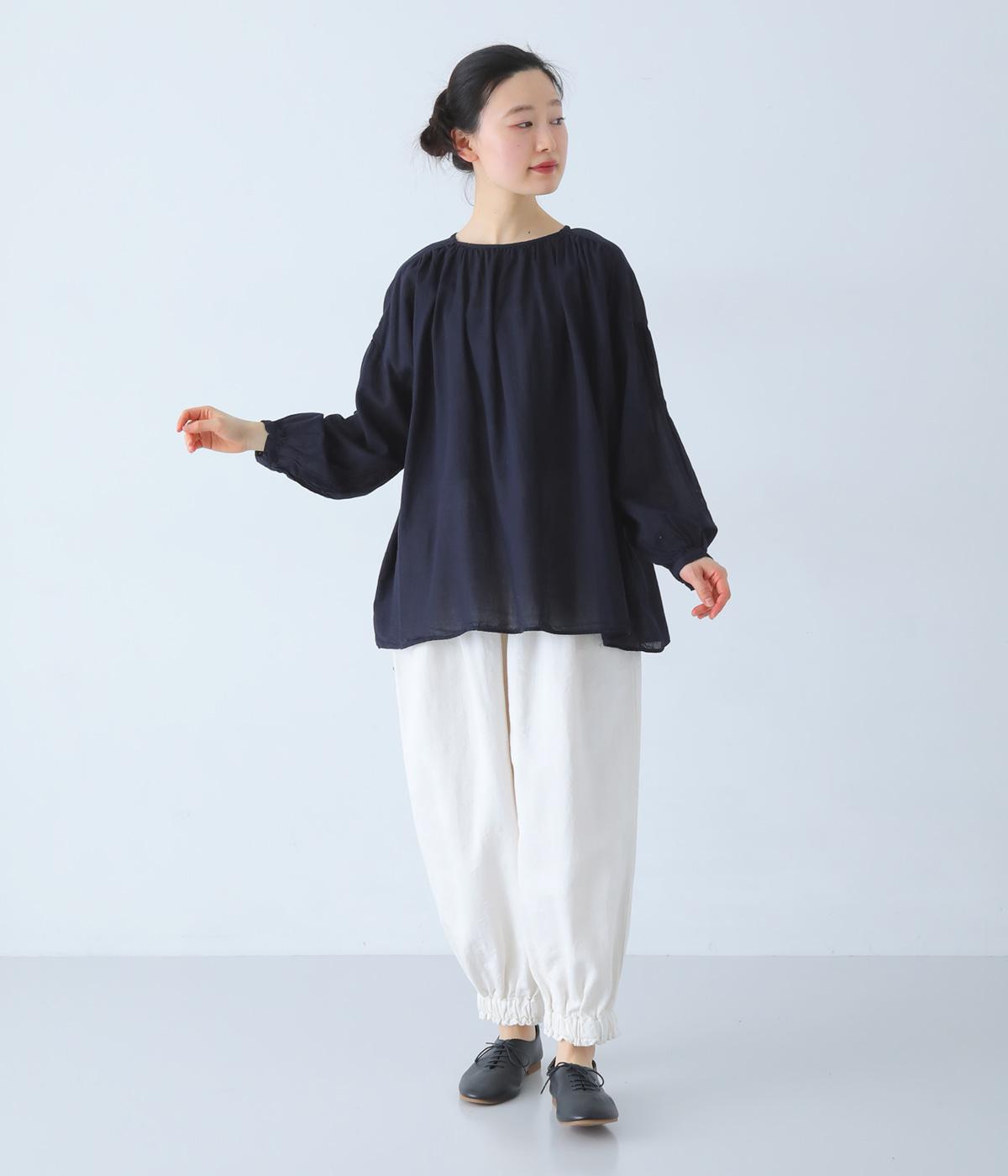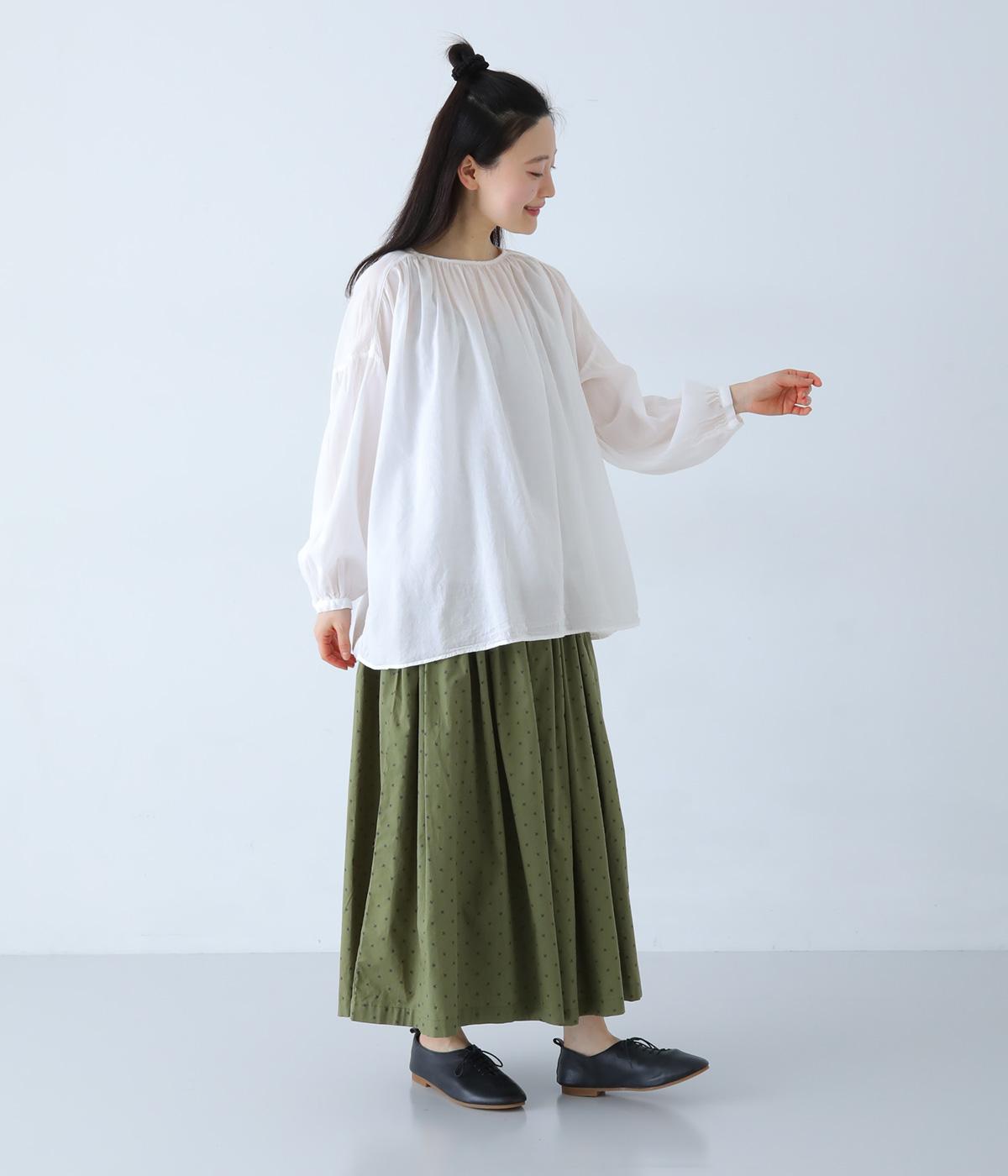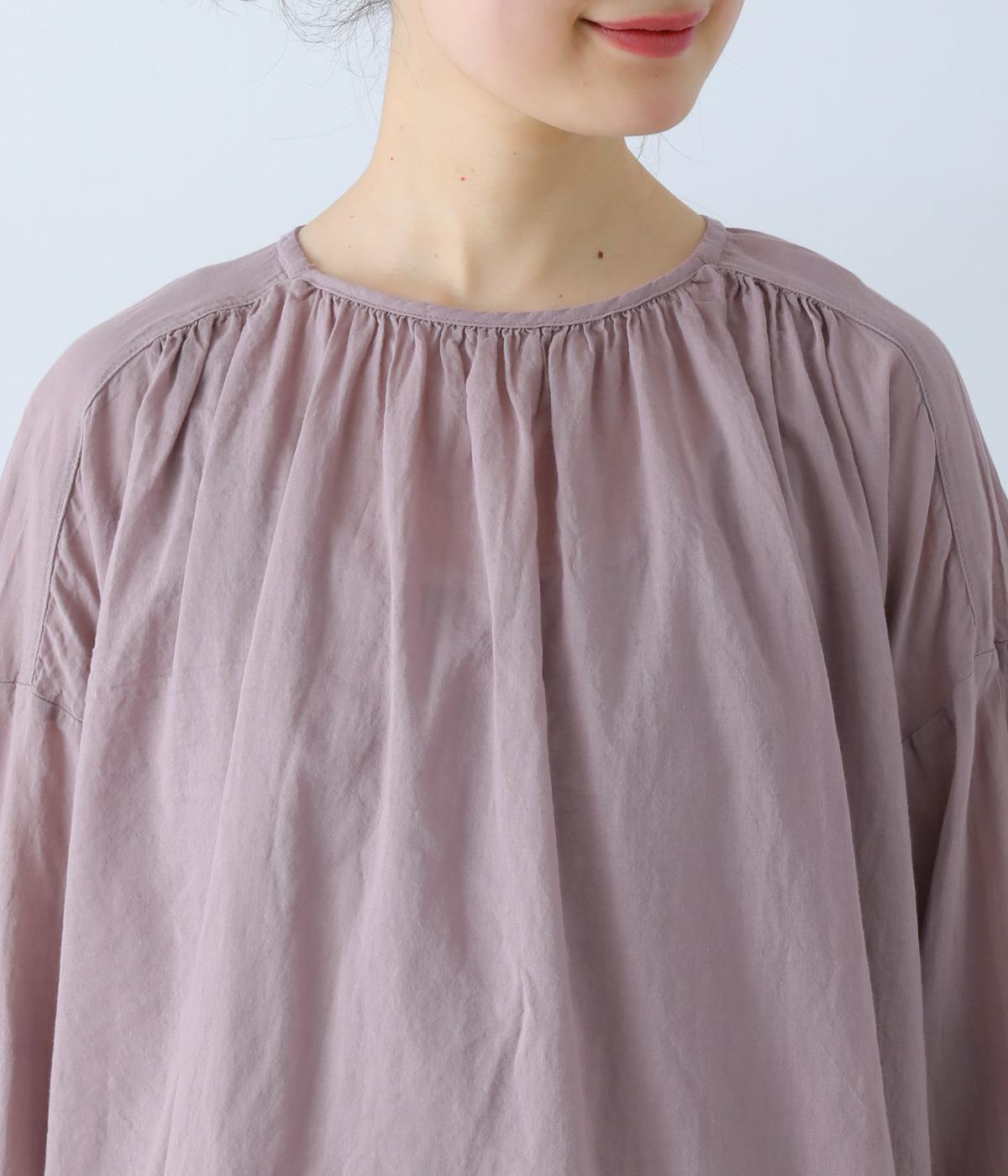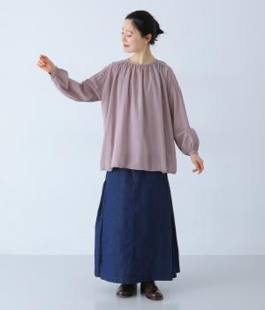 襟ぐりと切り替え部分にたっぷりとギャザーを寄せた、やわらかな立体感が特徴のブラウスです。ゆったりとした身幅が自然なフレアシルエットをつくり、軽やかな表情を見せてくれます。うしろはボタン仕様で、着脱もスムーズ。生地の透け感を活かした、インナーとのレイヤードもたのしめる一枚です。