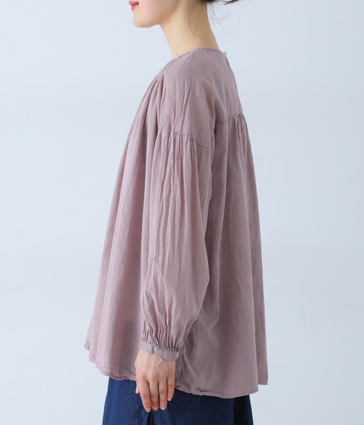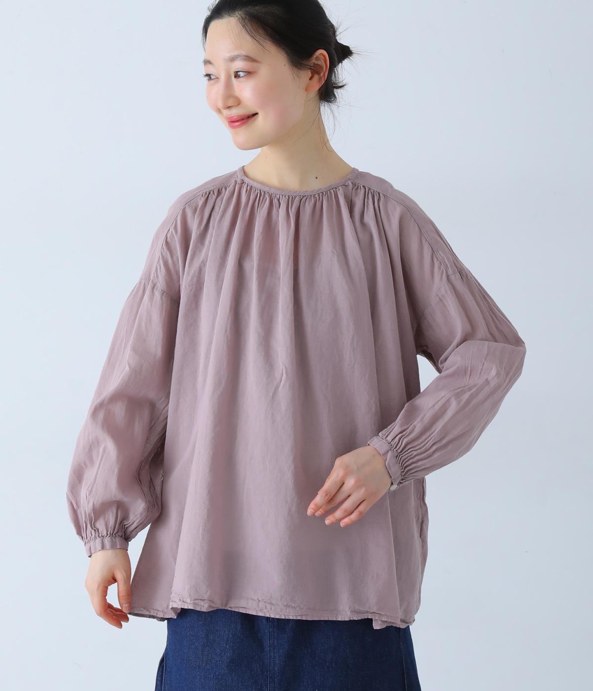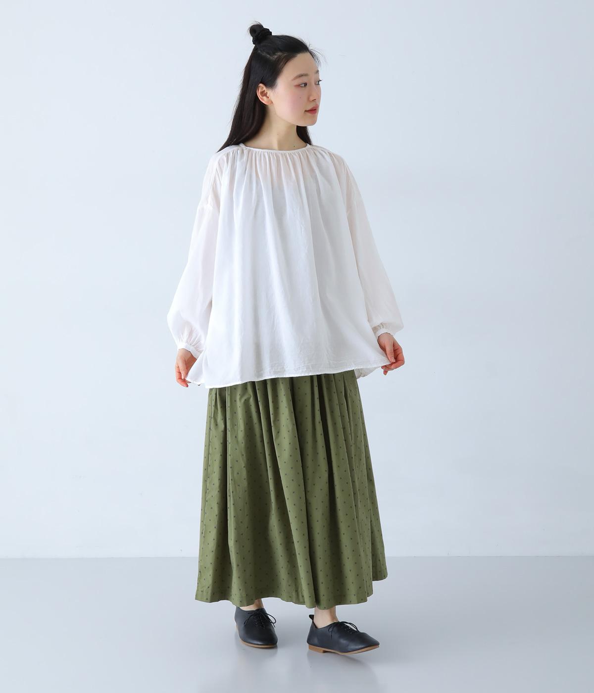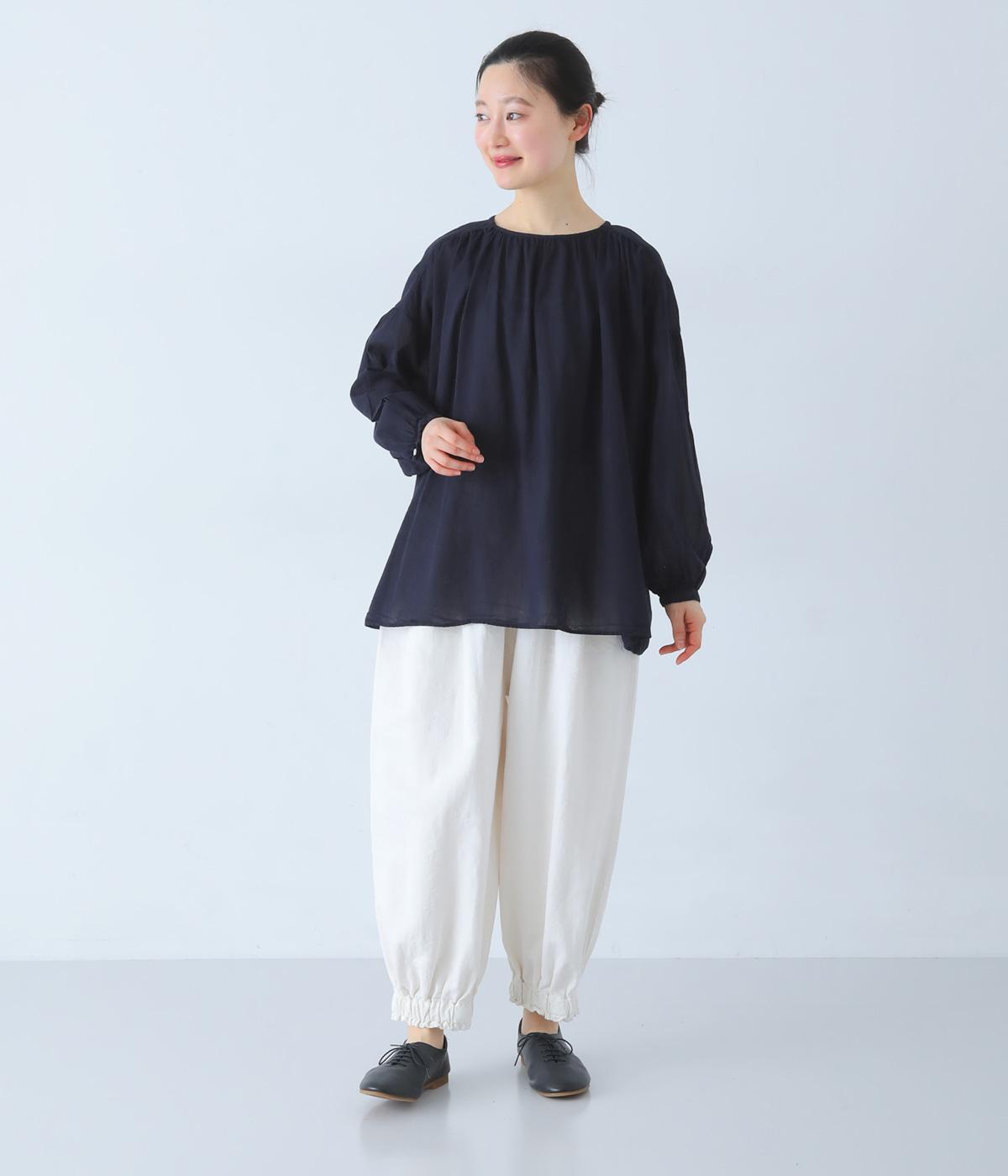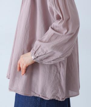 襟ぐりと切り替え部分にたっぷりとギャザーを寄せた、やわらかな立体感が特徴のブラウスです。ゆったりとした身幅が自然なフレアシルエットをつくり、軽やかな表情を見せてくれます。うしろはボタン仕様で、着脱もスムーズ。生地の透け感を活かした、インナーとのレイヤードもたのしめる一枚です。