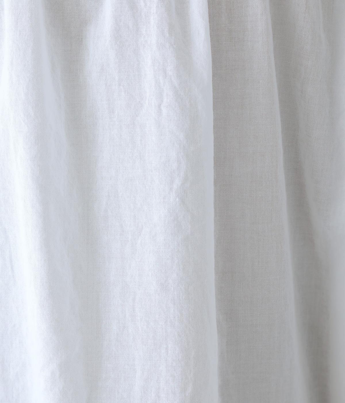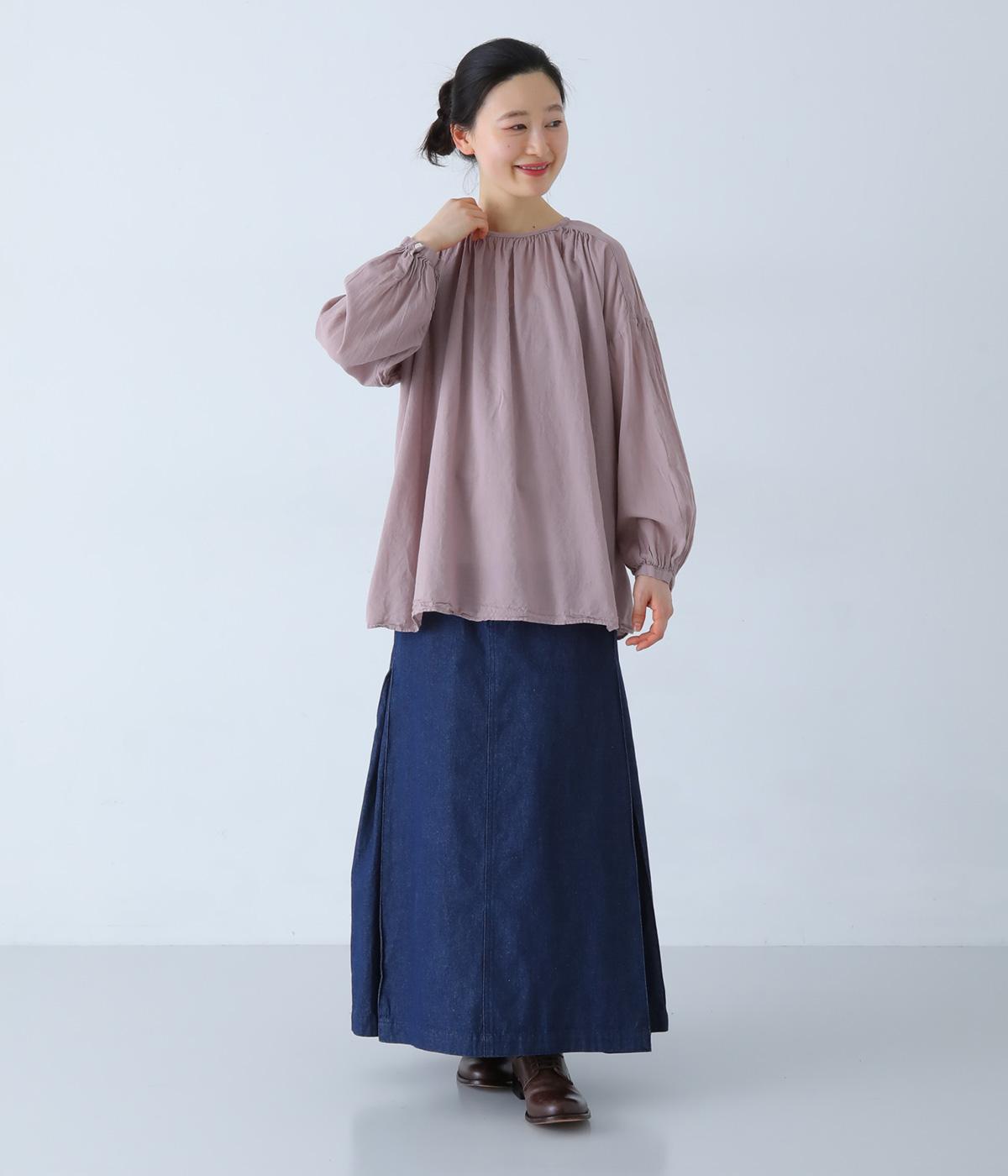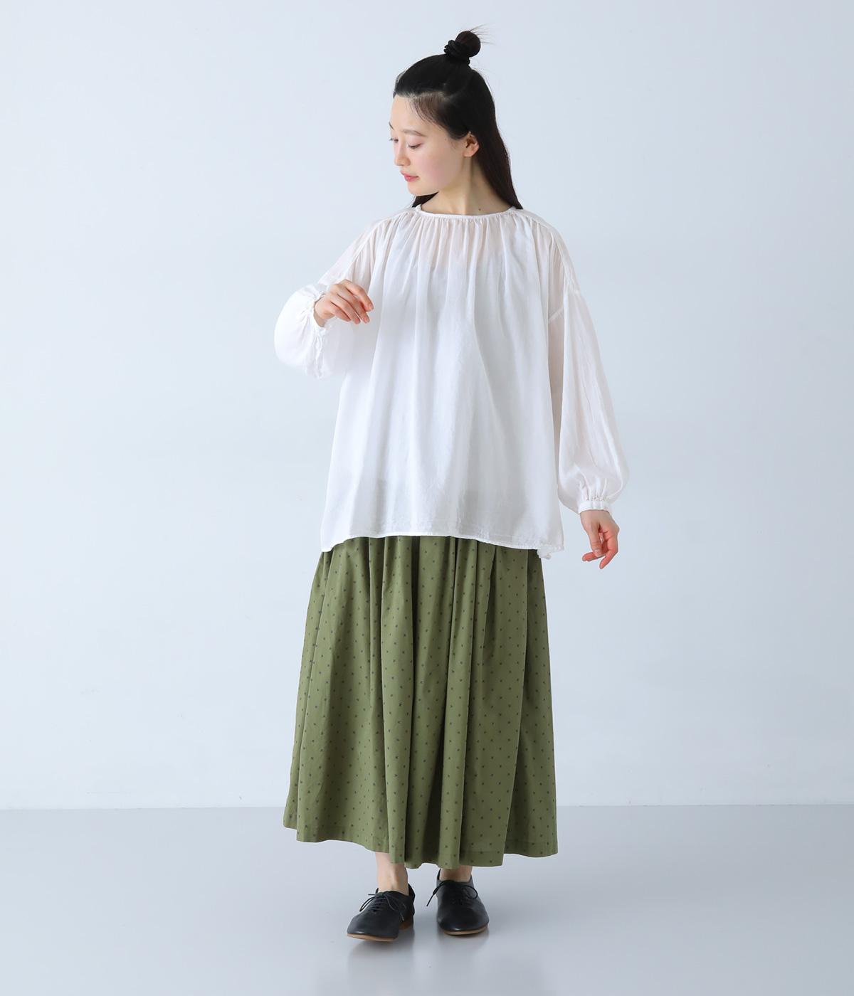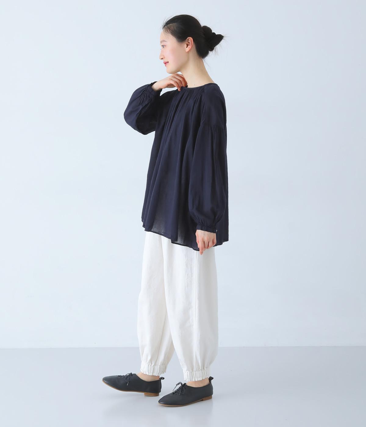 襟ぐりと切り替え部分にたっぷりとギャザーを寄せた、やわらかな立体感が特徴のブラウスです。ゆったりとした身幅が自然なフレアシルエットをつくり、軽やかな表情を見せてくれます。うしろはボタン仕様で、着脱もスムーズ。生地の透け感を活かした、インナーとのレイヤードもたのしめる一枚です。