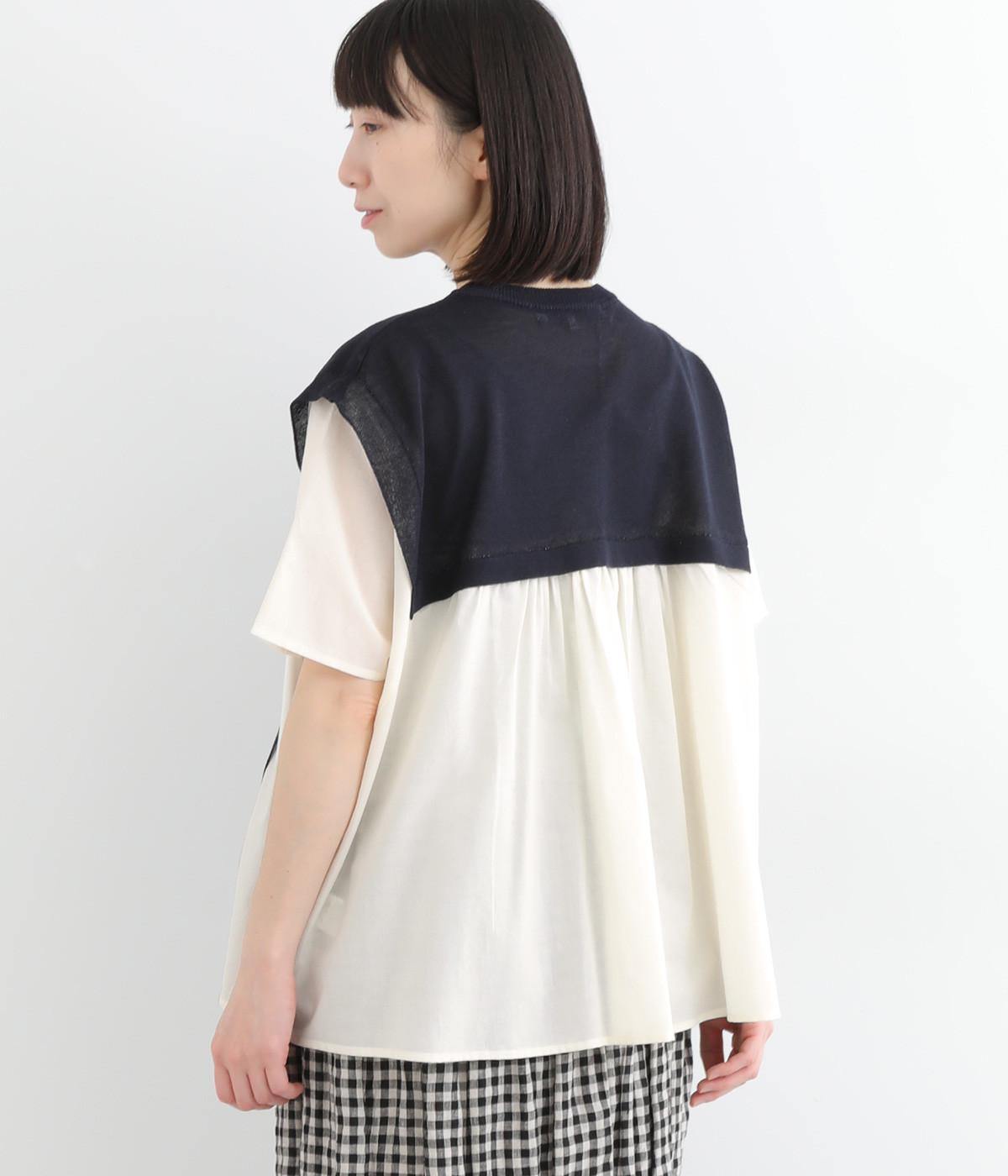 フロントにニットベストを重ねたようなドッキングデザインで、一枚で華やかになるプルオーバーです。リラックスした着心地で、二の腕も自然と隠れるサイジング。ボリュームが出すぎないので、ロングスカートやワイドパンツとの相性も◎。