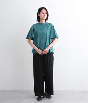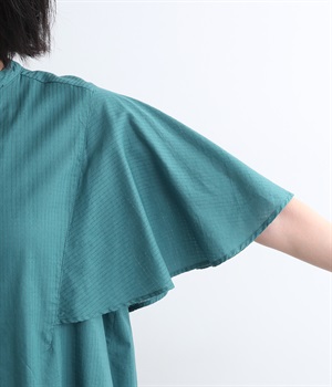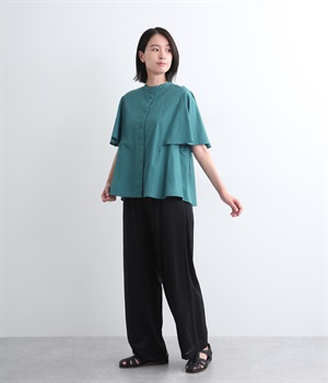 スリーブレスに生地を重ねてベルスリーブのように見せた、肩まわりの華やかなデザインが特徴的。身頃もゆるやかなフレアシルエットでシンプルながらも着映えします。前あきタイプで羽織りスタイルも◎。