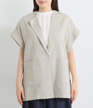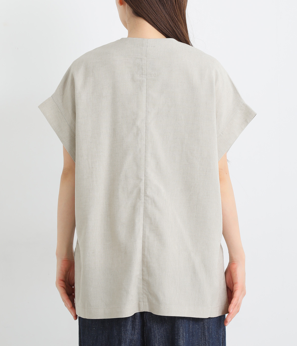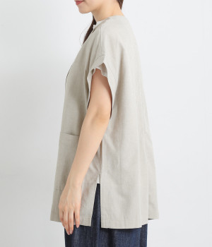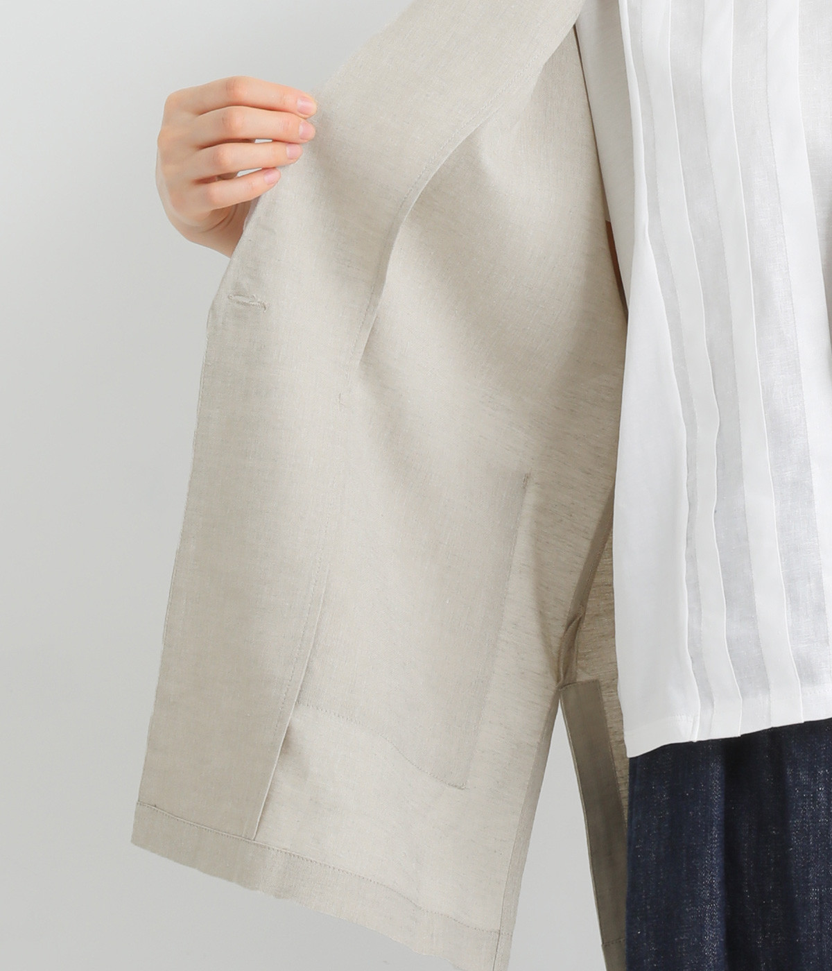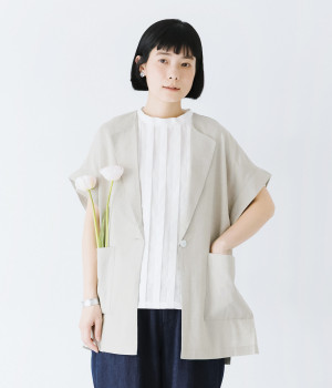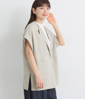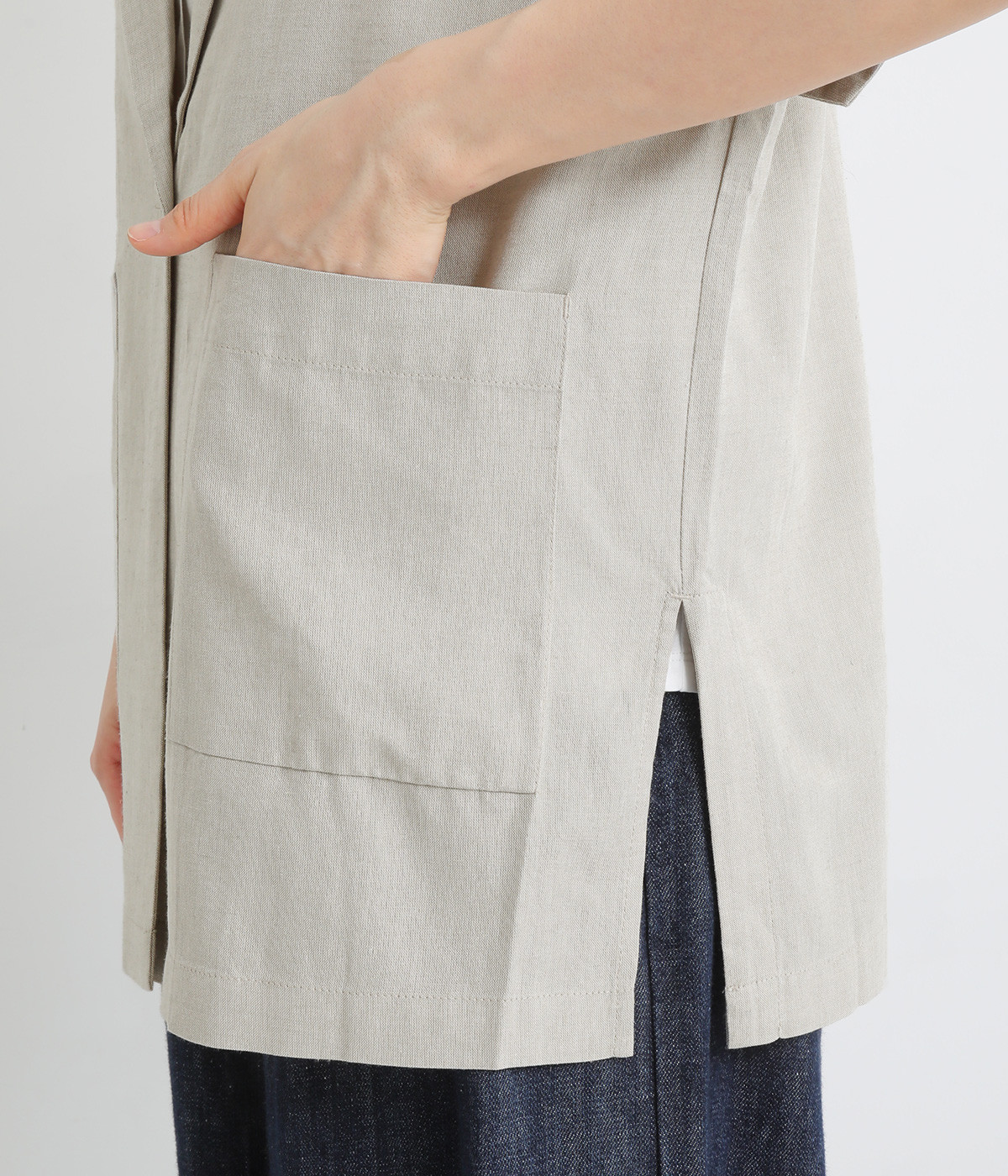 襟をつけた深めのネックラインが顔周りをハンサムに演出。抜け感を出すサイドスリットを入れ、着心地が軽く風通しのいいゆったりシルエットに。ヒップ周りまでかかる長めの着丈になっているので、コーディネートをすっきりとまとめます。