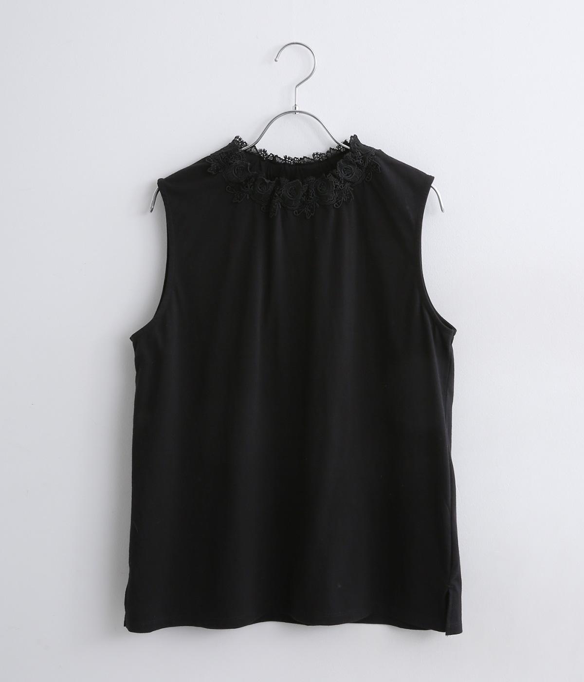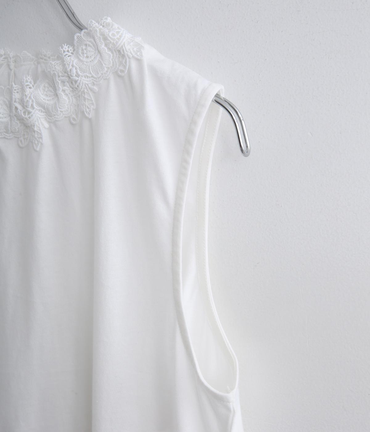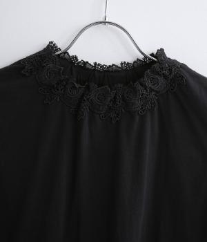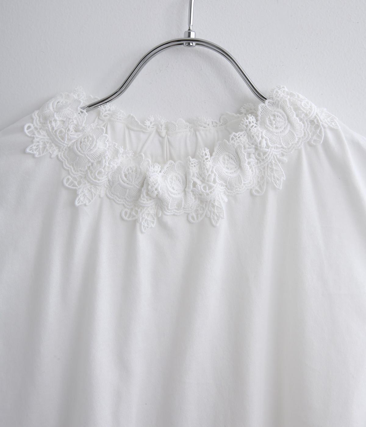 伸びのよいやわらかな質感のコットン天竺素材をベースに、首元にはポリエステルのモチーフレースを使用しています。