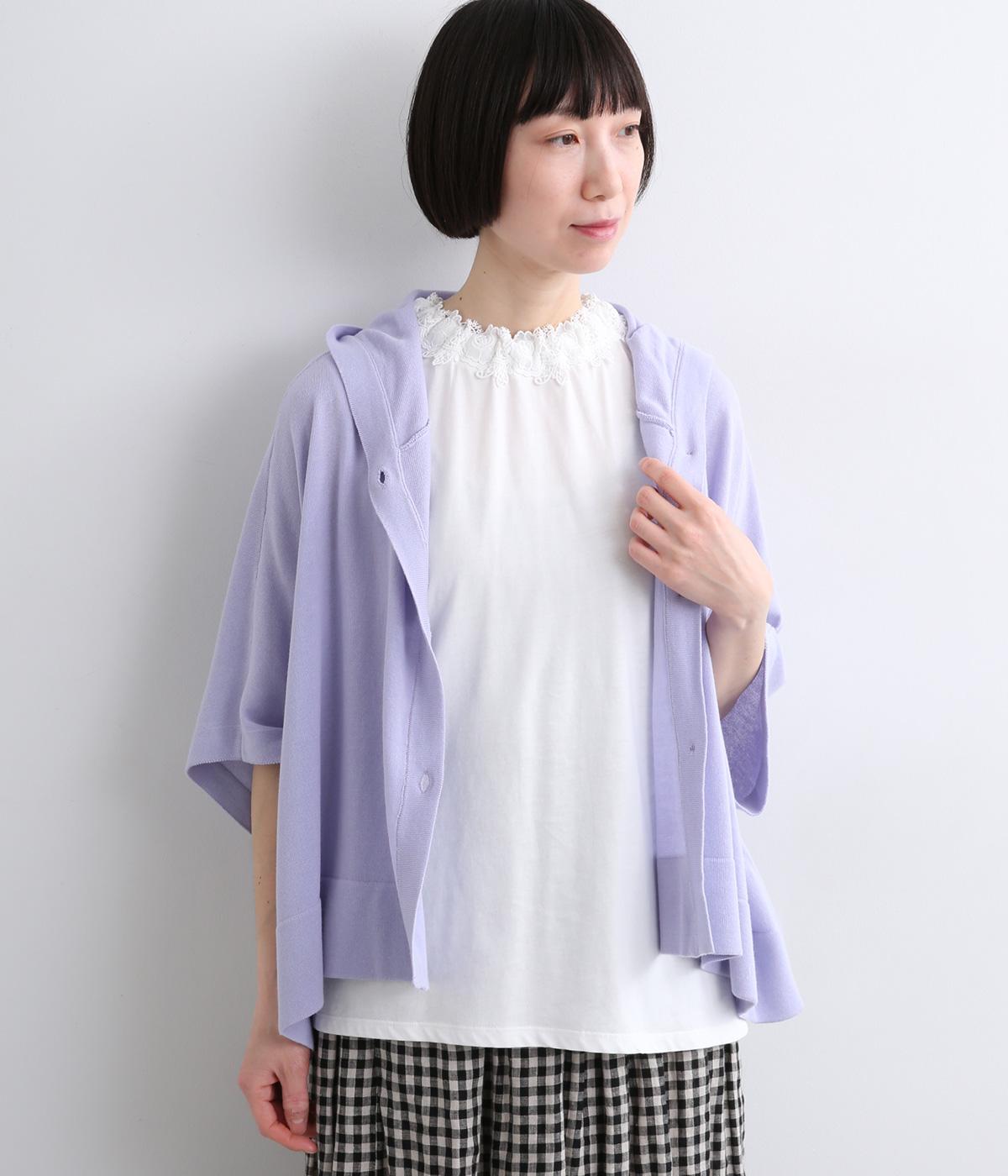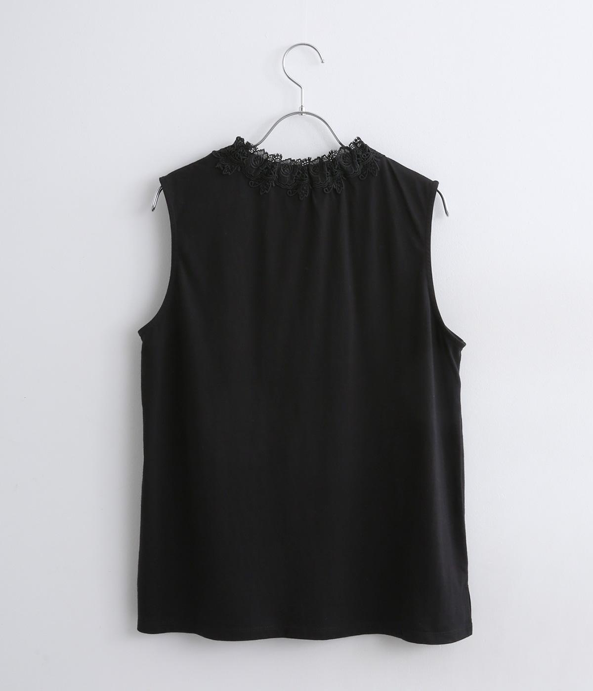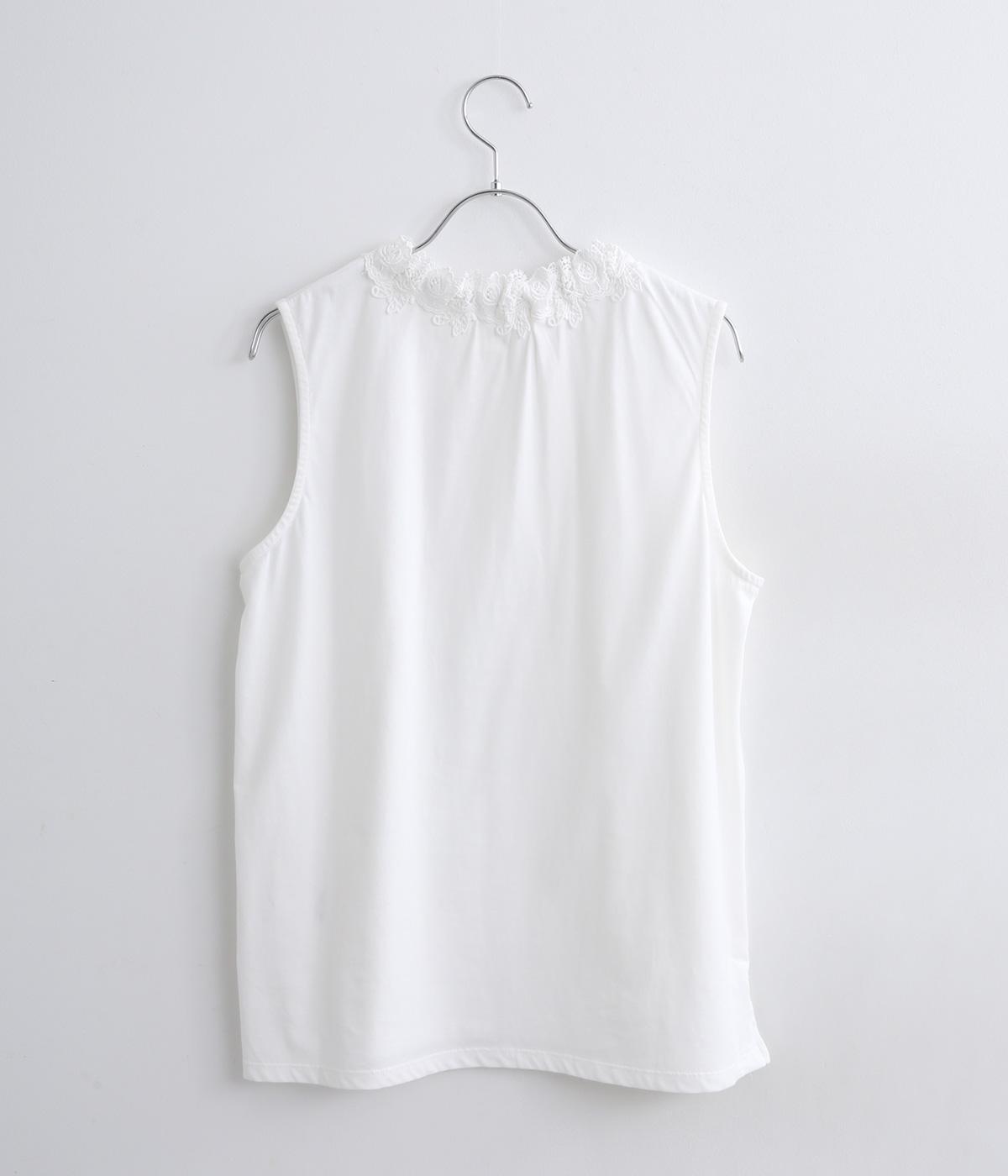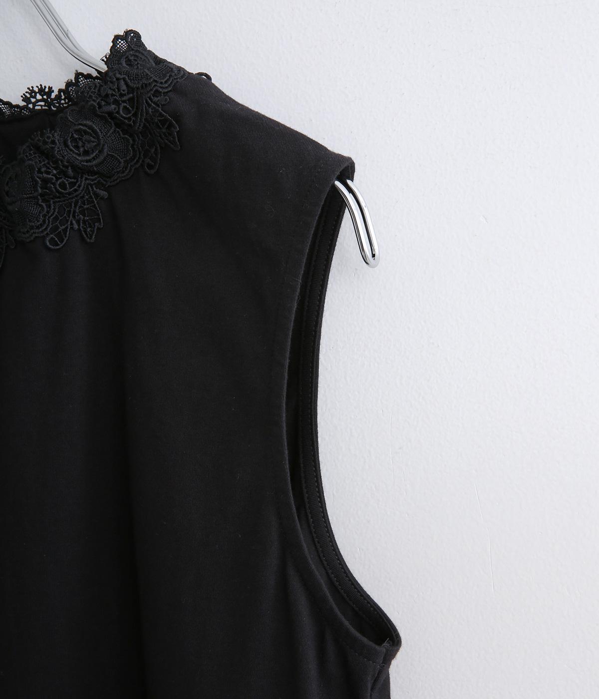 伸びのよいやわらかな質感のコットン天竺素材をベースに、首元にはポリエステルのモチーフレースを使用しています。